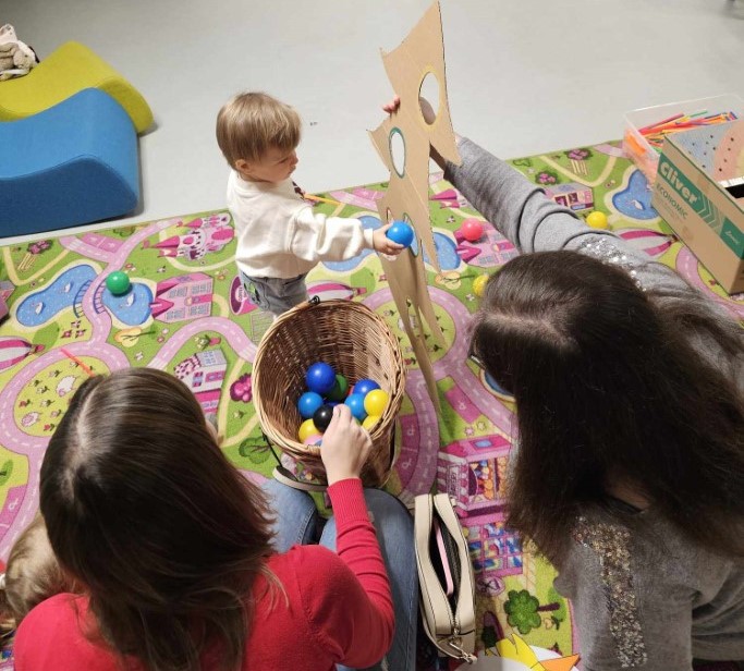 Następnie dzieci i rodzice wspólnie przystąpili do ozdabiania bombek i choinek. Kolorowe ozdoby, błyszczące elementy i różnorodne materiały plastyczne pozwoliły na stworzenie wyjątkowych dekoracji, które z pewnością upiększą domowe świąteczne drzewka. Na zakończenie zajęć każdy mógł udekorować choinkę kawałkami bibuły, co było nie tylko twórczym wyzwaniem, ale i świetną zabawą.