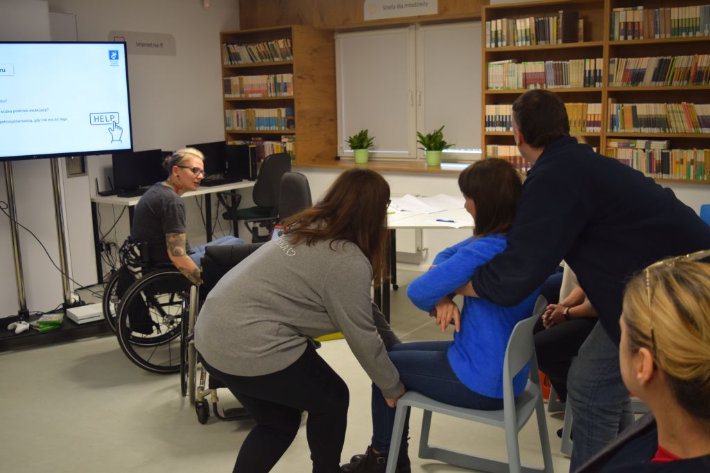 Omówiliśmy również dostosowanie dróg ewakuacyjnych, ich oznaczeń oraz mieliśmy możliwość uczestniczyć w ewakuacji wcielając się w rolę osób z niepełnosprawnościami.