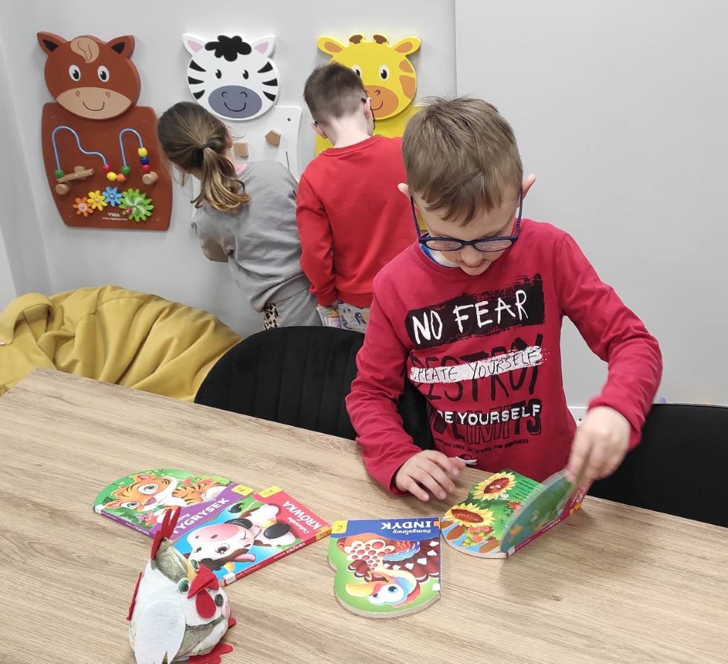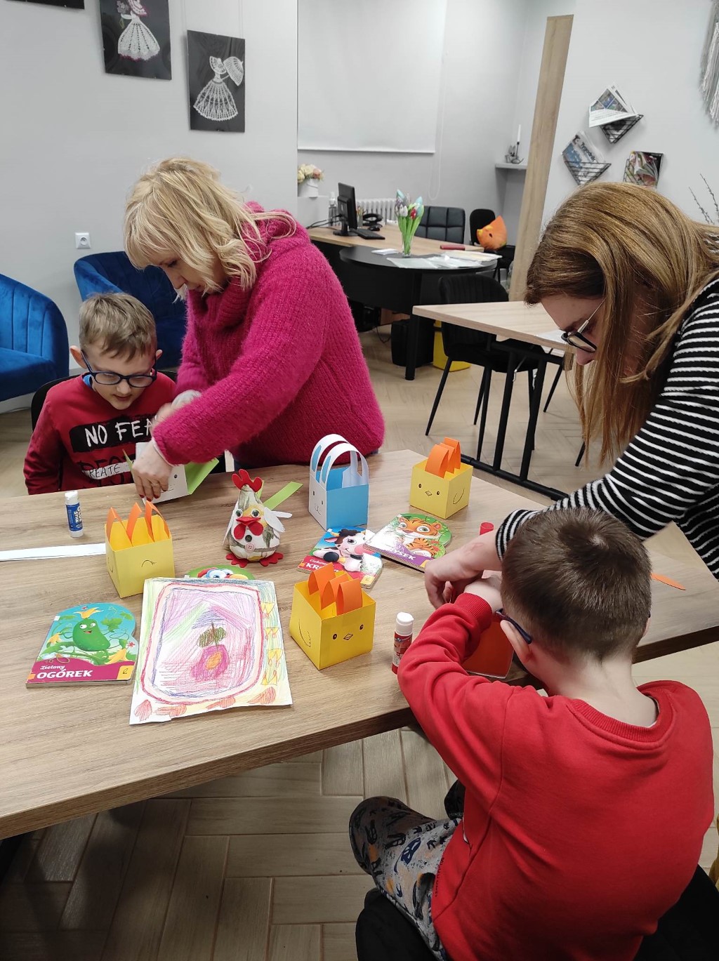1Wczoraj w Filii nr 1 Miejskiej Biblioteki Publicznej  rozpoczęliśmy cykl zajęć z dziećmi  w ramach  projektu "Kultura bez barier". Odwiedziła nas grupa przedszkolaków ze Specjalnego Ośrodka Szkolno-Wychowawczego. Tematem przewodnim były nadchodzące święta wielkanocne. Podczas zajęć dzieci wykonały koszyczki wielkanocne z papieru. W dalszej części spotkania dzieci uczestniczyły w przygotowanych grach: rzut do celu, Memory,  korzystały z tablic sensorycznych oraz przeglądały nowości książkowe dla najmłodszych czytelników. Zajęcia przebiegły w radosnej atmosferze. Dziękujemy dzieciom oraz wychowawcom za współpracę.