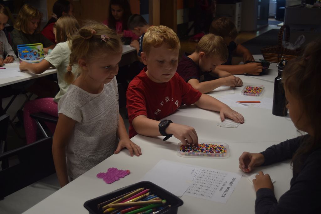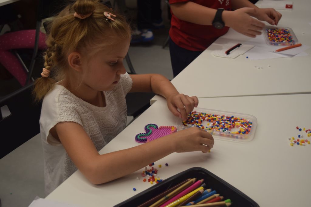 Druga część zajęć poświęcona była tworzeniu niepowtarzalnych wzorów przy użyciu koralików HAMA, których cechą charakterystyczną jest możliwość układania dowolnych kompozycji aż do momentu ich utrwalenia poprzez zazprasowanie.