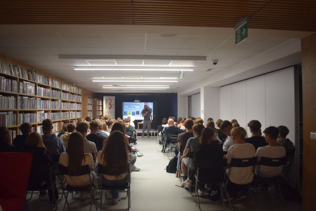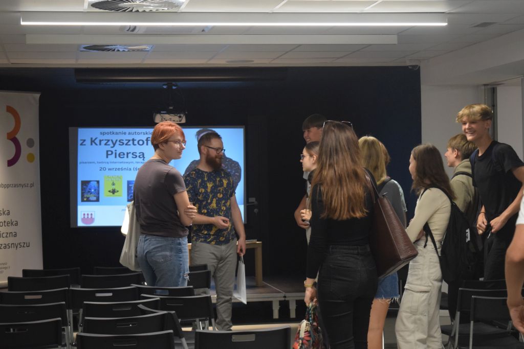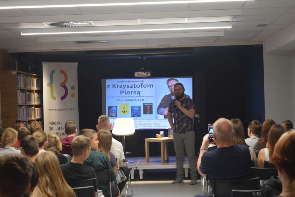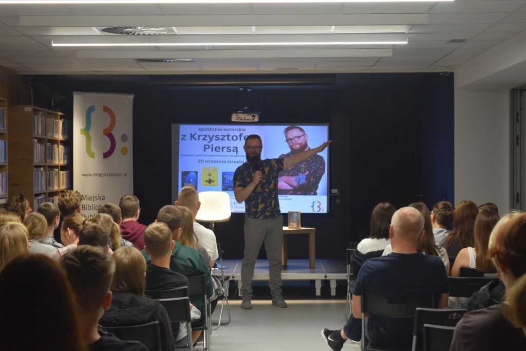 Krzysztof Piersa - autor m.in. takich poradników jak Komputerowy ćpun oraz Trener marzeń. Podczas spotkania z młodzieżą nasz gość szybko nawiązał kontakt z uczestnikami spotkania, rozmawiając o grach komputerowych, wirtualnym świecie, który czasem potrafi przysłonić i wykluczyć z tego prawdziwego. Ponadto poruszył problem hejtu oraz odpowiedzialności za treści, które zamieszczamy w sieci oraz w jaki sposób może mieć to wpływ na nasze późniejsze życie. Autor podkreślał jak ważne jest dążenie do spełniania swoich marzeń oraz odkrywanie własnych pasji.