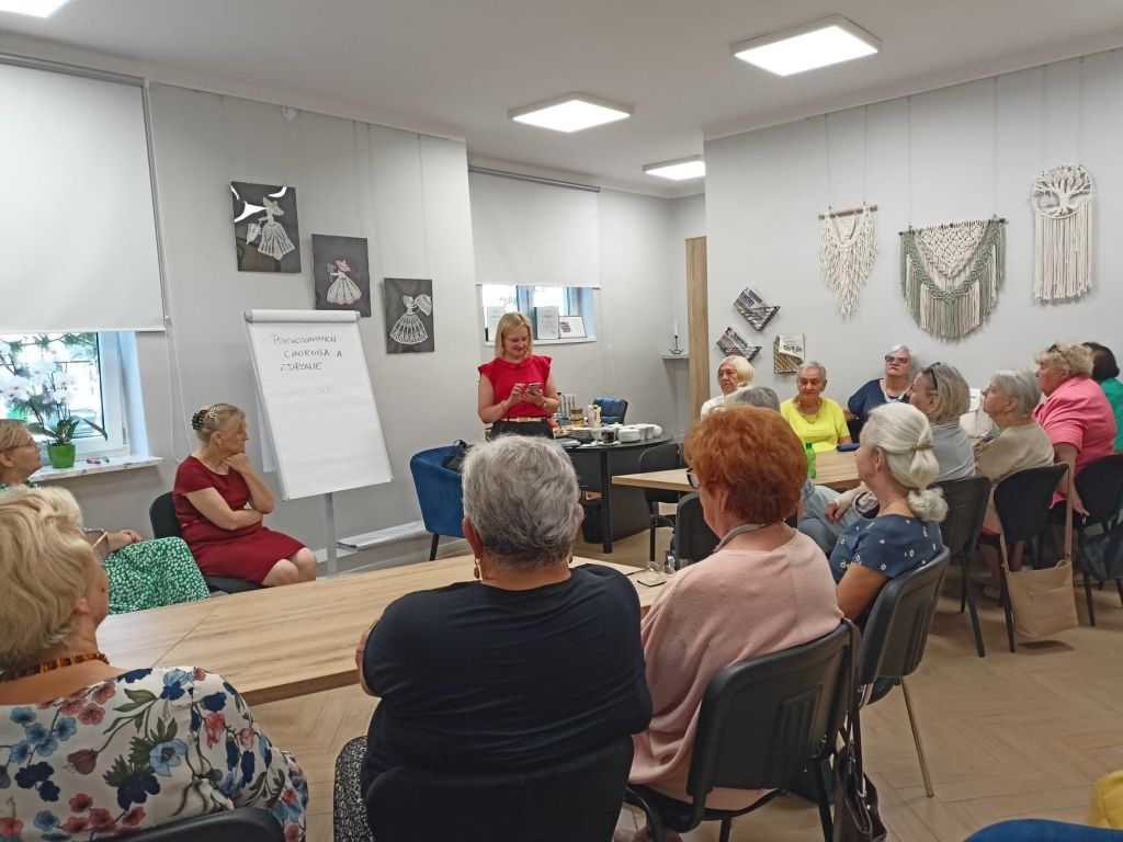 Uczestniczki dzisiejszego spotkania, którego tematem była psychosomatyka - choroba a zdrowie miały możliwość zdobyć wiedzę o tym, czym jest stres,co go może wywołać, jaki ma wpływ na nasze zdrowie, kiedy i jak go odczuwamy.Prowadząca przybliżyła paniom zależność różnego rodzaju chorób związanych z poszczególnymi organami ciała, między innymi tłumiona złość przeradza się w nerwicę lękową, smutek , rozpacz, a nawet depresję.Dziękujemy Pani Anecie za kolejne bardzo wartościowe i pouczające spotkanie.