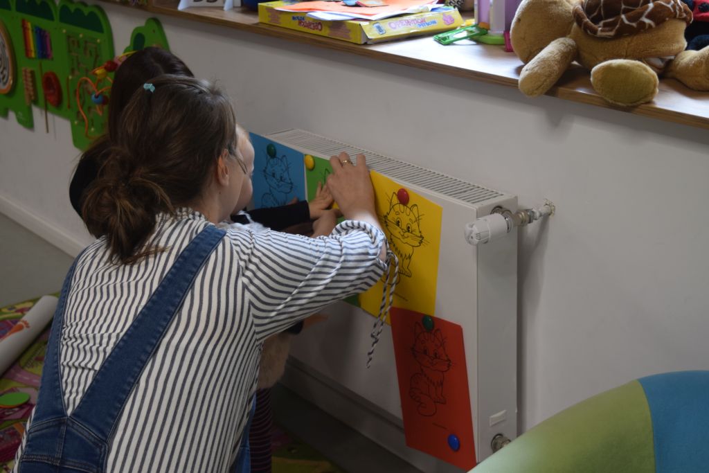 Zajęcia rozpoczęliśmy od zabawy ciepło- zimno. Następnie dzieci wysłuchały książki sensorycznej z serii "Dotykam, poznaję. Las". Uczyliśmy się również kolorów. Maluszki próbowały dopasować odpowiednie koło do danego kotka utrwalając kolory: czerwony, zielony, niebieski i żółty. Nie zabrakło zabawy ruchowej przy piosence "Idziemy do zoo". Podczas grania muzyki dzieci chodziły po sali, gdy muzyka się zatrzymywała, każde dziecko musiało stanąć na krążku w wybranym kolorze. Podsumowaniem zajęć była praca plastyczna, farbami do malowania paluszkami maluszki pokolorowały żółwia.