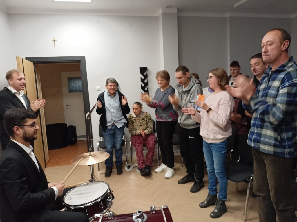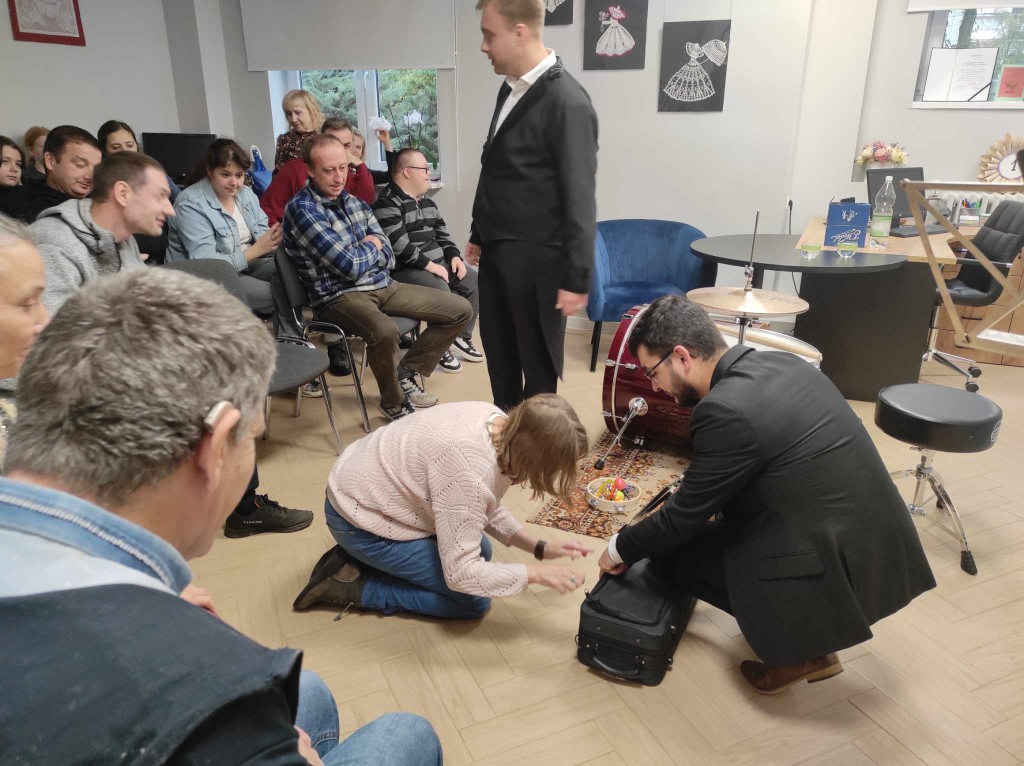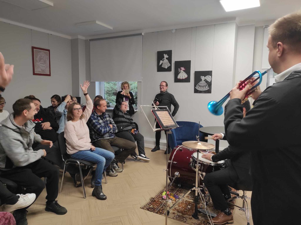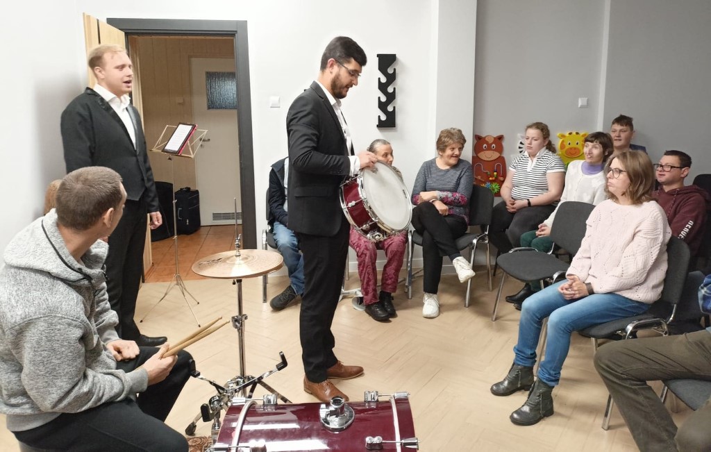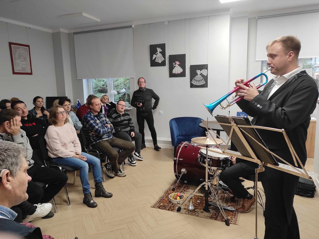 Wzięły w nich udział dzieci ze Specjalnego Ośrodka Szkolno - Wychowawczego oraz grupa uczestników ze Środowiskowego Domu Samopomocy w Przasnyszu. Podczas spotkania rozmawialiśmy i poznawaliśmy budowę trąbki i perkusji. Ten miły czas uświetniły nam utwory walca, marszu i muzyki rozrywkowej pt. "Takie tango" i "Różowa pantera" grane na trąbce i perkusji. Koncert w wykonanie Pana Maćka i Pana Tomka był ucztą dla naszych uszu. Na zakończenie odbył się słodki muzyczny quiz. Warsztaty wzbudziły we wszystkich wiele pozytywnych emocji. Dziękujemy wszystkim uczestnikom za aktywny udział w zajęciach oraz Agencji Artystycznej "Zakręcona Filharmonia" za przeprowadzone warsztaty.