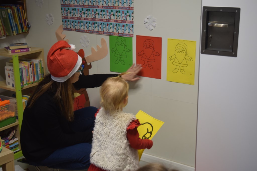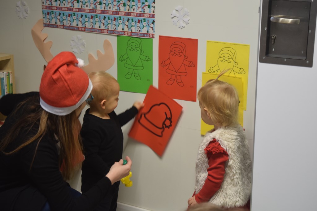 Spotkanie rozpoczęliśmy od wysłuchania książki pt. "Mali pomocnicy Świętego Mikołaja". Następnie maluszki utrwalały kolory: czerwony, zielony oraz żółty. Ćwiczenie polegało na dopasowaniu odpowiednich kolorów do kartonowej choinki. Nie zabrakło również zabaw przy muzyce. Podsumowaniem zajęć była praca plastyczna, dzieci wraz z rodzicami ozdabiały choinki lub bombki. Na zakończenie oglądały choinki w naszej bibliotece, tradycyjną oraz nietypową, bo zbudowaną z książek.