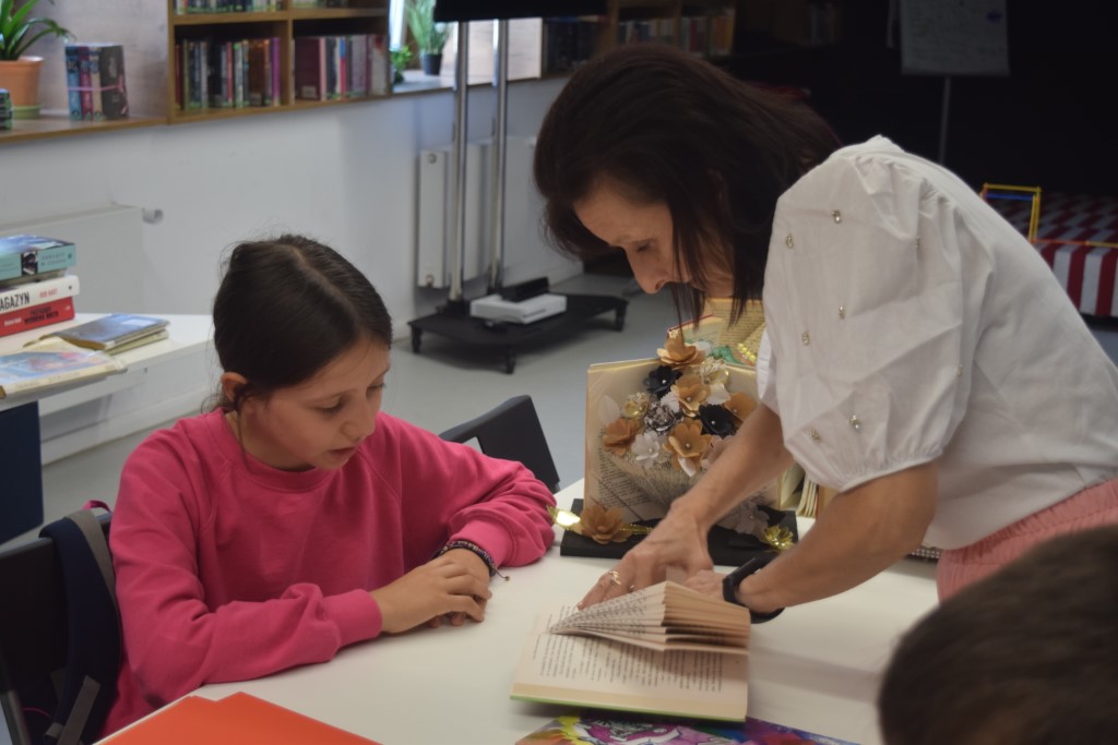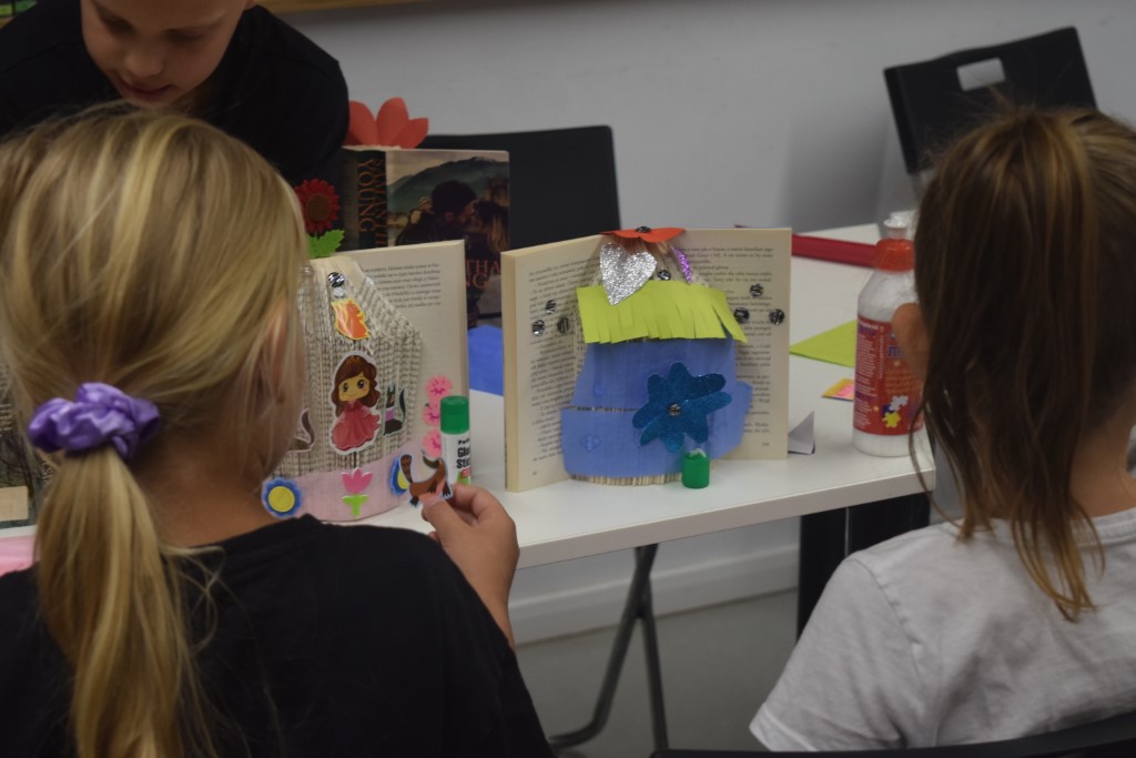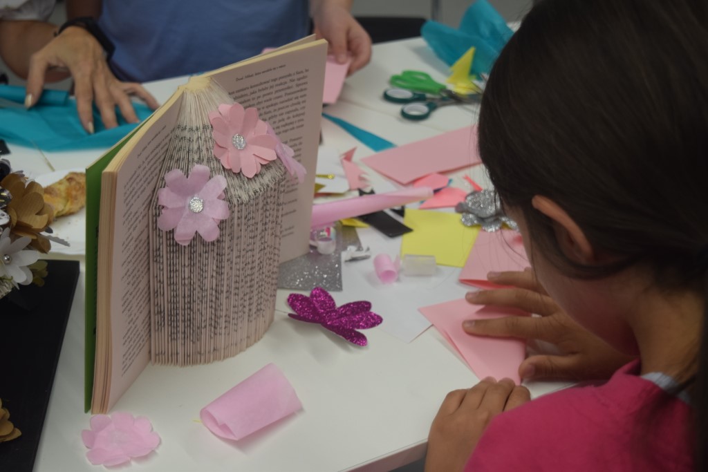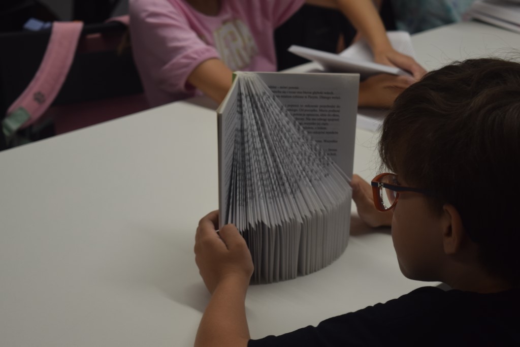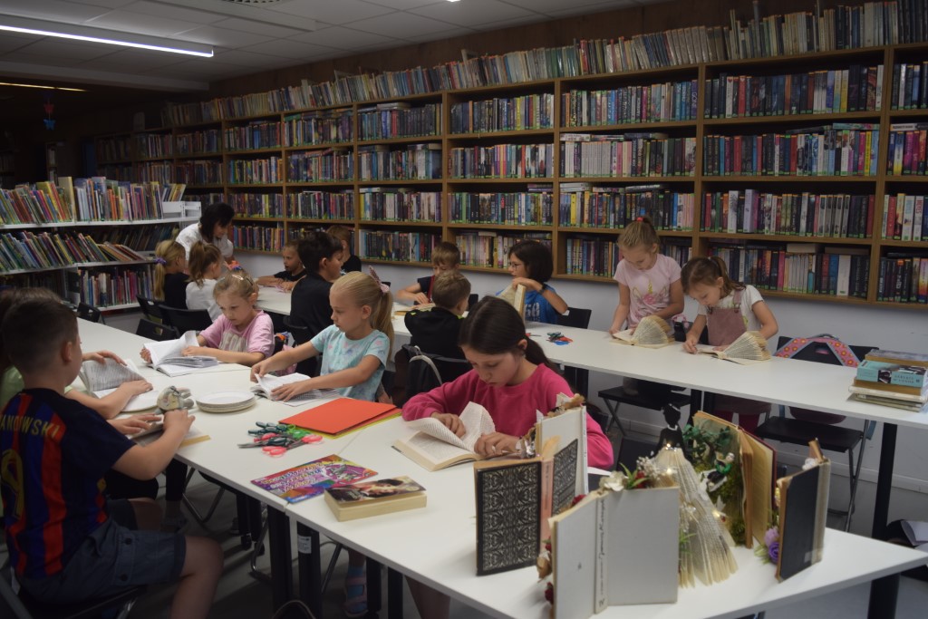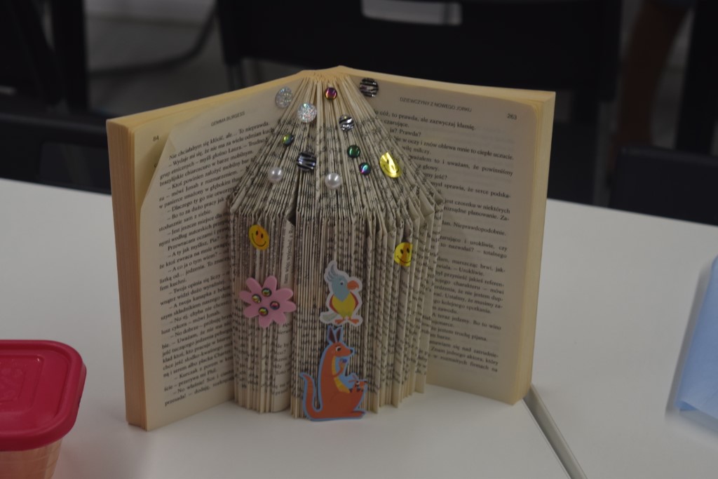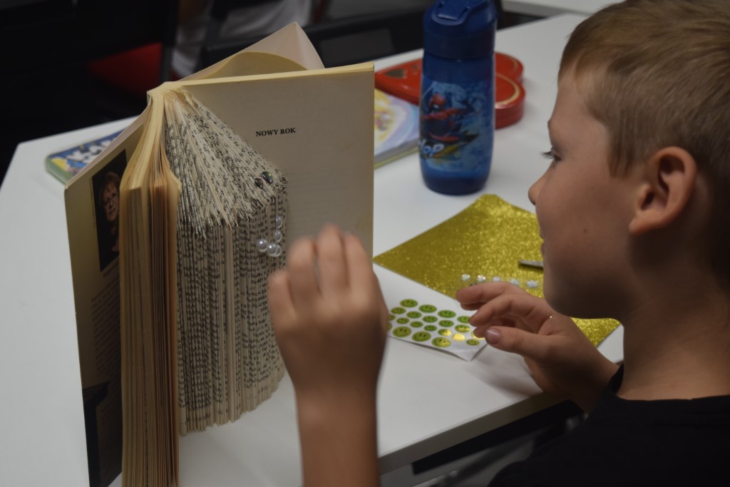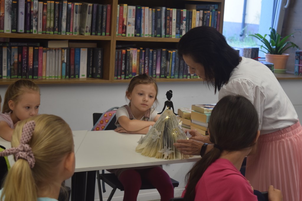 Naszym dzisiejszym gościem była Pani Barbara Nowicka z Gminnej Biblioteki Publicznej w Krasnem. Tematem zajęć było drugie życie książek. Pani Barbara pokazała nam w jaki sposób użyć ponownie książek, aby ich nie wyrzucać. Każdy z uczestników przy pomocy prowadzącej stworzył piękną książkową ozdobę, którą mógł zabrać ze sobą do domu. Ponadto każdy mógł zabrać do domu swój wakacyjny album, który tworzyliśmy przez cały tydzień Wakacji z Biblioteką.