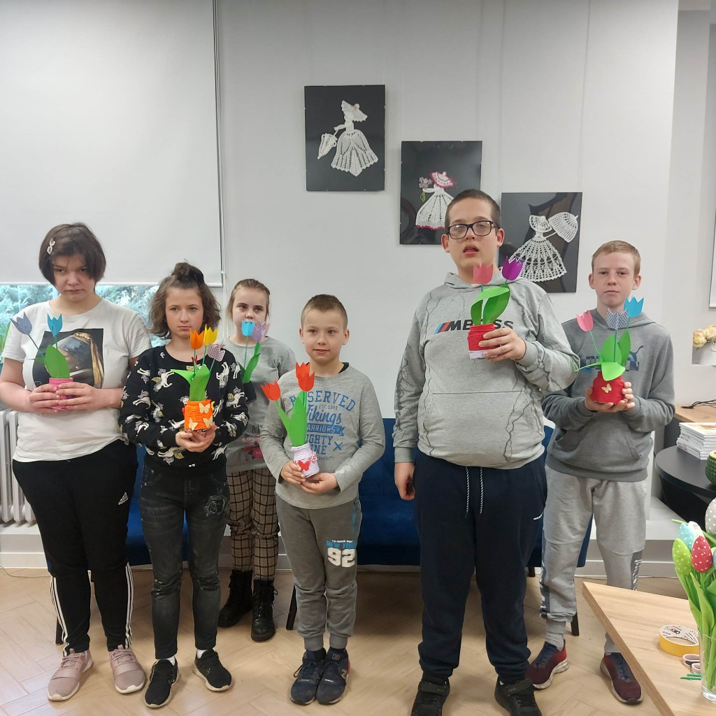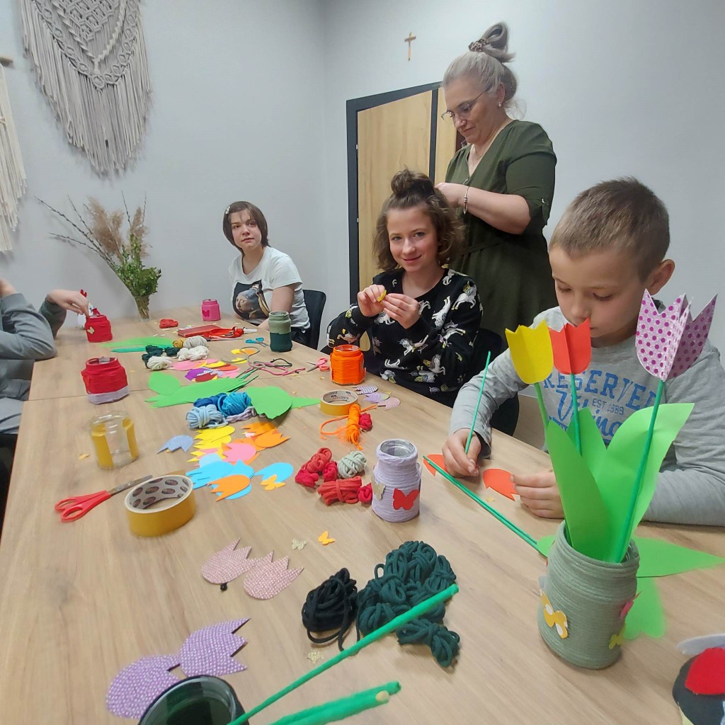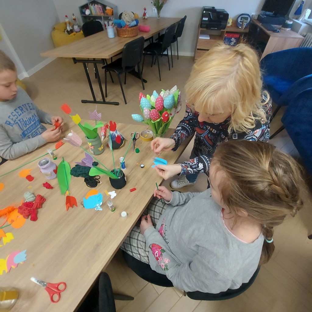 Podczas zajęć wykonywaliśmy wiosenne wazony z tulipanami. Dzięki tej zabawie i pracy dzieci poznały symbole wiosny, a także rozwinęły zainteresowanie przyrodą oraz pobudziły kreatywność. Spotkanie przebiegało w miłej atmosferze, a warsztaty uatrakcyjniał "leśny koncert" ze śpiewem ptaków w tle. Dziękujemy wszystkim uczestnikom za aktywny udział oraz Pani Joannie Ossowskiej za współpracę.