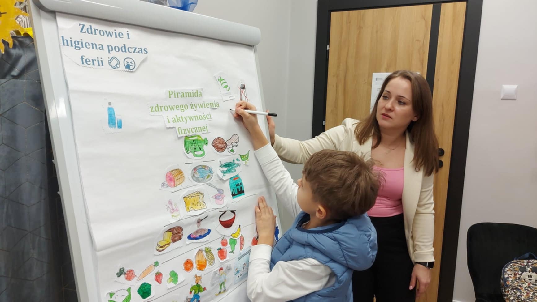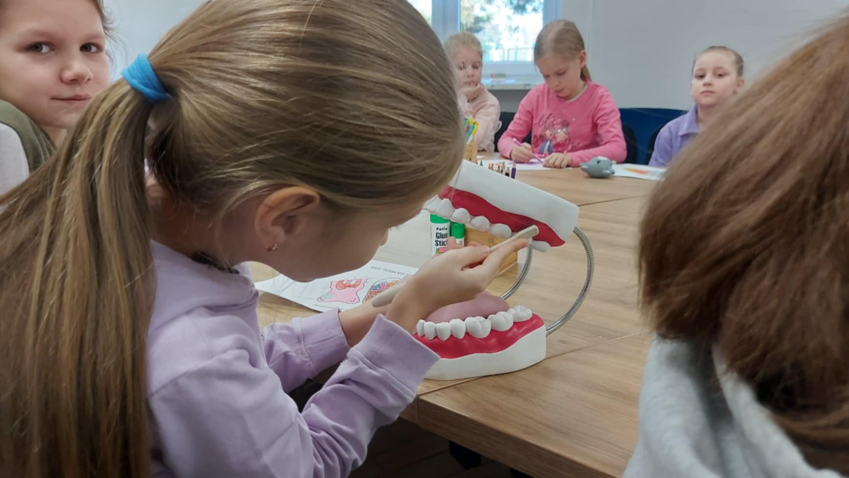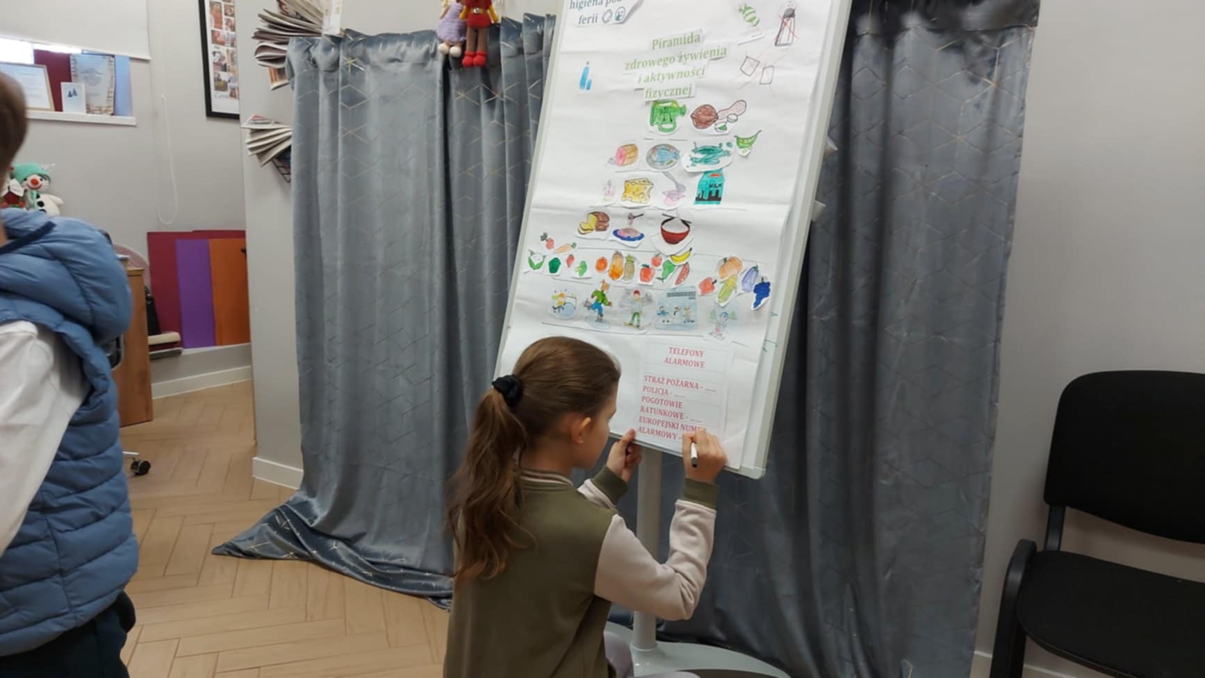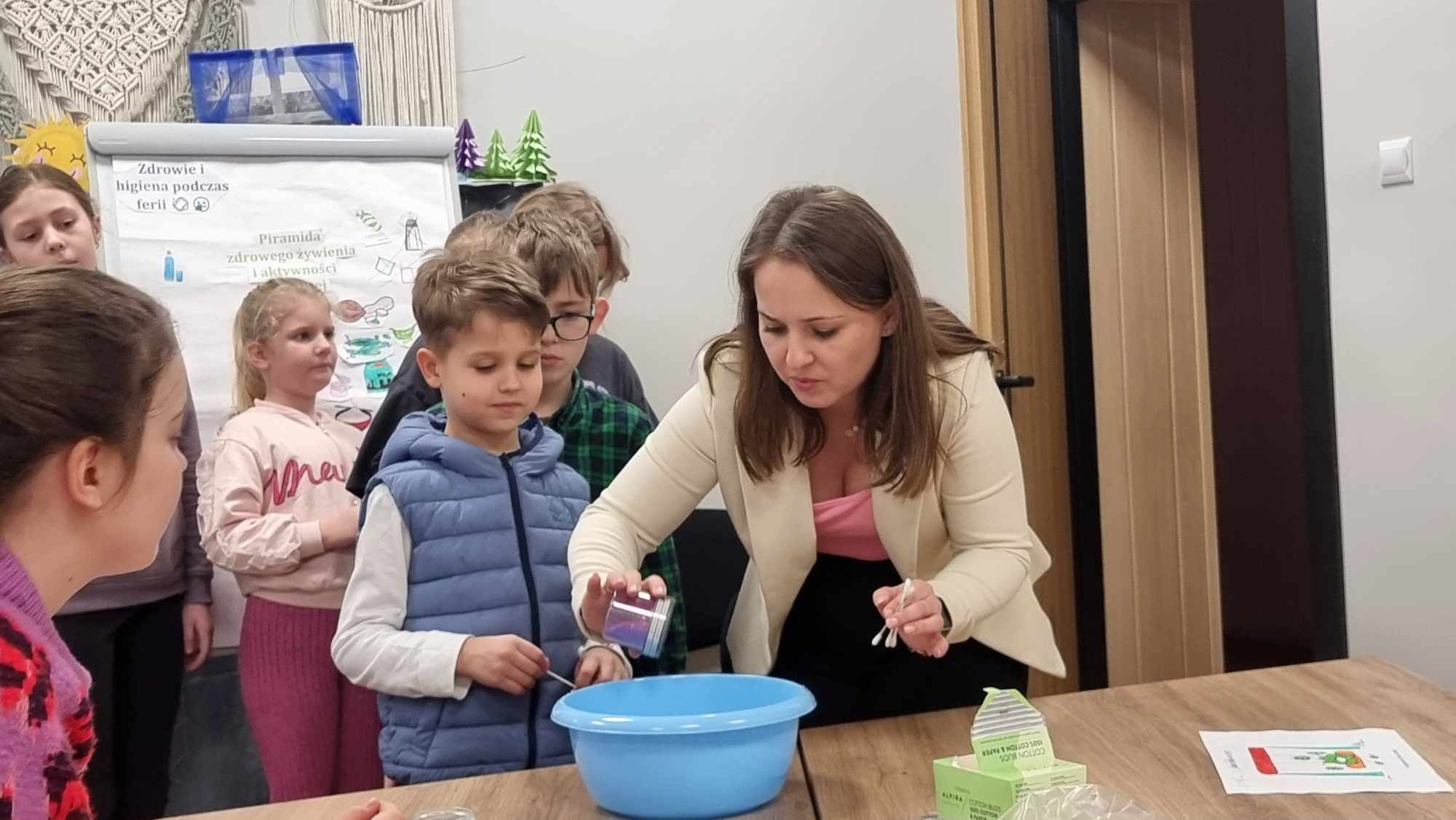 Kolejny dzień ferii w bibliotece był pełen ciekawych zajęć i wartościowej edukacji. Dzieci miały okazję spotkać się z Panią Martą Pęczkowską z Powiatowej Stacji Sanitarno-Epidemiologicznej, która w przystępny i angażujący sposób opowiedziała im o prawidłowym myciu rąk oraz higienie jamy ustnej. Dzięki praktycznym wskazówkom i pokazom najmłodsi dowiedzieli się, jak dbać o zdrowie i unikać chorób.Kolejną atrakcją było wspólne tworzenie piramidy żywienia. Dzieci aktywnie uczestniczyły w układaniu poszczególnych grup produktów spożywczych, ucząc się, które z nich powinny stanowić podstawę codziennej diety, a które warto spożywać z umiarem. Zabawa ta nie tylko uświadomiła im zasady zdrowego odżywiania, ale także pobudziła ich kreatywność i umiejętność pracy w grupie.