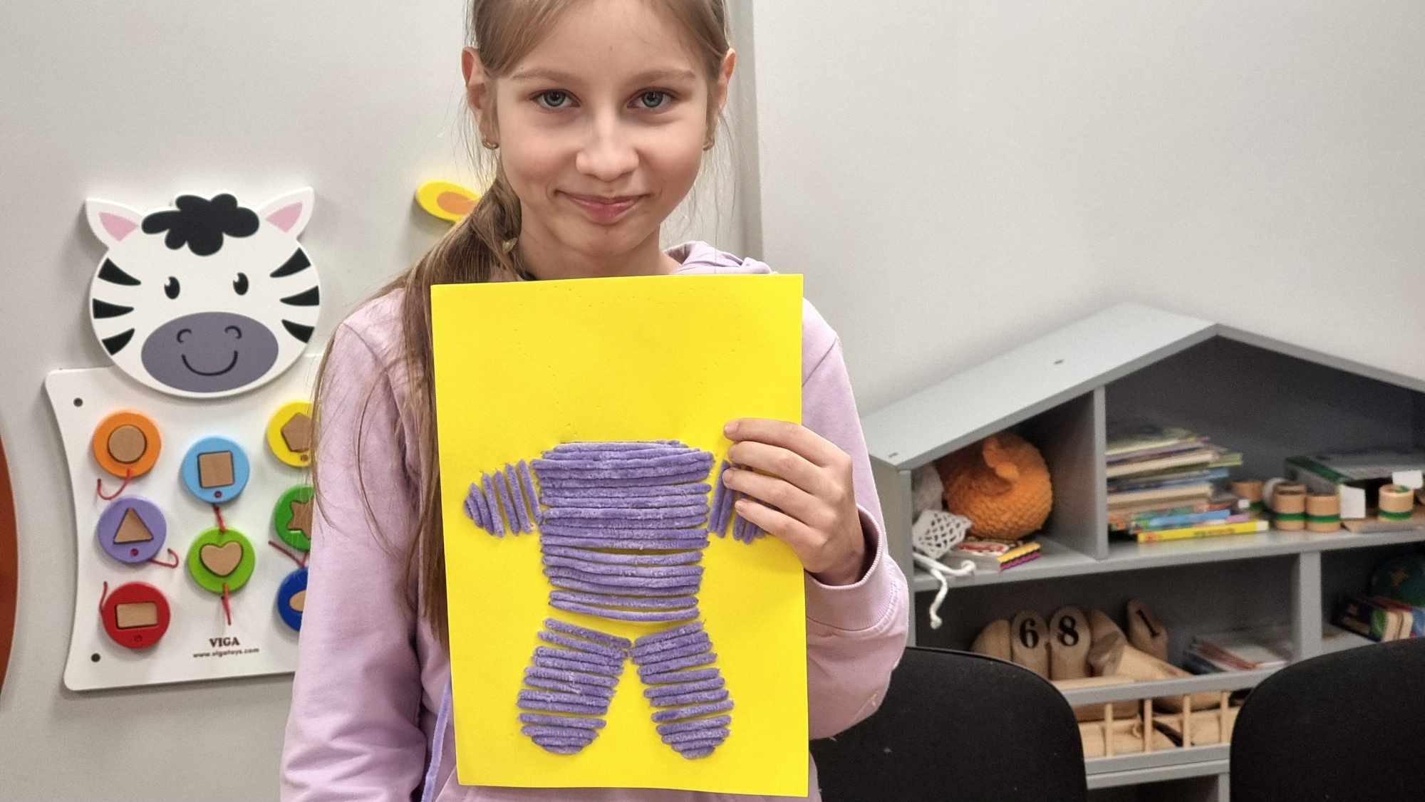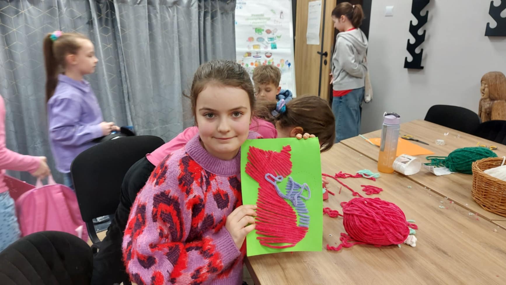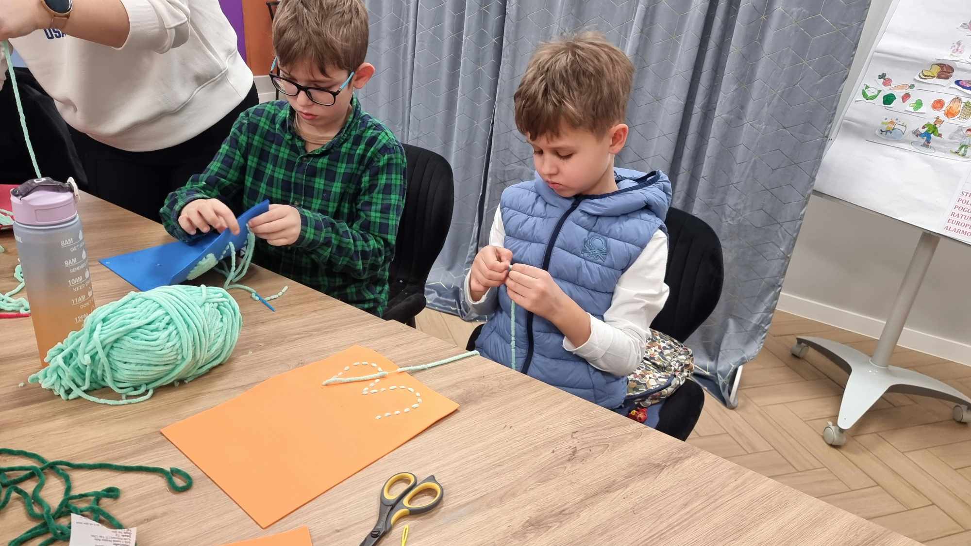 W drugiej części zajęć uczestnicy mogli wykazać się zdolnościami manualnymi, wyszywając kolorową włóczką na miękkiej piance. Powstawały urocze kotki, pieski i misie, które cieszyły zarówno dzieci, jak i opiekunów. Praca z włóczką rozwijała ich cierpliwość, precyzję oraz zdolności artystyczne.