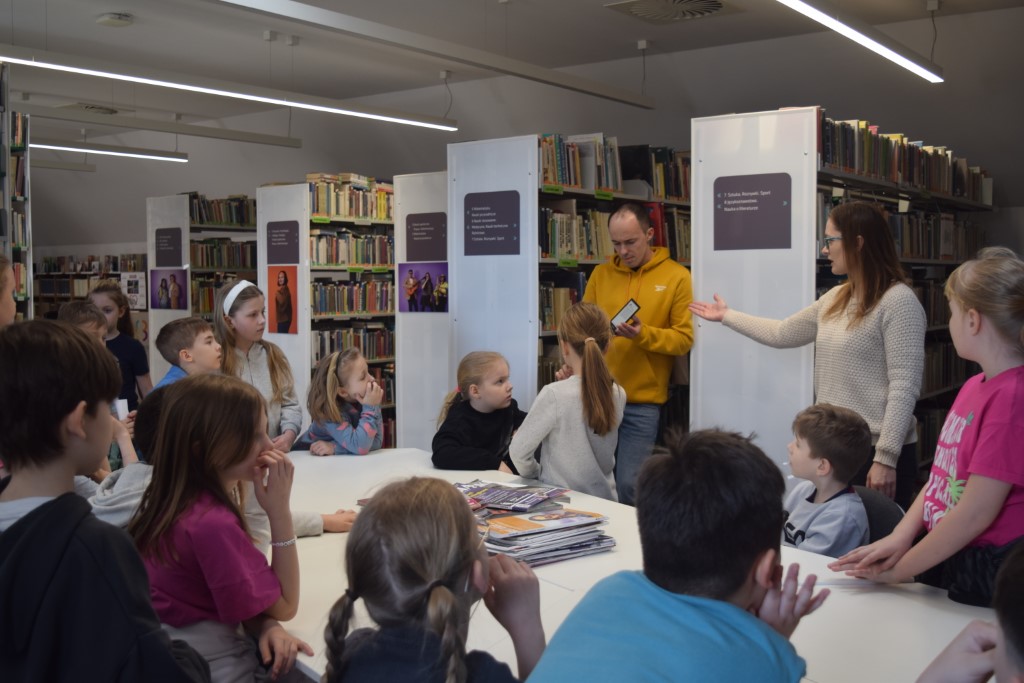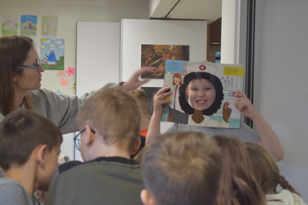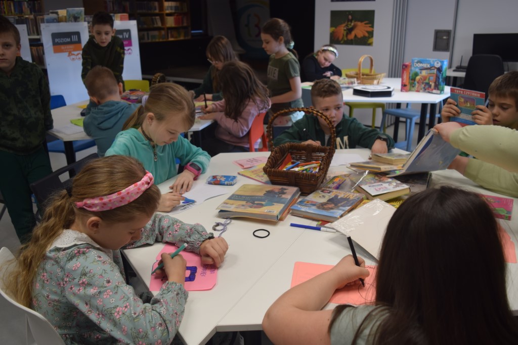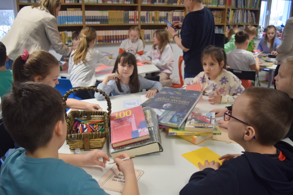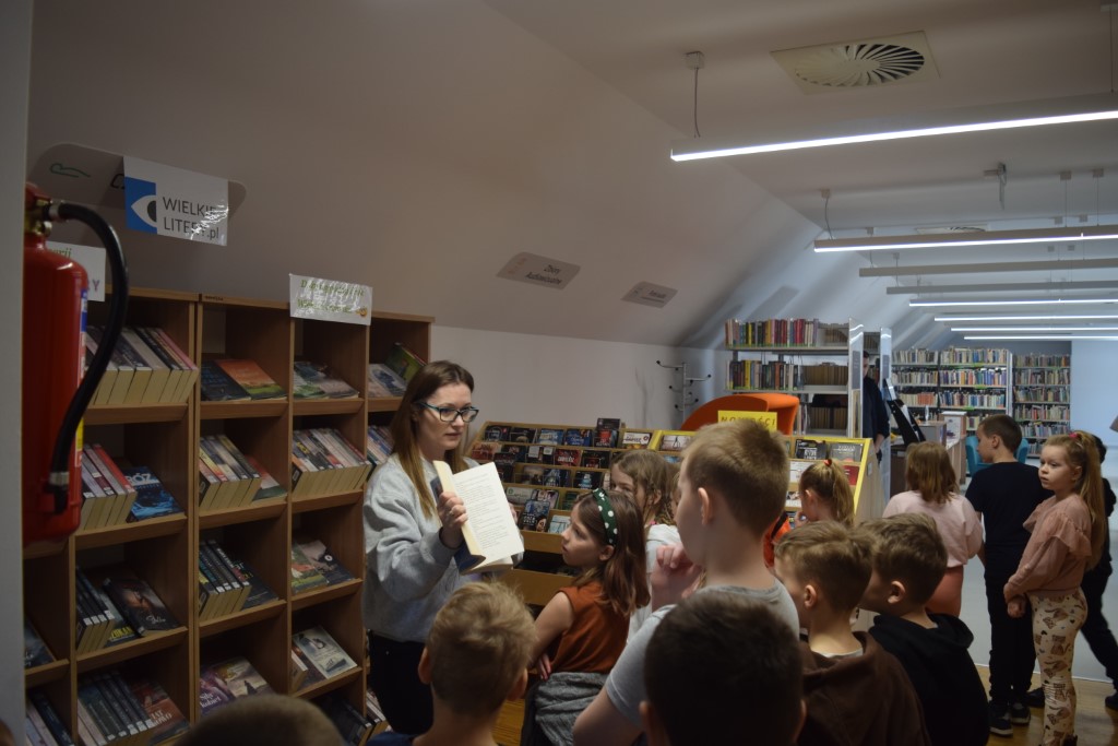 W ubiegłym tygodniu naszą bibliotekę odwiedziły trzy klasy drugie ze Szkoły Podstawowej nr 1 z Oddziałami Integracyjnymi w Przasnyszu. Tematem zajęć był zawód bibliotekarza. Spotkanie rozpoczęliśmy od zwiedzania biblioteki, ponieważ część uczniów była u nas pierwszy raz. Dzieci dowiedziały się, co zrobić, żeby zostać czytelnikiem, w jaki sposób wypożycza się książki oraz jak należy o nie dbać. Zapoznały się z etapami, przez jakie przechodzi książka, zanim trafi na wypożyczalnię. Ponad to chętnie opowiadały o swoich ulubionych książkach. Wzięły udział w quizie na temat wiosny. Zapoznały się z takimi terminami jak: czytnik, czytak, manga, literatura popularnonaukowa. Na koniec spotkania wykonały pracę plastyczną, zaprojektowały własne książeczki.