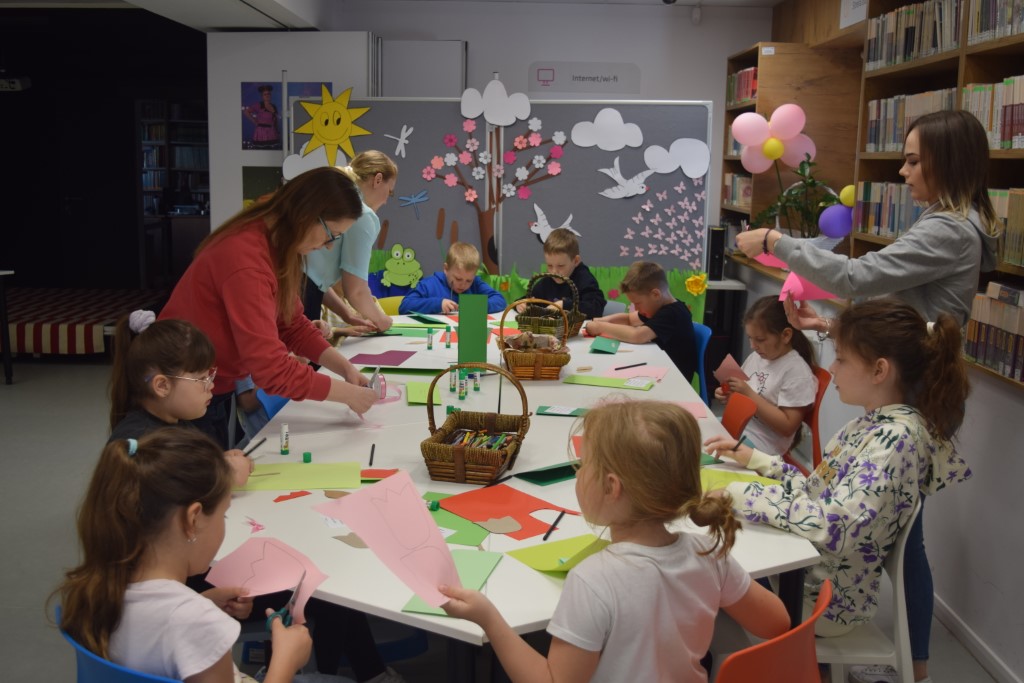 W naszej bibliotece odbyły się wyjątkowe zajęcia z okazji nadchodzącego Dnia Mamy. Spotkanie rozpoczęliśmy pogadanką, podczas której rozmawialiśmy o tym, za co kochamy nasze mamy. Dzieci z dużym zaangażowaniem opowiadały o swoich mamusiach, dzieląc się ciepłymi i wzruszającymi wypowiedziami. Każde dziecko kończyło zdanie: "Moja mama jest...", co zaowocowało pięknymi słowami, takimi jak: „miła”, „cudowna”, „super”, „najlepsza”.