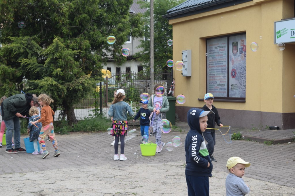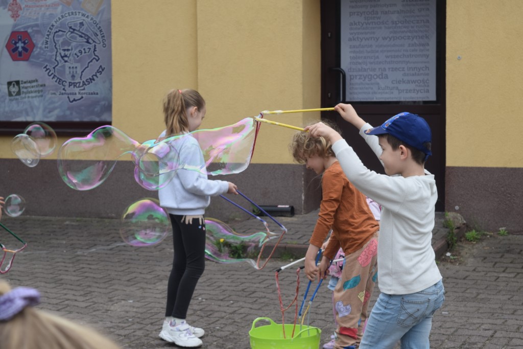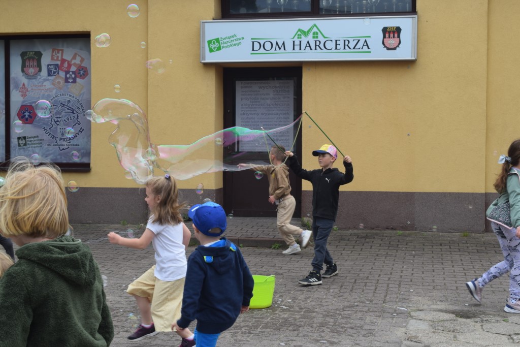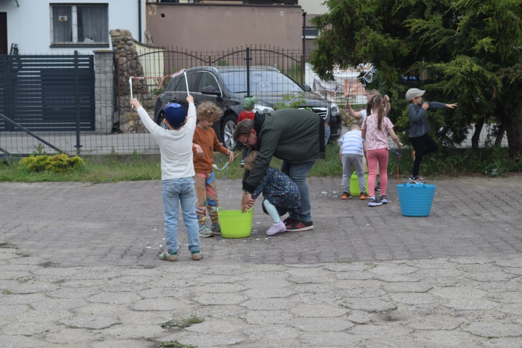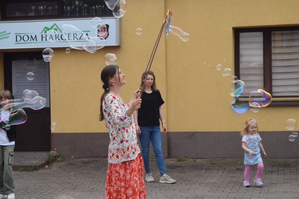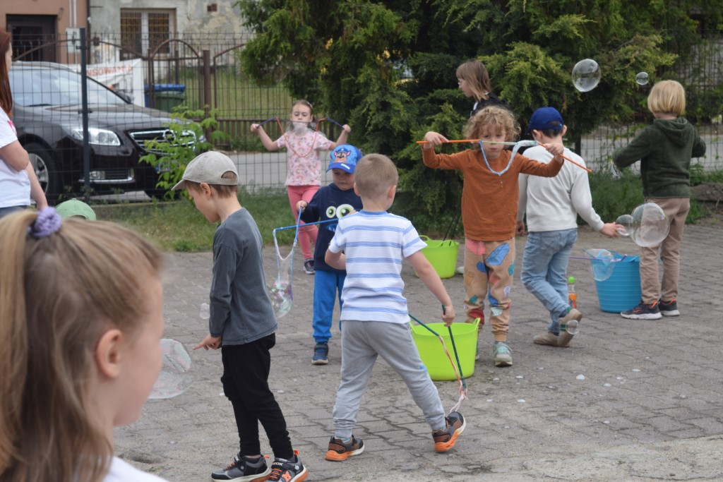 Po pokazie dzieci same mogły spróbować swoich sił w tworzeniu wielkich baniek – z pomocą specjalnych sznurków i płynu powstawały bańki większe niż ich twórcy! Zabawa nie miała końca, a twarze uczestników rozświetlały się z każdą kolejną udaną bańką.