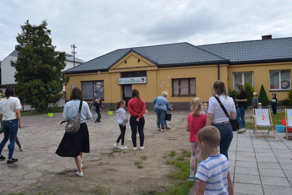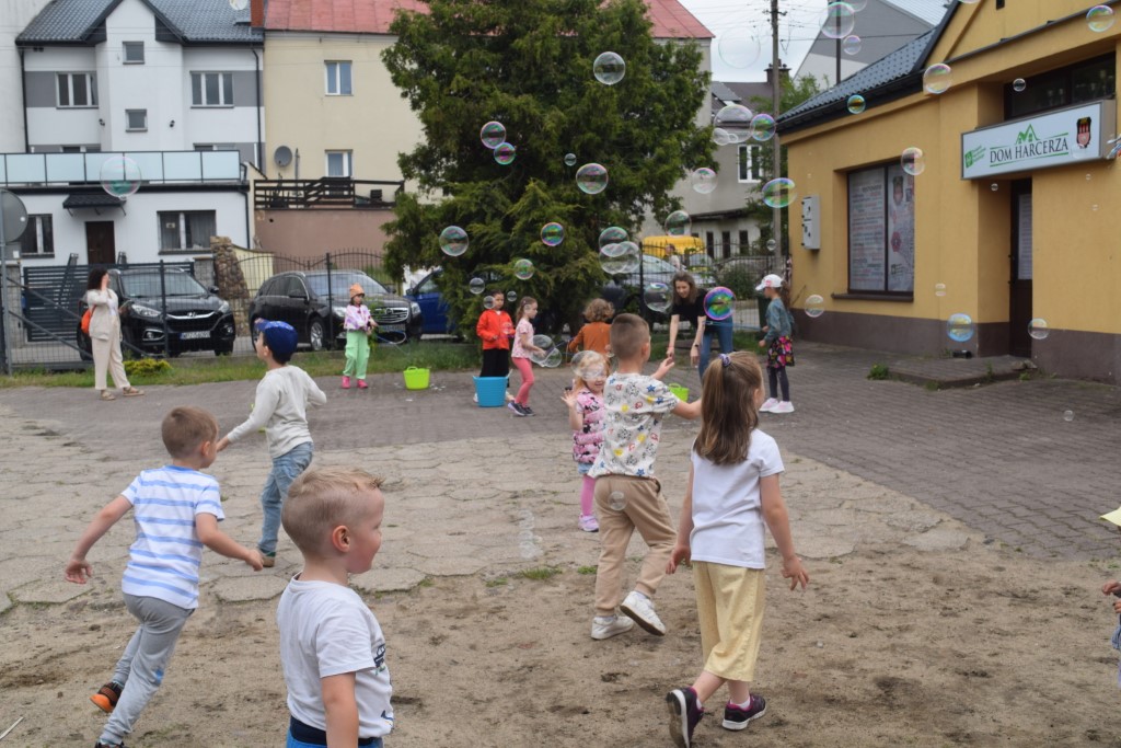 W ciepły, radosny poranek z okazji Dnia Dziecka nasza Biblioteka zamieniła się w krainę kolorów, śmiechu i dziecięcej radości! Już od pierwszych chwil dzieci z zachwytem wpatrywały się w niezwykły pokaz ogromnych baniek mydlanych – tęczowe kule unosiły się w powietrzu, tańczyły na wietrze i pękały z cichym „puf”, wzbudzając okrzyki zachwytu i salwy śmiechu.