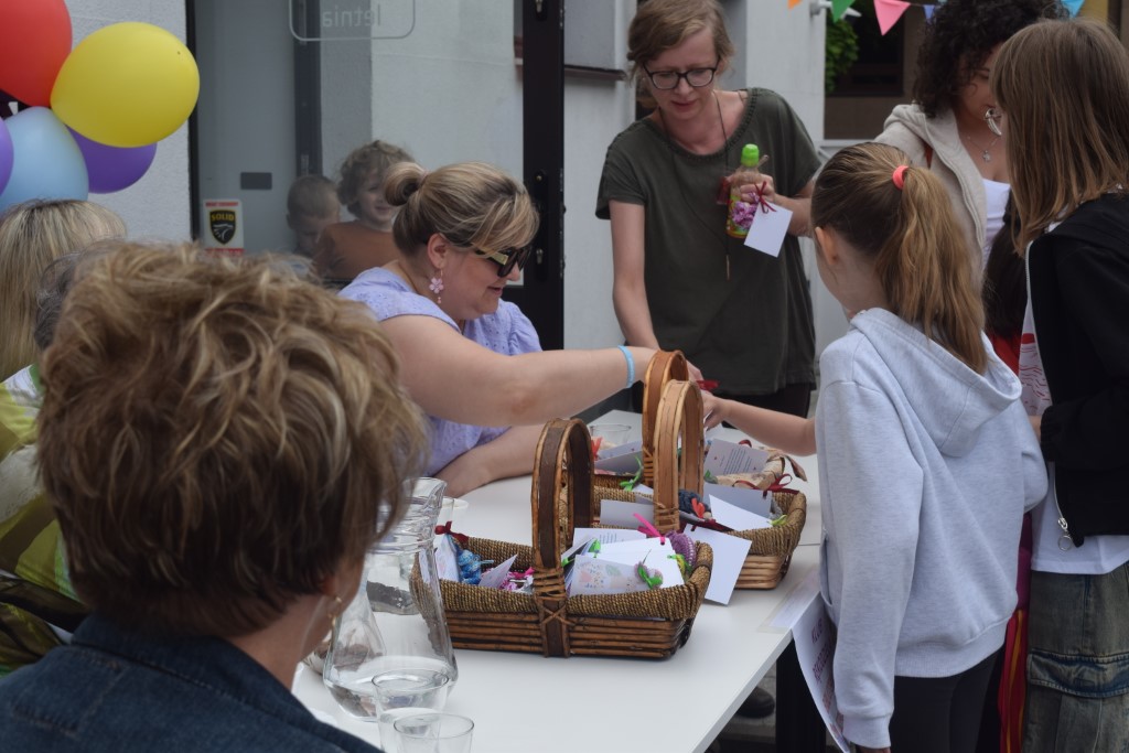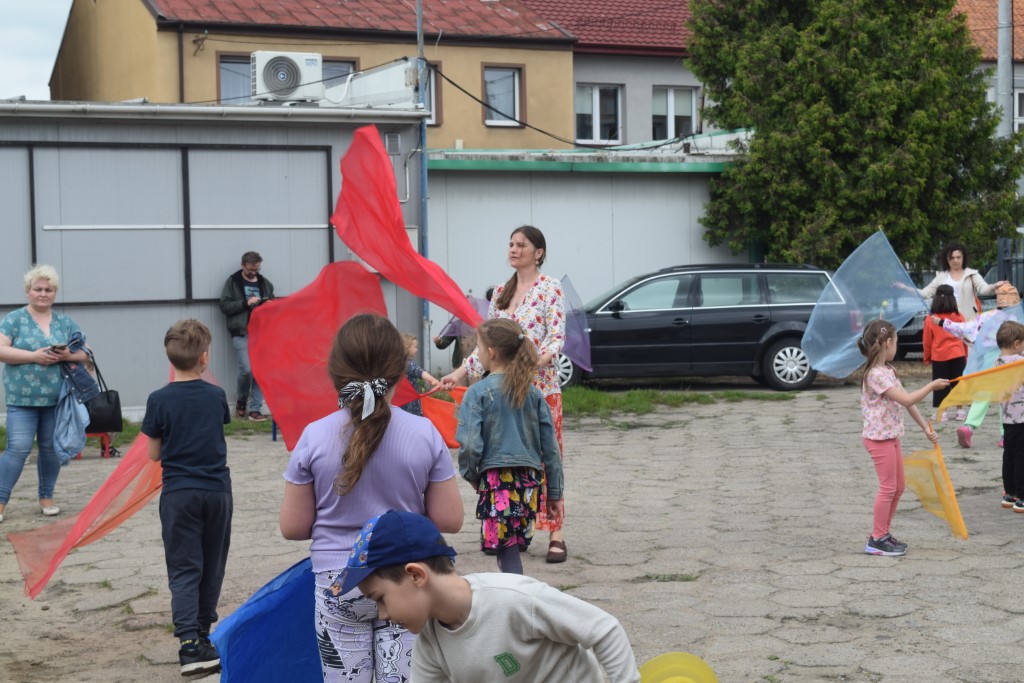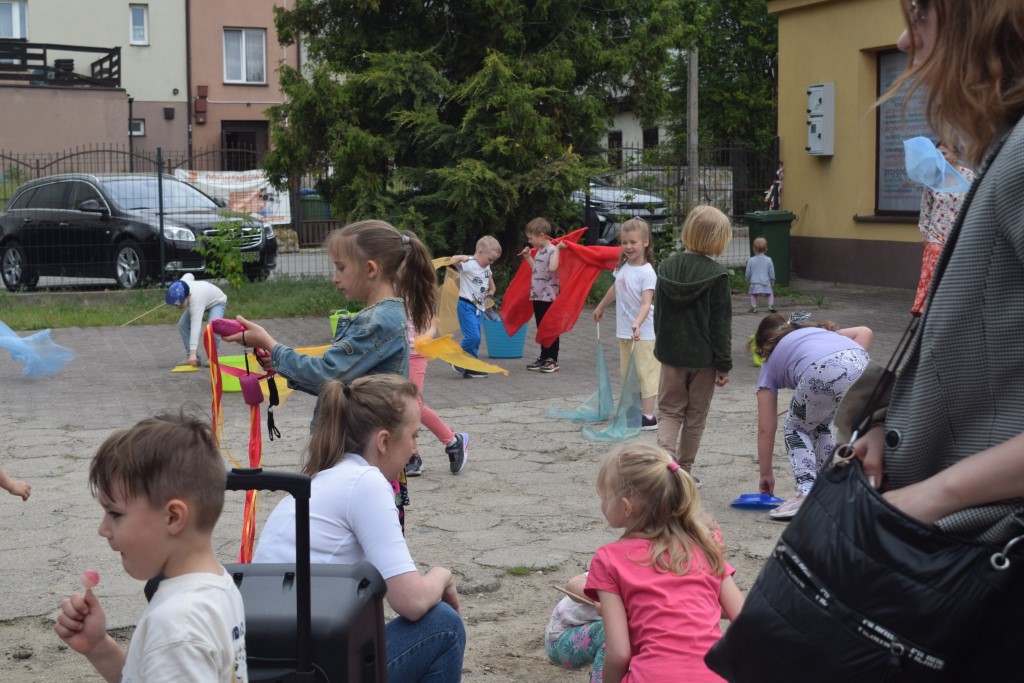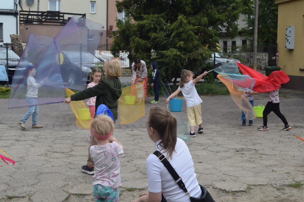 Kiedy emocje nieco opadły, przyszedł czas na kolejną atrakcję – taniec z piłkami poi oraz kolorowymi chorągiewkami. Dzieci wirowały, machały i podskakiwały w rytm muzyki, tworząc barwne wiry i radosne kompozycje ruchu. To była nie tylko świetna zabawa, ale i doskonała okazja do wyrażenia siebie poprzez taniec i ruch. Po zabawach zaprosiliśmy dzieci na mały poczęstunek, podczas którego dzieci miały okazję odpocząć jak również pobawić się podczas zabaw dowolnych. Na koniec każde dziecko otrzymało upominek z okazji Dnia Dziecka.