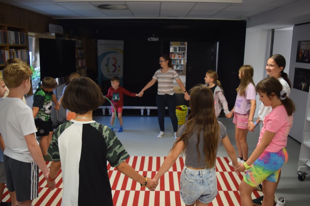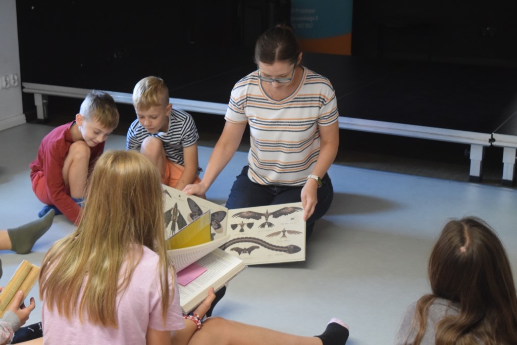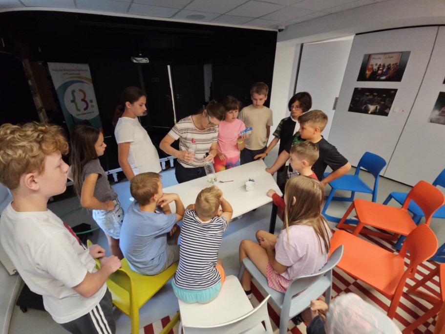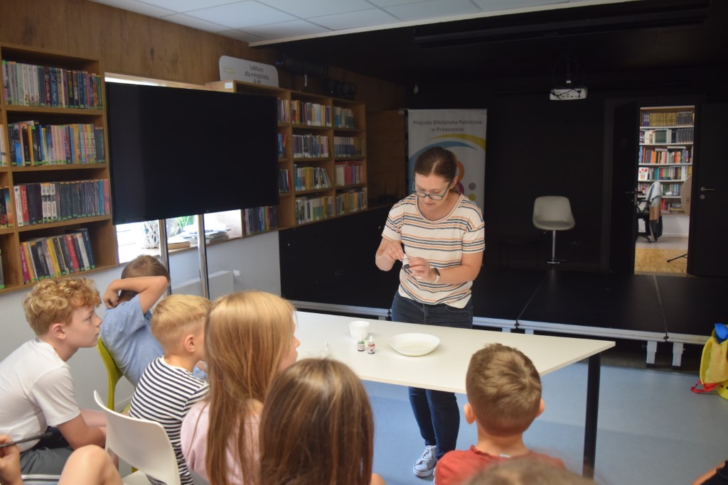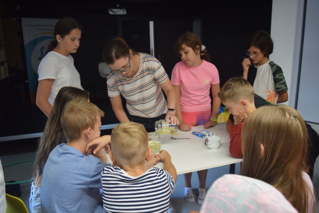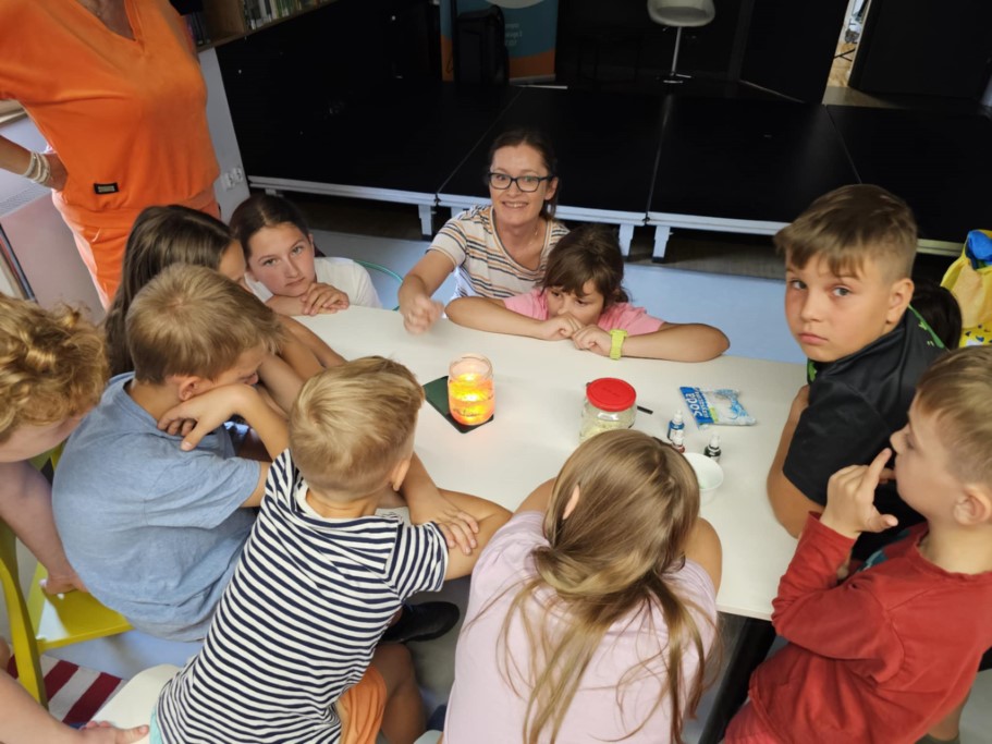 Przedostatni dzień Wakacji z Biblioteką upłynął w magicznej atmosferze fantastyki. Zajęcia rozpoczęliśmy od zabaw ruchowych i integracyjnych. Następnie dzieci przeniosły się do czarodziejskiego świata fantasy – dowiedziały się, czym wyróżniają się magiczne opowieści i poznały bohaterów znanych książek. Następnie każdy uczestnik stworzył własną różdżkę, ozdabiając ją według własnego pomysłu kolorowymi materiałami, brokatem i błyszczącymi dodatkami. Kolejnym punktem programu były pokazy w ramach warsztatów Mały Al-chemik. Aby przeprowadzić proste doświadczenia, nie potrzeba profesjonalnego sprzętu ani odczynników – wystarczy to, co mamy w domu. Podczas zajęć wykorzystaliśmy ocet, wodę, olej, sodę oczyszczoną, płyn do naczyń, pieprz i bibułę. Dzieci z zaciekawieniem obserwowały eksperymenty takie jak lampa lawa, nadmuchiwanie balona przy użyciu sody i octu czy uciekające kolory. To był dzień pełen inspiracji, który połączył świat wyobraźni z fascynującą stroną nauki – idealna wakacyjna przygoda w bibliotece.
