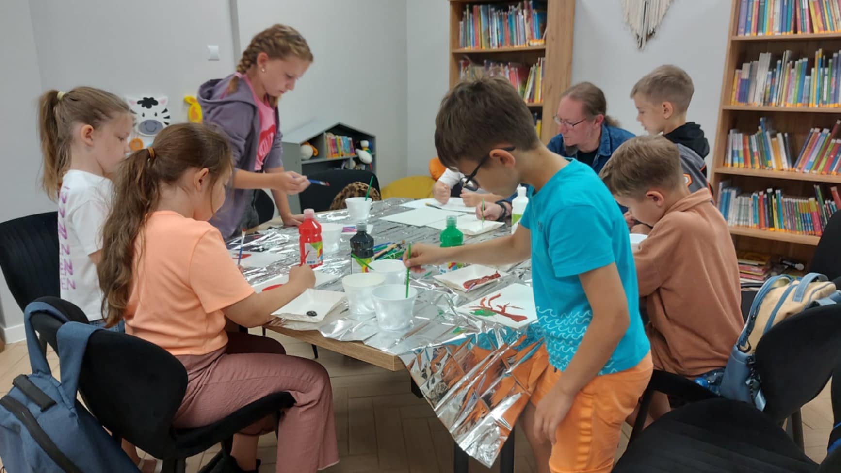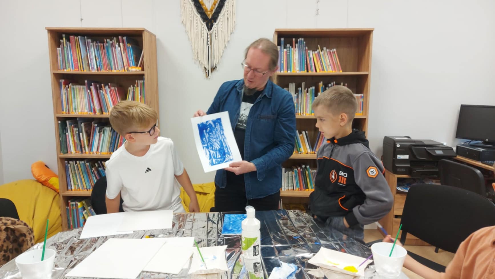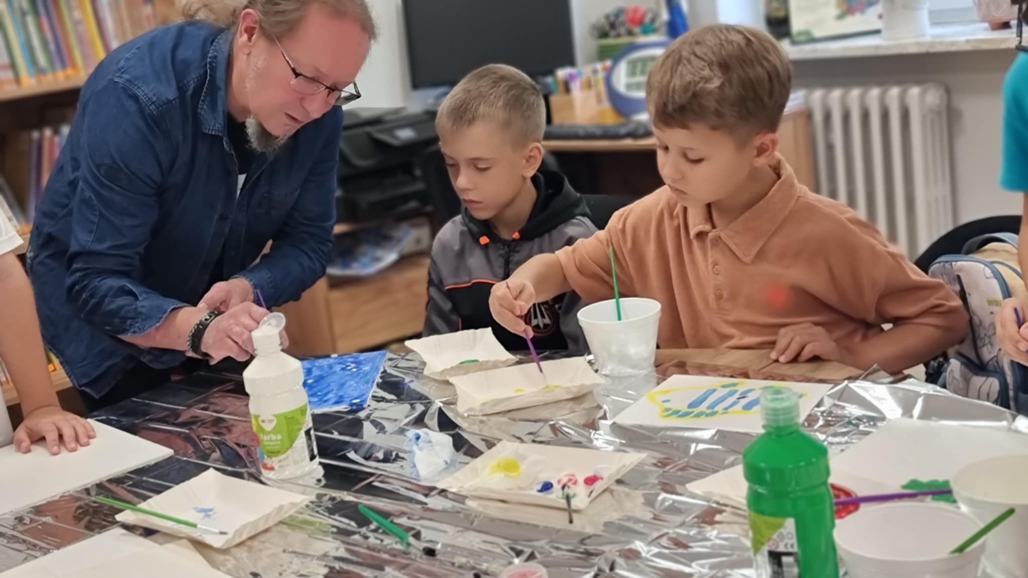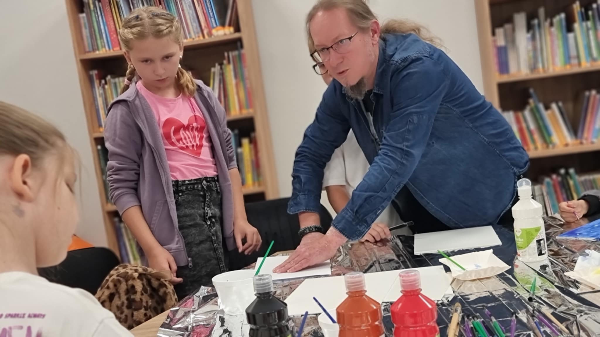 Na początek, aby lepiej się poznać i przełamać pierwsze lody, dzieci wzięły udział w integracyjnej zabawie „Pajęczynka”. Śmiechu i pozytywnej energii nie brakowało! Następnie uczestnicy przenieśli się w świat sztuki, poznając ciekawą technikę plastyczną – monotypię, czyli malowanie połączone z odbijaniem obrazu. Pod okiem naszego gościa dzieci tworzyły barwne, niepowtarzalne prace, eksperymentując z kolorami i formami. Zajęcia zakończyły się prezentacją powstałych dzieł i wspólnymi rozmowami o tym, co najbardziej się podobało. To był twórczy, pełen wrażeń początek wakacyjnych spotkań w bibliotece.