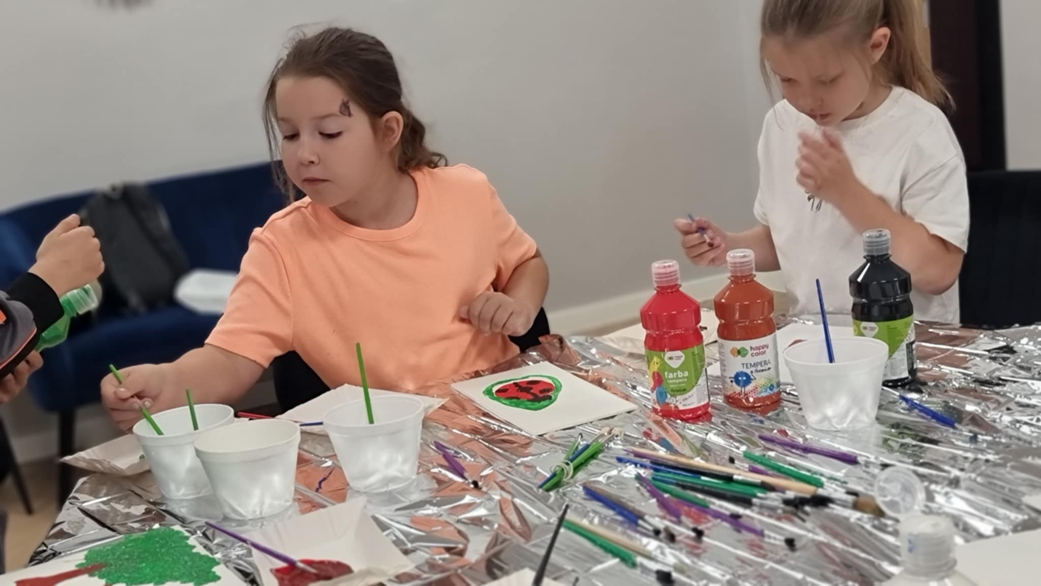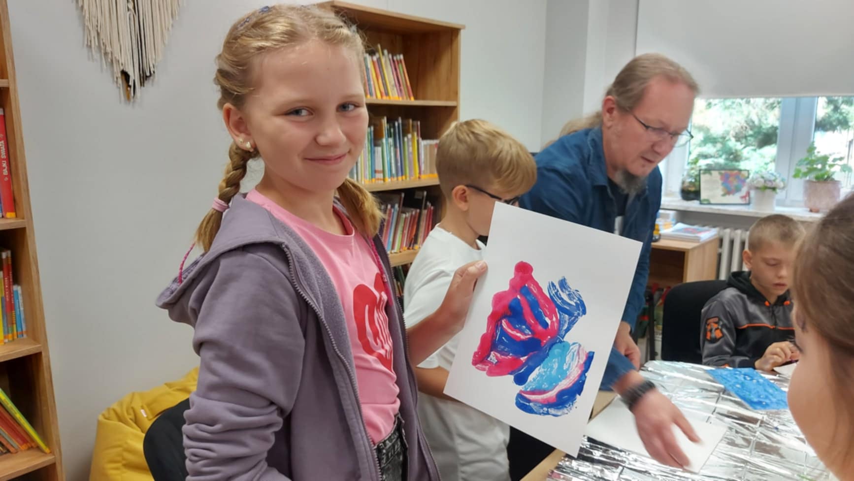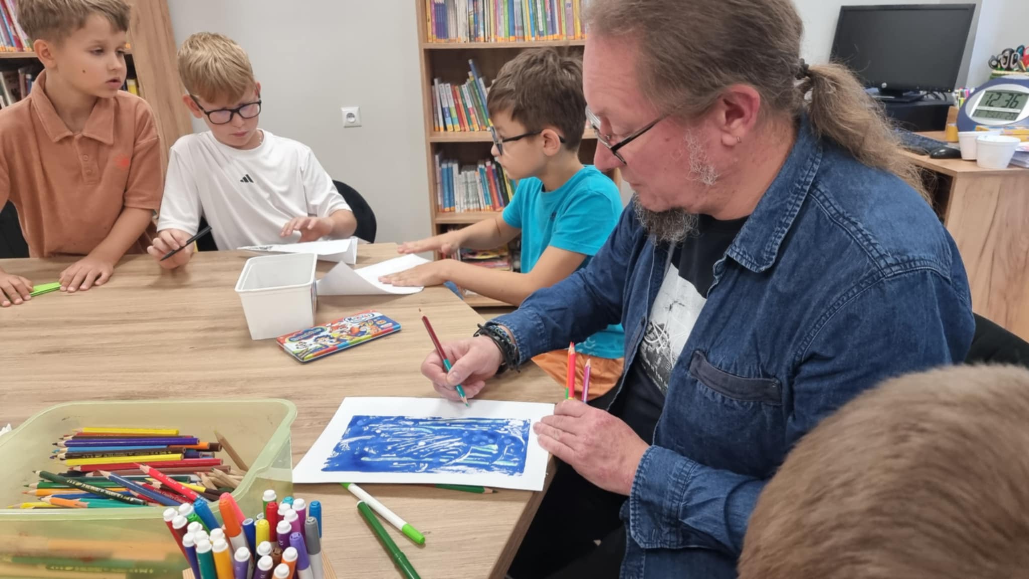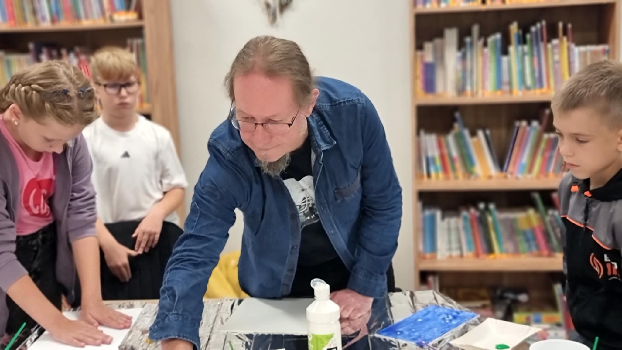 Na początek, aby lepiej się poznać i przełamać pierwsze lody, dzieci wzięły udział w integracyjnej zabawie „Pajęczynka”. Śmiechu i pozytywnej energii nie brakowało! Następnie uczestnicy przenieśli się w świat sztuki, poznając ciekawą technikę plastyczną – monotypię, czyli malowanie połączone z odbijaniem obrazu. Pod okiem naszego gościa dzieci tworzyły barwne, niepowtarzalne prace, eksperymentując z kolorami i formami. Zajęcia zakończyły się prezentacją powstałych dzieł i wspólnymi rozmowami o tym, co najbardziej się podobało. To był twórczy, pełen wrażeń początek wakacyjnych spotkań w bibliotece.