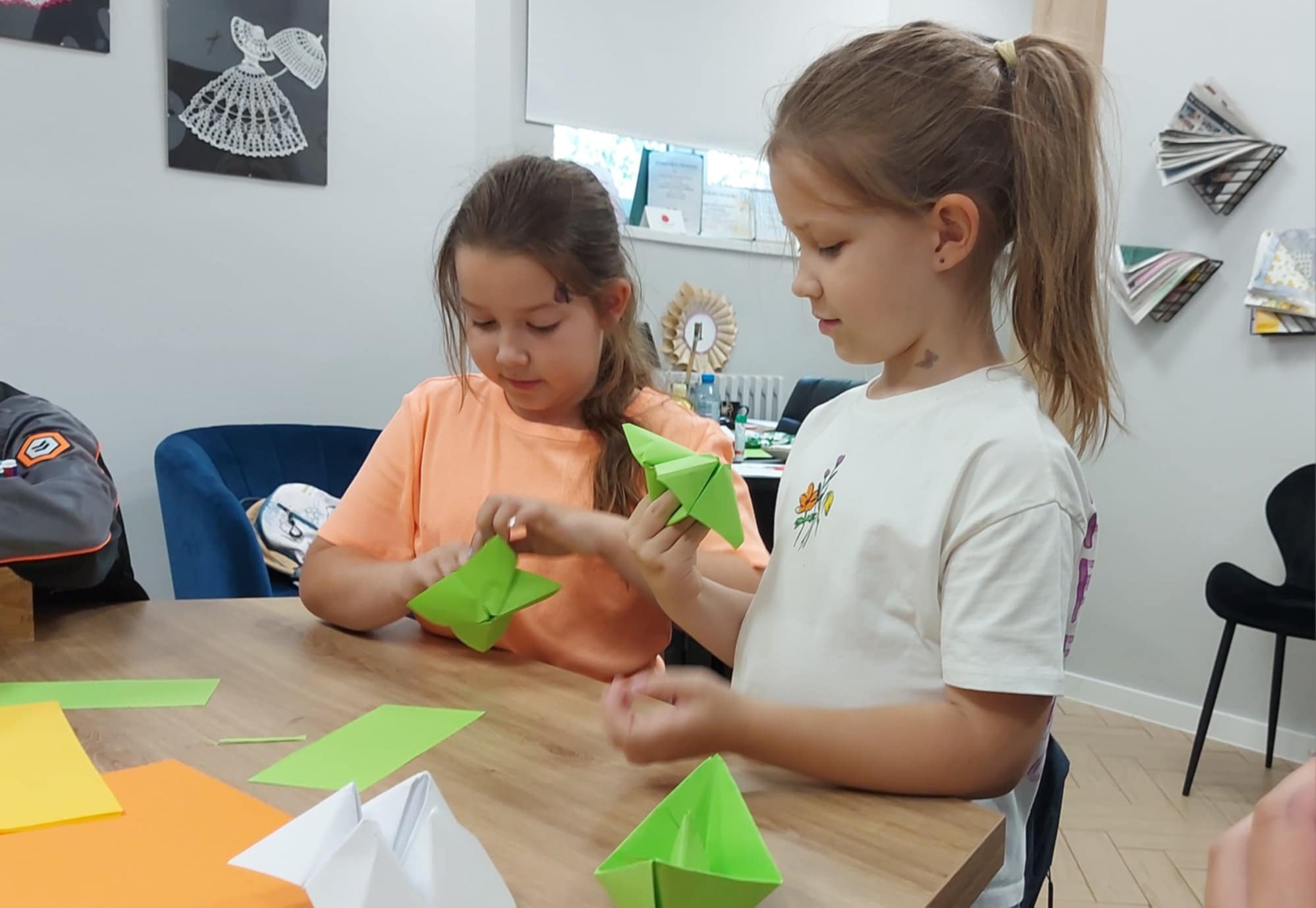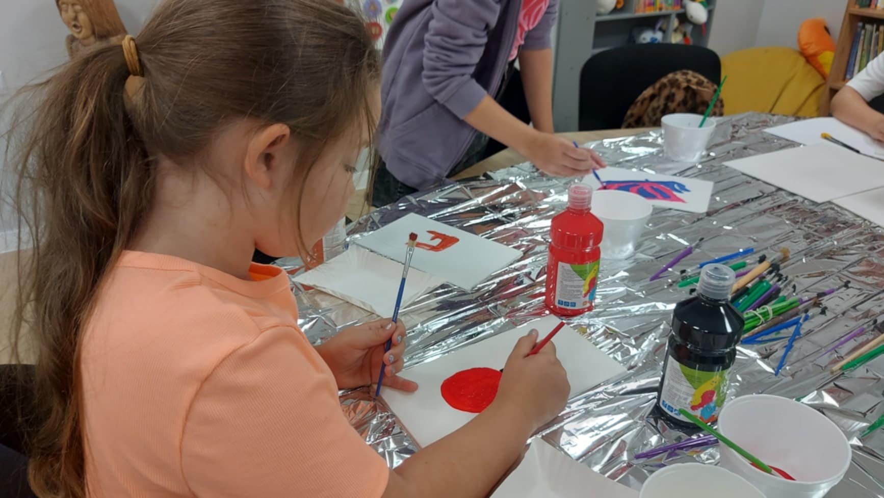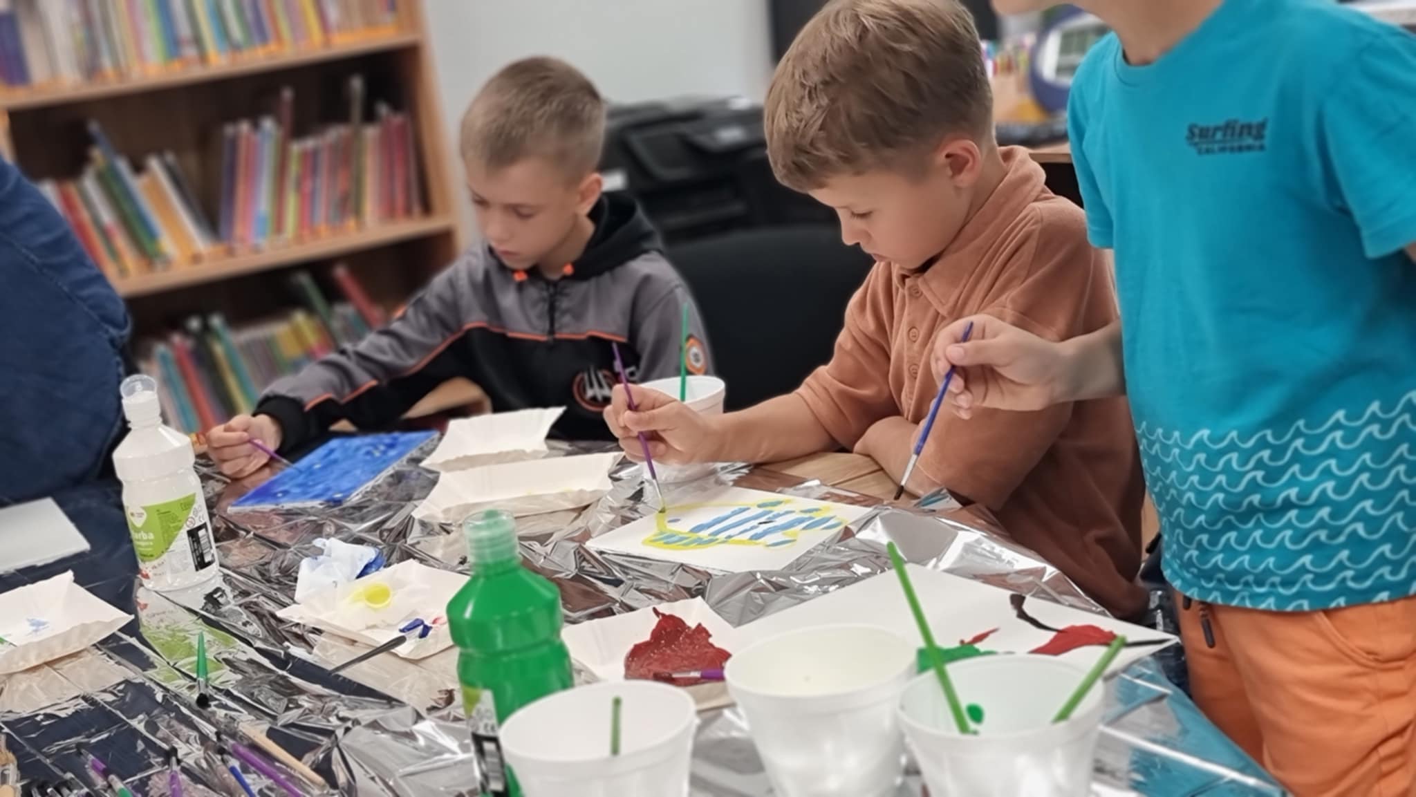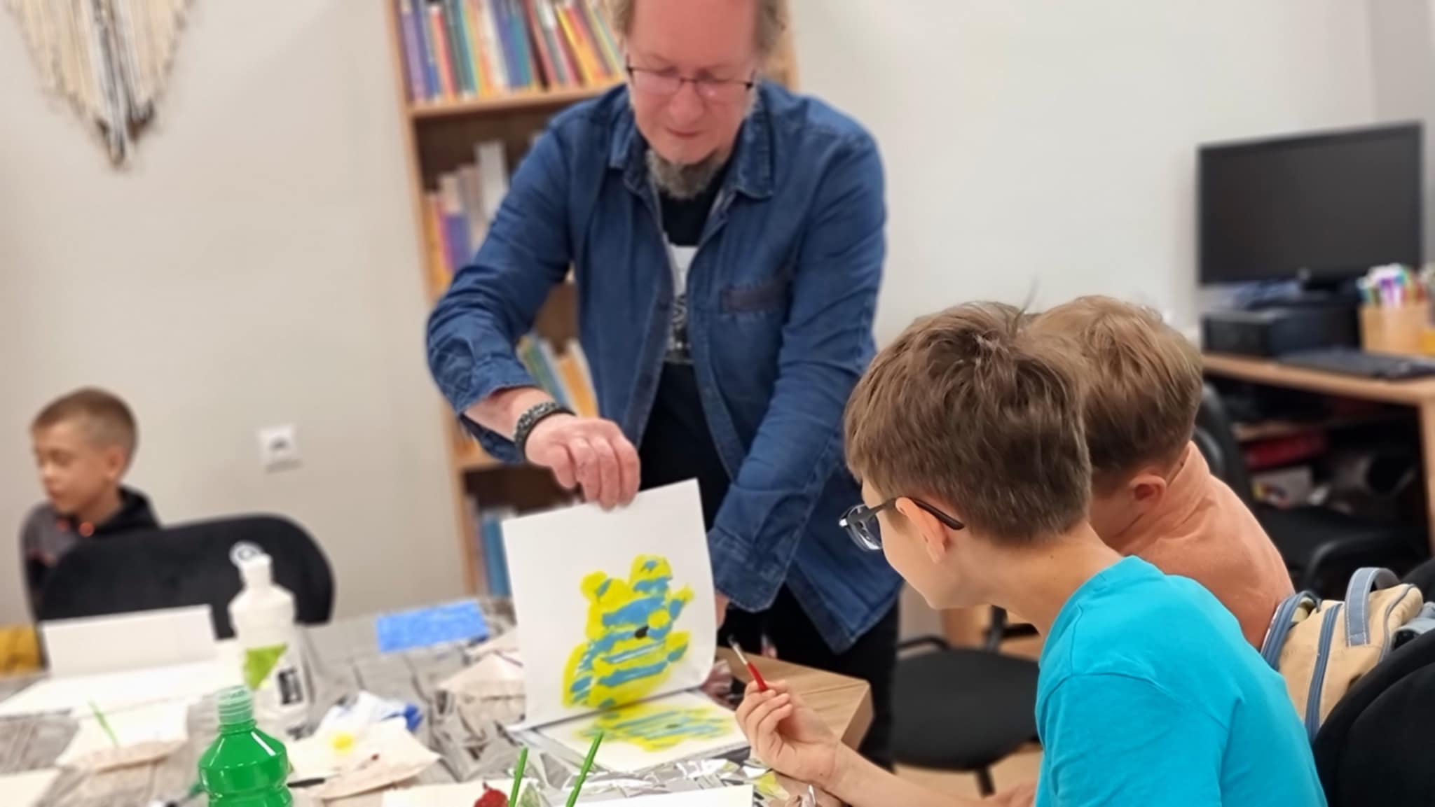 Na początek, aby lepiej się poznać i przełamać pierwsze lody, dzieci wzięły udział w integracyjnej zabawie „Pajęczynka”. Śmiechu i pozytywnej energii nie brakowało! Następnie uczestnicy przenieśli się w świat sztuki, poznając ciekawą technikę plastyczną – monotypię, czyli malowanie połączone z odbijaniem obrazu. Pod okiem naszego gościa dzieci tworzyły barwne, niepowtarzalne prace, eksperymentując z kolorami i formami. Zajęcia zakończyły się prezentacją powstałych dzieł i wspólnymi rozmowami o tym, co najbardziej się podobało. To był twórczy, pełen wrażeń początek wakacyjnych spotkań w bibliotece.