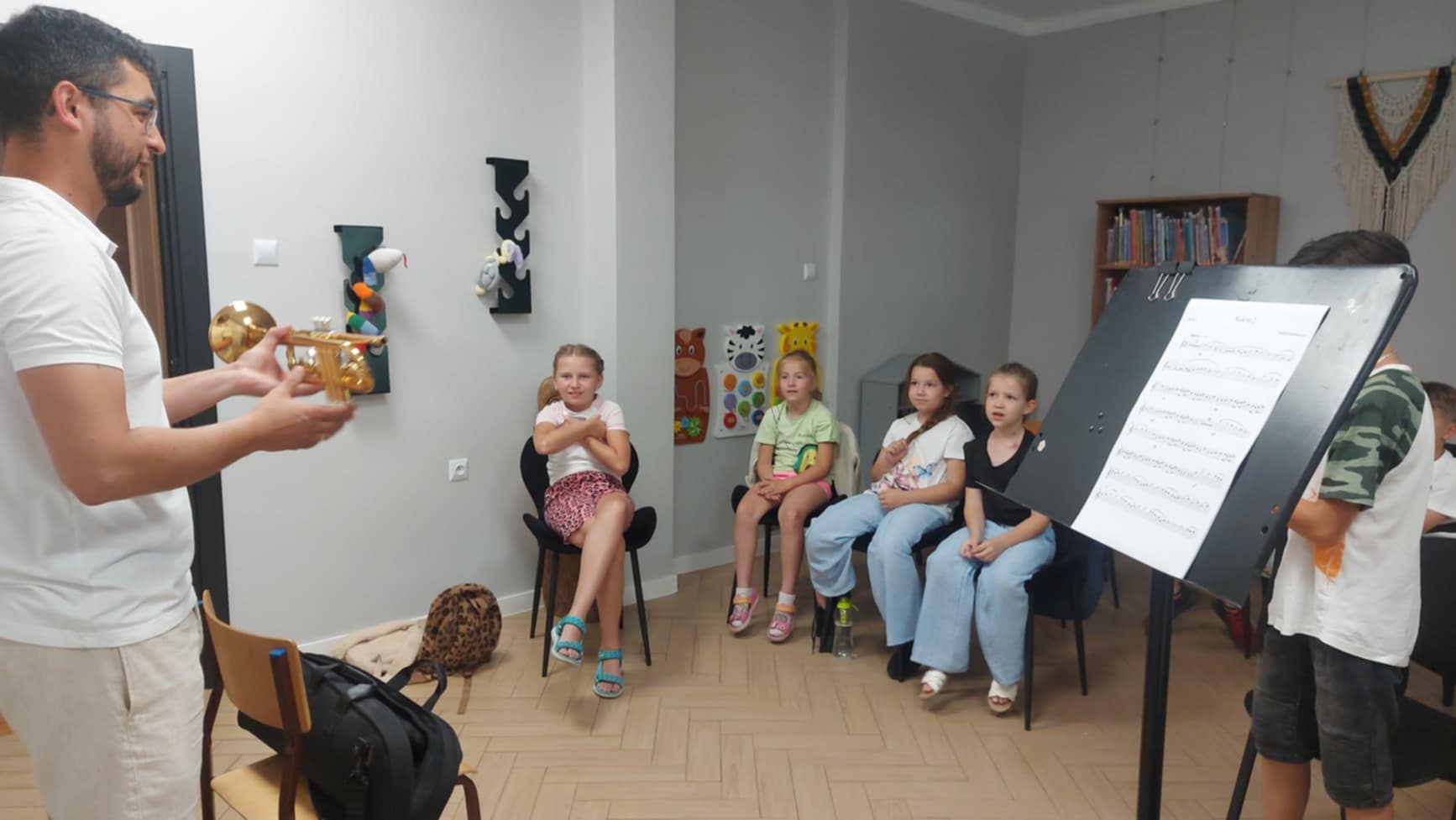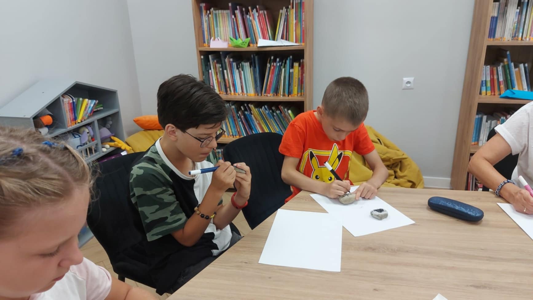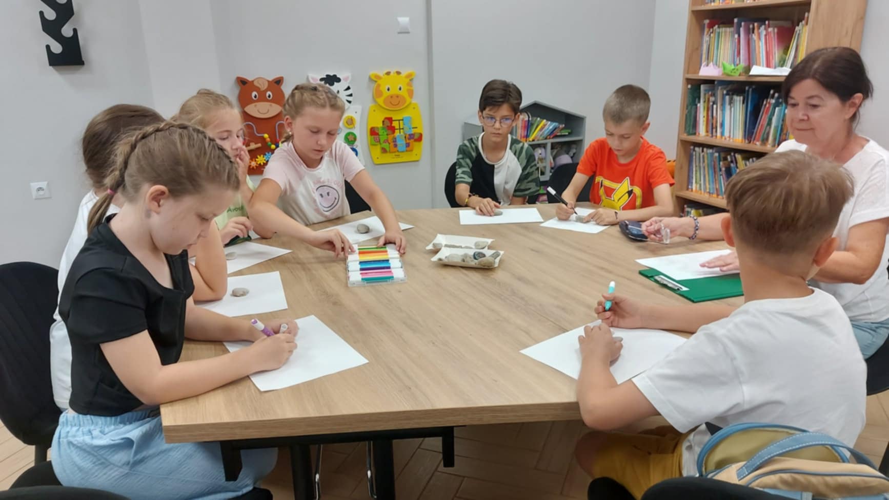 Drugi dzień wakacyjnych zajęć w Filii nr 1 upłynął w twórczej i radosnej atmosferze. Spotkanie rozpoczęła Jolanta Pawlak, która przeczytała dzieciom bajkę terapeutyczną pt. "Kasia i lato w mieście" . Bohaterka opowieści, z różnych powodów, nie mogła wyjechać na wakacje i musiała spędzić je w mieście, co stało się punktem wyjścia do rozmów o tym, jak ciekawie i radośnie spędzać czas w miejscu zamieszkania. Następnie uczestnicy sięgnęli po kolorowe flamastry i ozdabiali nimi kamyki w ramach inicjatywy #kamyczki. Po zakończeniu pracy małe dzieła zostały rozmieszczone podczas wspólnego spaceru w różnych zakątkach okolicy, aby mogły cieszyć innych przechodniów. Druga część dnia należała do muzyki. Maciej Kowalski, kapelmistrz Gminnej Orkiestry Dętej z Czernic Borowych, wraz z muzykami orkiestry poprowadził zajęcia, podczas których dzieci wzięły udział w quizie muzycznym. Była to doskonała okazja do poznania instrumentów dętych, muzycznych ciekawostek i wspólnej zabawy dźwiękiem. Spotkanie miało na celu propagowanie kultury muzycznej wśród najmłodszych i pokazało, że sztuka – zarówno plastyczna, jak i muzyczna – może być doskonałym sposobem na spędzenie wakacyjnego dnia.