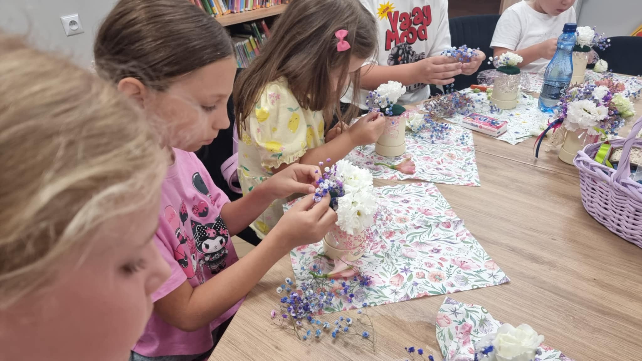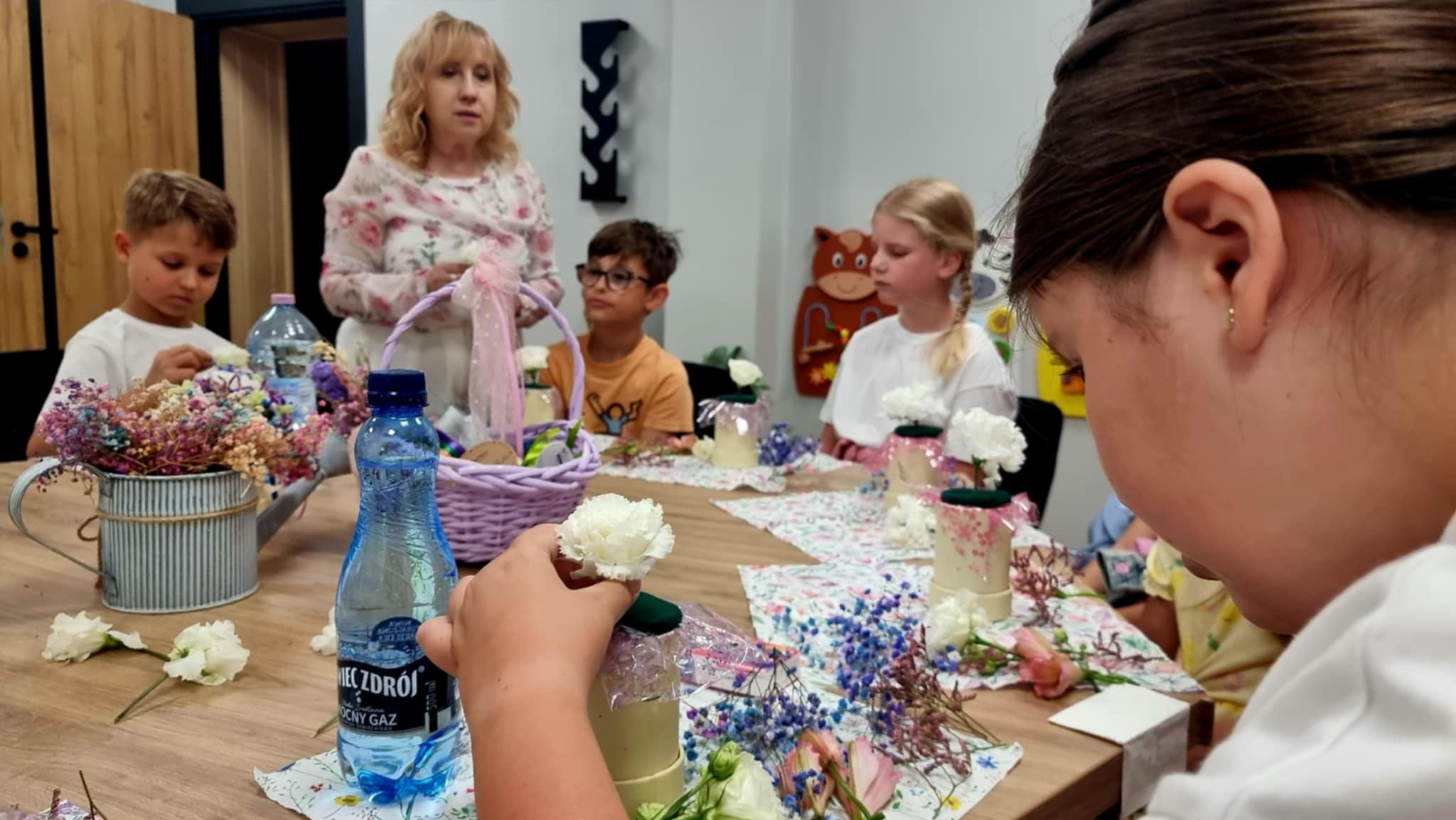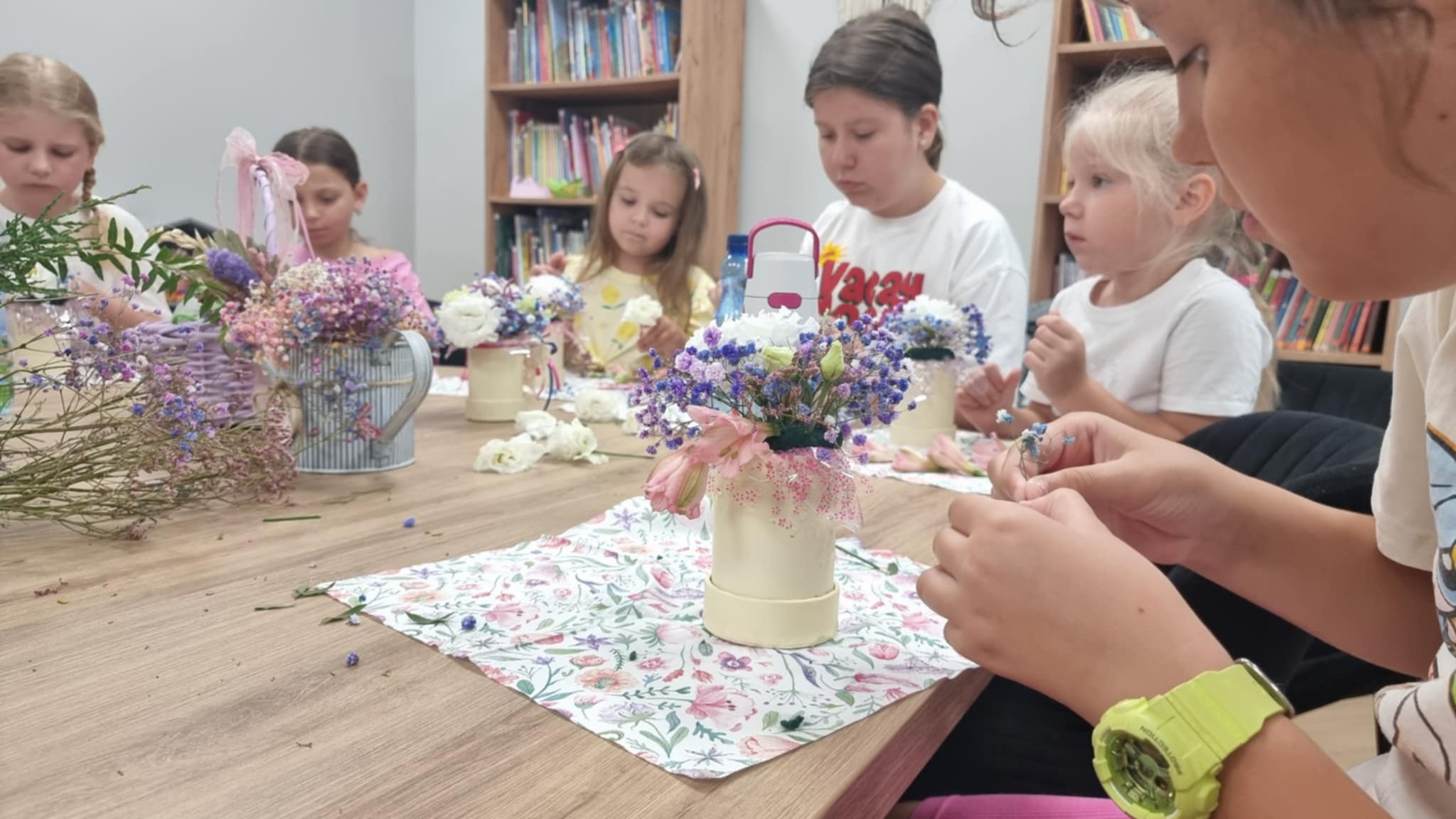 Dzisiejszy dzień wakacyjnych zajęć w Filii nr 1 upłynął w atmosferze twórczej zabawy i kontaktu z naturą. Dzieci miały okazję poznać tajniki florystyki, wykonując własne kompozycje kwiatowe w boxach. Na początku uczestnicy dowiedzieli się, czym jest gąbka florystyczna i dlaczego jej namoczenie jest tak ważnym etapem przygotowań. Następnie przystąpili do sortowania i przycinania kwiatów, ucząc się, jak odpowiednio je przygotować, aby dłużej zachowały świeżość i piękny wygląd. Najwięcej radości sprawiła jednak część praktyczna – dobieranie i układanie roślin w taki sposób, aby tworzyły harmonijną, estetyczną całość. Dzięki zajęciom dzieci nie tylko rozwijały swoją kreatywność i zmysł estetyczny, ale także zdobyły nowe umiejętności praktyczne. Każdy uczestnik mógł zabrać do domu własnoręcznie wykonaną kompozycję, która stała się piękną pamiątką z dzisiejszych warsztatów.