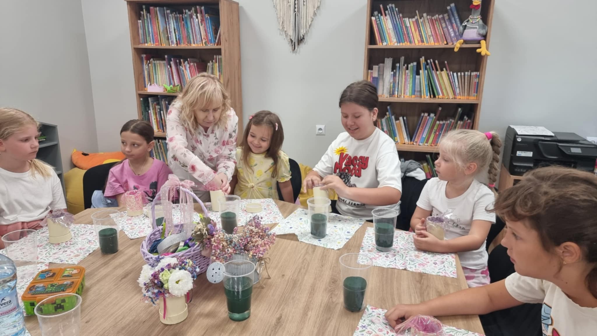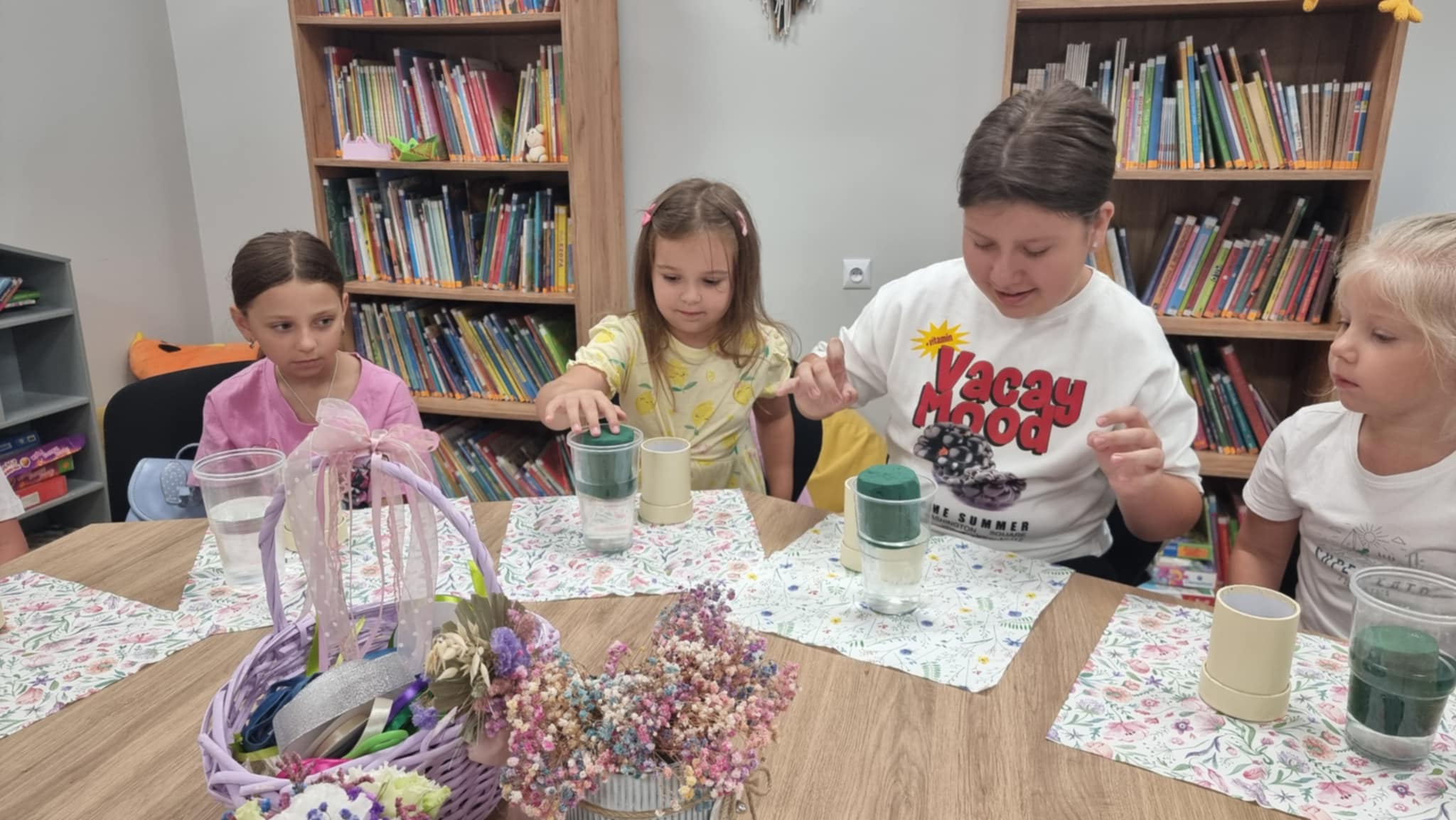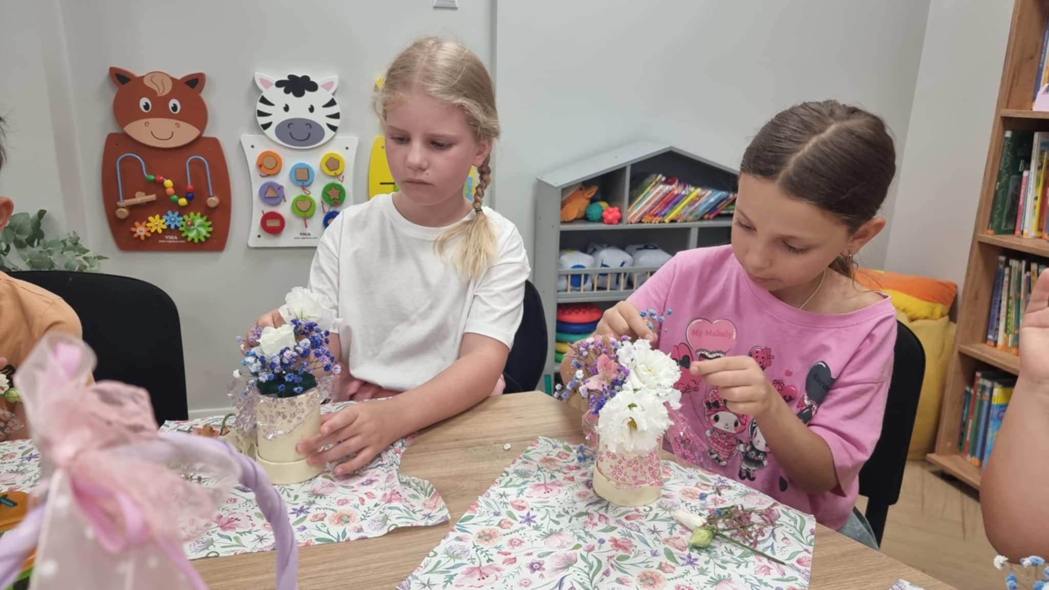 Dzisiejszy dzień wakacyjnych zajęć w Filii nr 1 upłynął w atmosferze twórczej zabawy i kontaktu z naturą. Dzieci miały okazję poznać tajniki florystyki, wykonując własne kompozycje kwiatowe w boxach. Na początku uczestnicy dowiedzieli się, czym jest gąbka florystyczna i dlaczego jej namoczenie jest tak ważnym etapem przygotowań. Następnie przystąpili do sortowania i przycinania kwiatów, ucząc się, jak odpowiednio je przygotować, aby dłużej zachowały świeżość i piękny wygląd. Najwięcej radości sprawiła jednak część praktyczna – dobieranie i układanie roślin w taki sposób, aby tworzyły harmonijną, estetyczną całość. Dzięki zajęciom dzieci nie tylko rozwijały swoją kreatywność i zmysł estetyczny, ale także zdobyły nowe umiejętności praktyczne. Każdy uczestnik mógł zabrać do domu własnoręcznie wykonaną kompozycję, która stała się piękną pamiątką z dzisiejszych warsztatów.