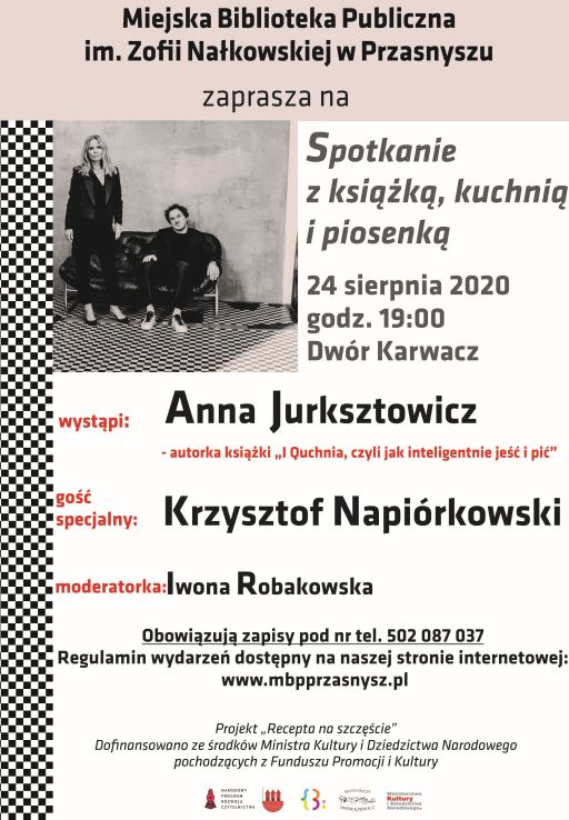 Miejska Biblioteka Publiczna i Dwór Karwacz zapraszają na „Spotkanie z książką, kuchnią i piosenką” - wystąpi: Anna Jurksztowicz – wokalistka i producentka muzyczna autorka książki „I Quchnia, czyli jak inteligentnie jeść i pić" oraz gość specjalny Krzysztof Napiórkowski - wokalista, kompozytor, autor tekstów, producent muzyczny, multiinstrumentalista 24 sierpnia (poniedziałek) godz.19.00 Dwór Karwacz (Karwacz 43)