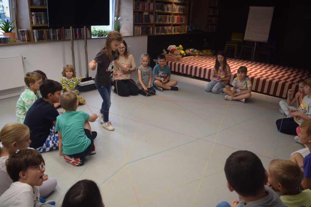 Pierwszą atrakcją była gra „Pajęczyna”, która polegała na stworzeniu pajęczej sieci. Dzieci usiadły w obszernym kółku. Następnie osoba rozpoczynająca trzymała w ręku kłębek wełny, przedstawiała się, po czym cały czas trzymając swój odcinek nici podawała ją rzucając innej, wybranej przez siebie osobie. Dzięki temu, uczestnicy mogli lepiej poznać nie tylko siebie nawzajem ale również swoje zainteresowania.