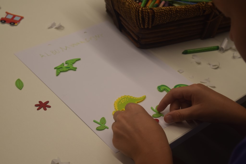 Druga część zajęć poświęcona była warsztatom scrapbookingu. Scrapbooking to technika ozdabiania kartek okolicznościowych, pudełek, albumów ze zdjęciami, notesów i innych przedmiotów użytkowych za pomocą kolorowych papierów, wzorów, stempli, gotowych kształtów i szablonów, tasiemek, koronek, gazet, guzików i wielu innych materiałów.