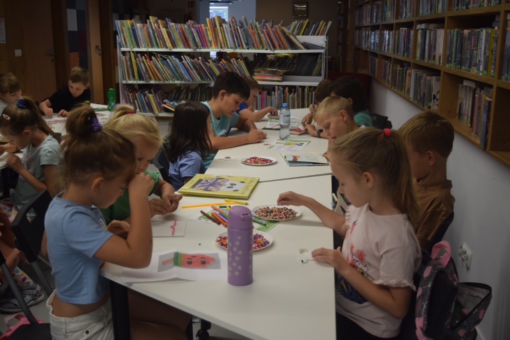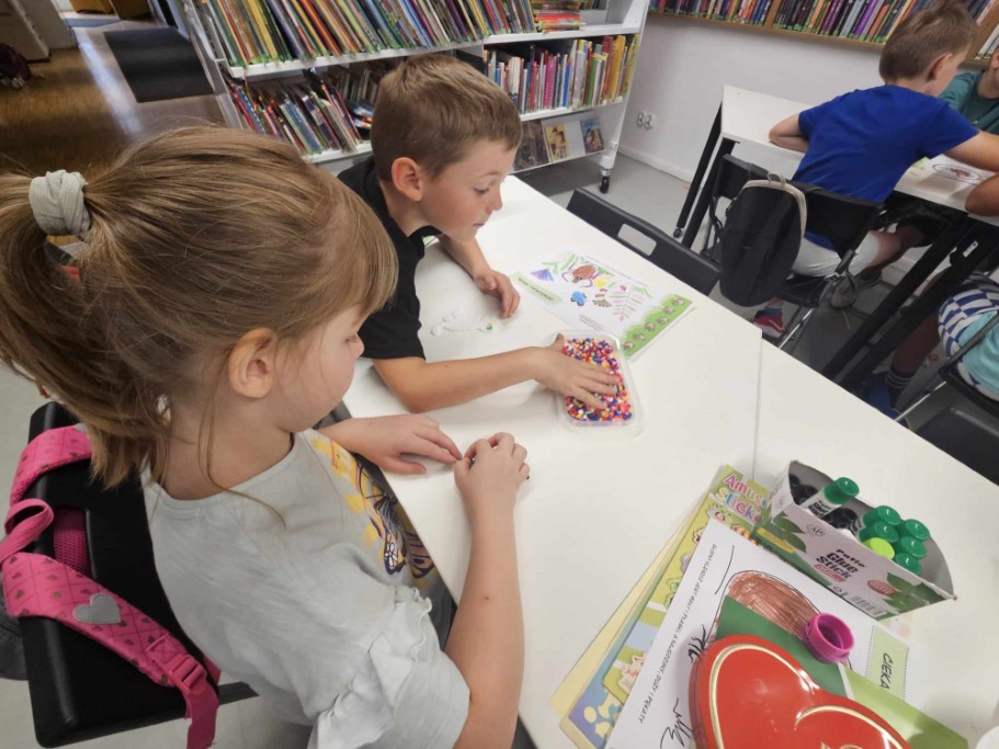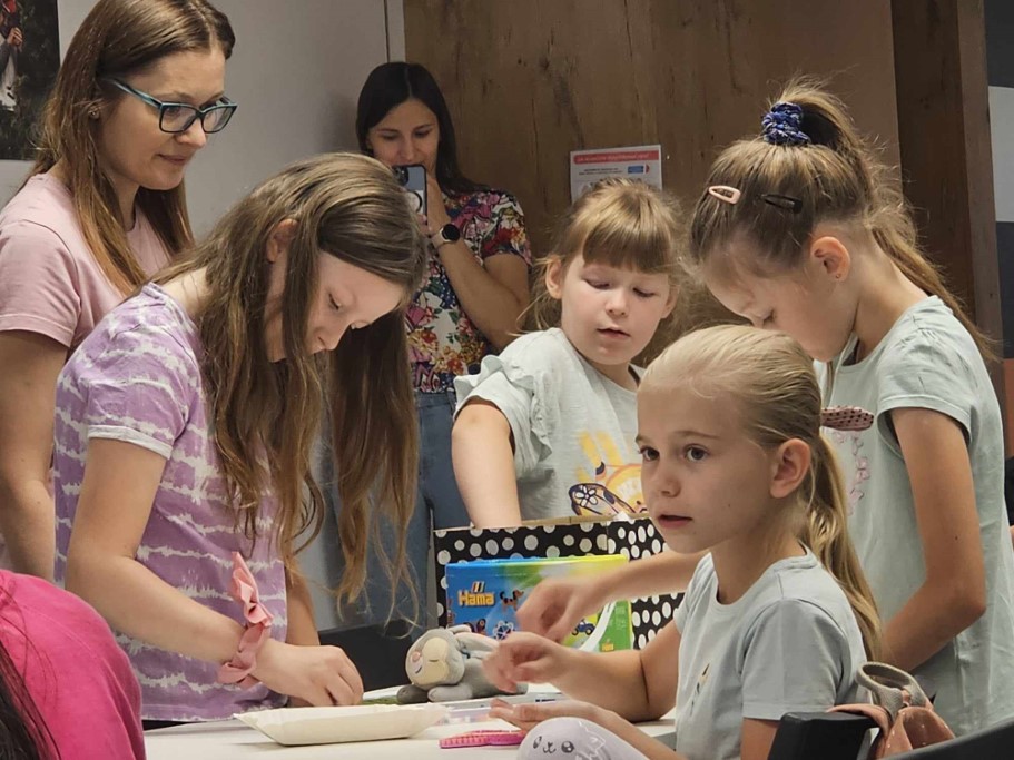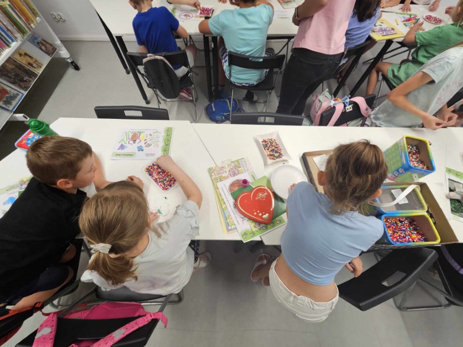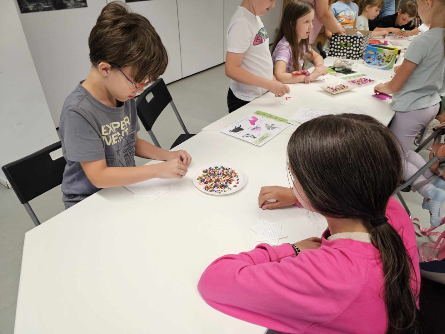 Druga część zajęć poświęcona była tworzeniu niepowtarzalnych wzorów przy użyciu koralików HAMA, których cechą charakterystyczną jest możliwość układania dowolnych kompozycji aż do momentu ich utrwalenia poprzez zaprasowanie. Dzieci wykazały się ogromną kreatywnością oraz skupieniem podczas tworzenia wybranych przez siebie kształtów.