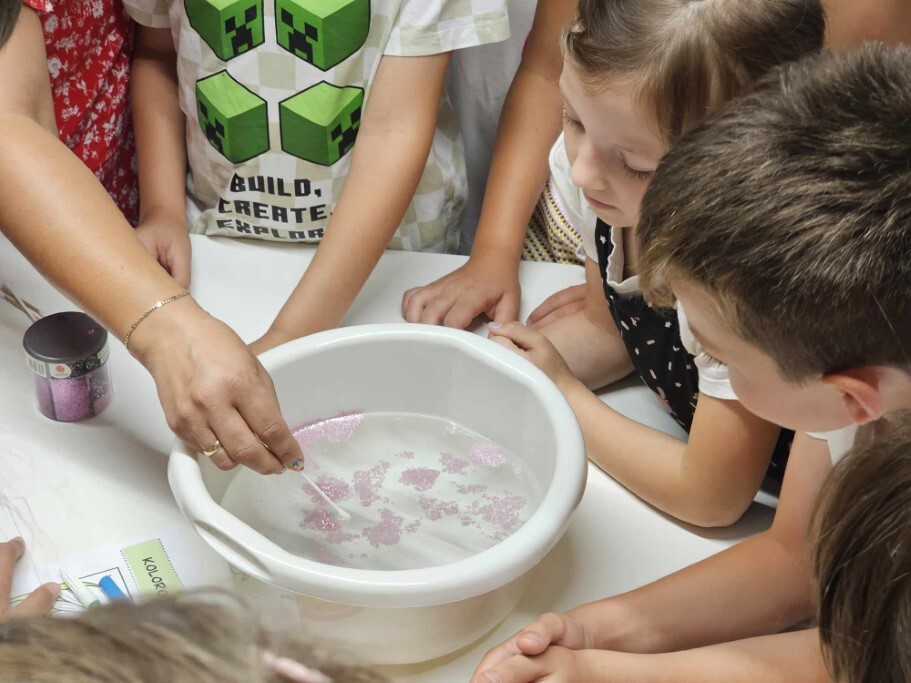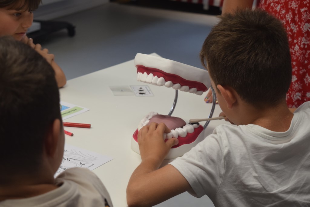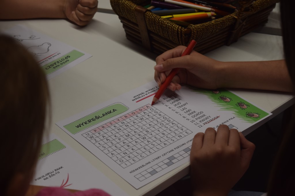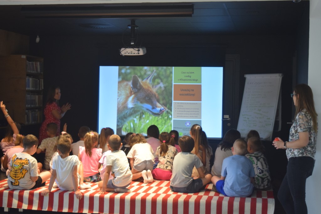 Nasz gość opowiadał dzieciom o zadaniach sanepidu, zasadach bezpieczeństwa podczas wypoczynku letniego nad wodą, w górach, czy też lesie. Poruszony też został temat kleszczy, jak uchronić się przed ich atakiem i co zrobić jeśli taki wbije się w naszą skórę. Pani Marta w sposób bardzo przystępny przekazała te wszystkie informację naszym uczestnikom. Dodatkową atrakcją była możliwość wzięcia udziału w doświadczeniu, które pokazywało dlaczego tak ważne jest używanie mydła podczas mycia rąk.