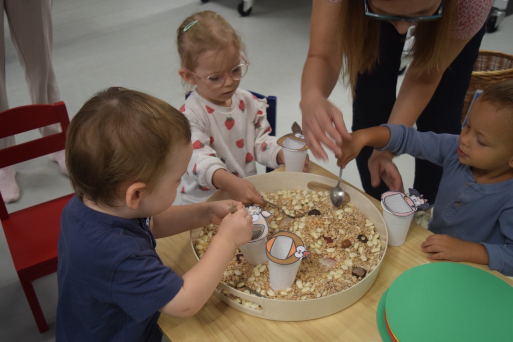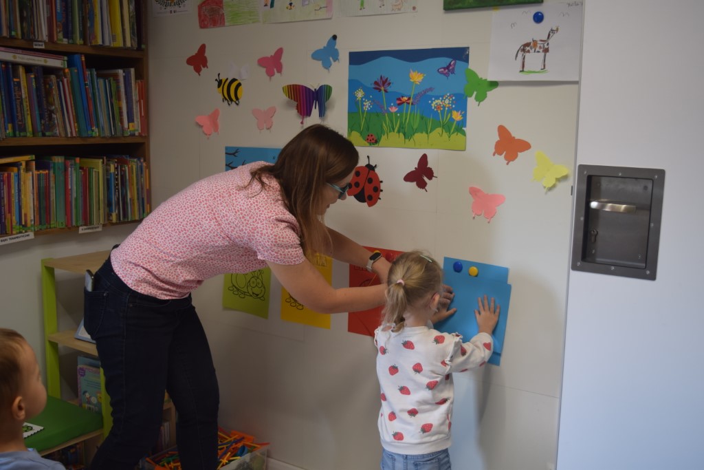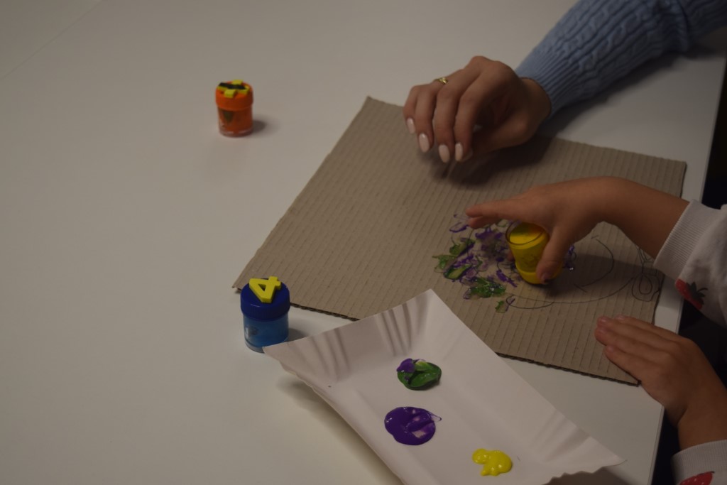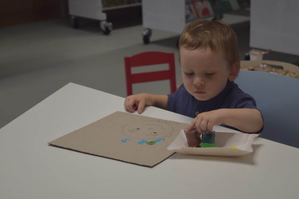 Z okazji zbliżającego się Światowego Dnia Kropki, motywem przewodnim była oczywiście kropka. Na początku zajęć maluszki wysłuchały książeczki dotykam, poznaję pt. ,,Łąka’’. ,.Następnie ,, ubrały ‘’ dużą biedronkę w kropeczki. Przysypywanie mieszanki fasoli, grochu, płatków owsianych przyniosło dużo doznań sensorycznych naszym maluszkom. Podsumowaniem zajęć była praca plastyczna , dzieci z pomocą mam wykonały kolorowe rysunki wykorzystując farby i pieczątki.