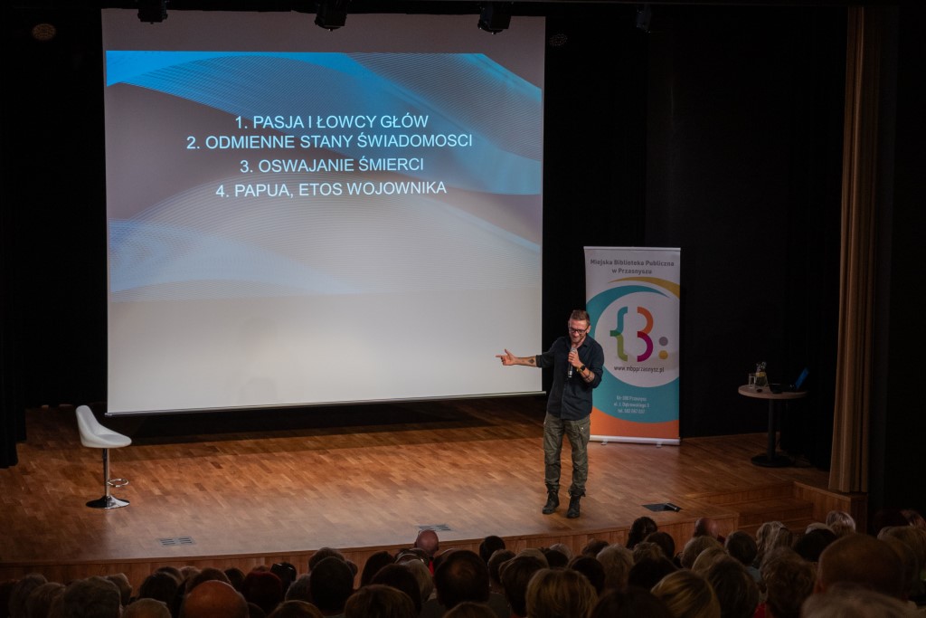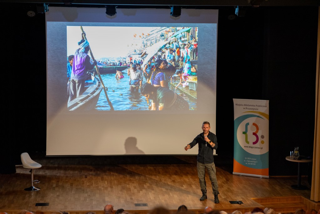 Po głosowaniu licznie zgromadzona publiczność wybrała jeden z czterech zaproponowanych przez Gościa tematów. Wybór padł na „Oswajanie śmierci”. To prawie dwugodzinne spotkanie minęło niczym krótka chwila. Przemek Kossakowski opowiadał w niezwykle ciekawy i zajmujący sposób o swojej podróży do Waranasi, o kulturze śmierci w Indiach, o tym jak ludzie tam przygotowują do tego siebie i swoich bliskich.
