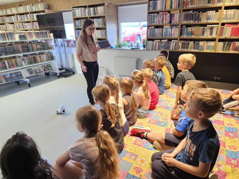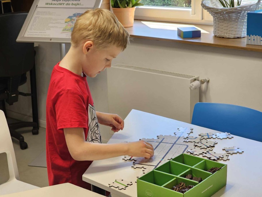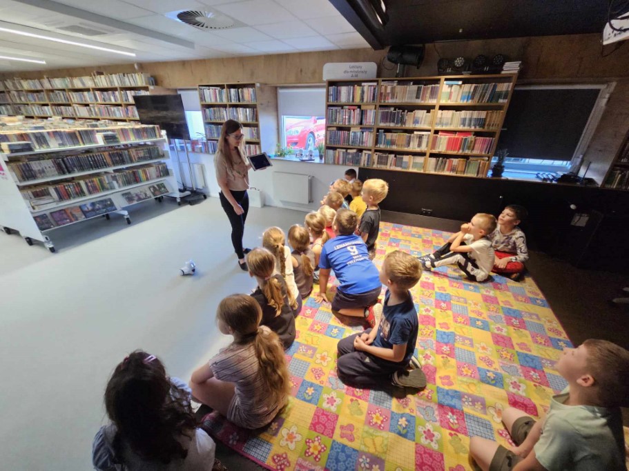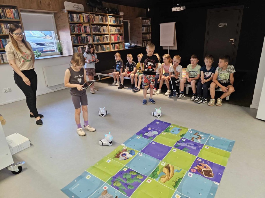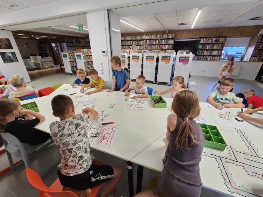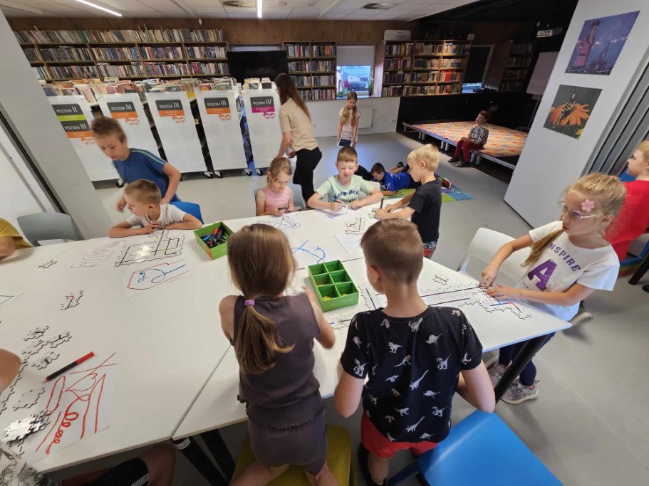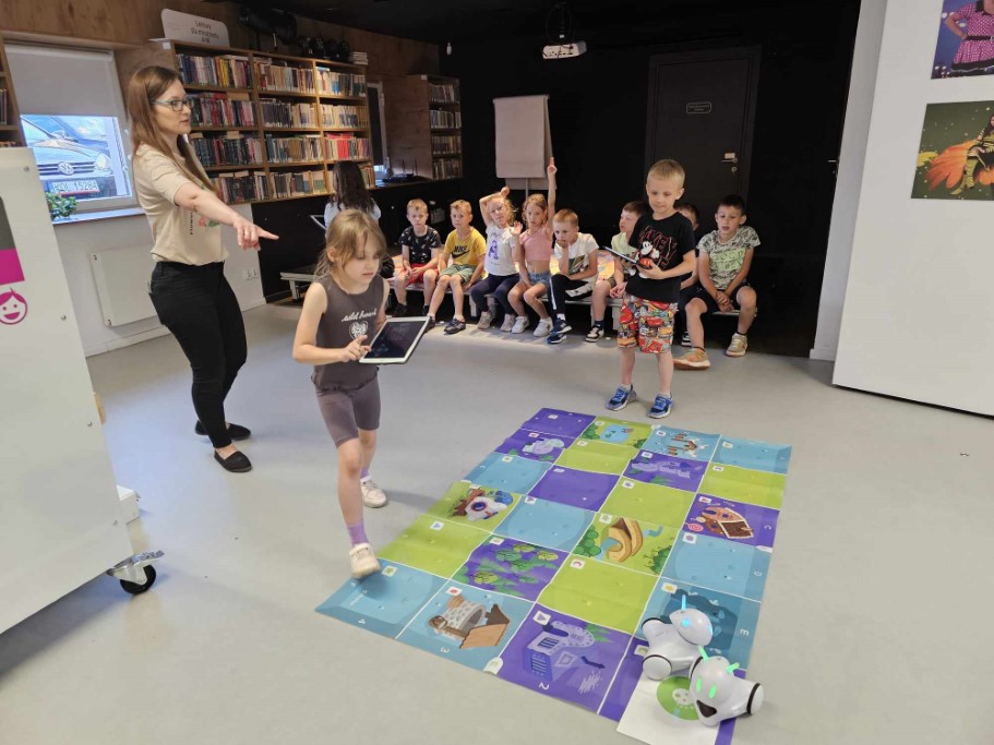 Podczas zajęć rozmawialiśmy o programowaniu, co to znaczy, co możemy programować. Dzieci poznały nasze biblioteczne roboty: Photona i Ozobota. Photon jest to polski robot edukacyjny, którego zadaniem jest wprowadzenie użytkowników w świat nowych technologii. Dzieci miały za zadanie zaprogramować roboty w ten sposób, aby przejechały po wyznaczonej drodze. Natomiast Ozoboty odpowiednio zakodowane poruszały się po wytyczonej trasie z puzzli, którą dzieci wcześniej sami projektowali.