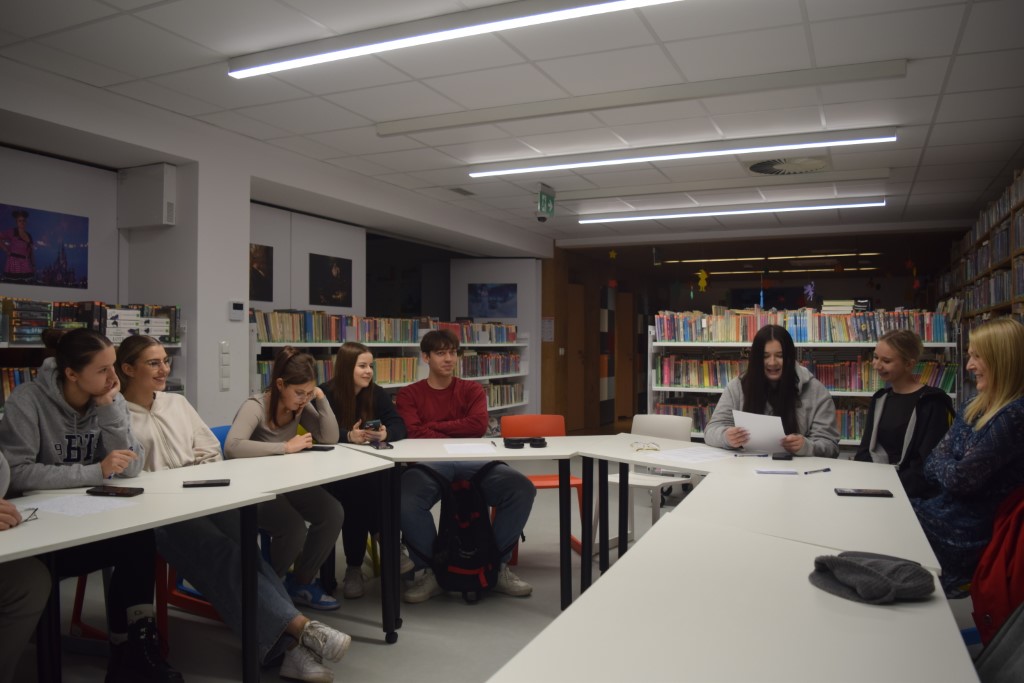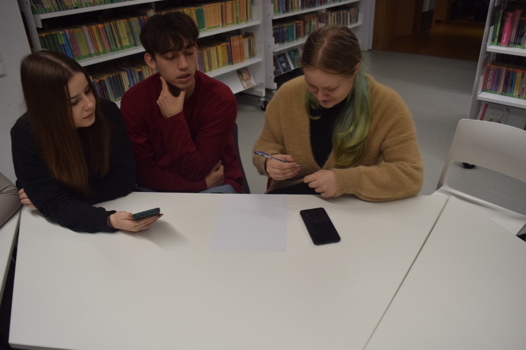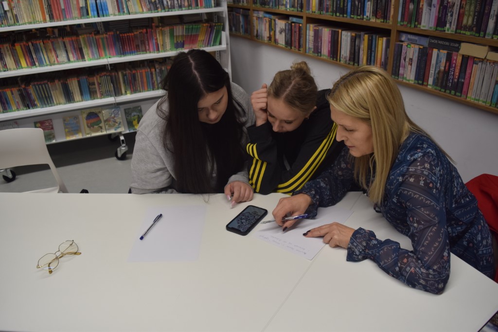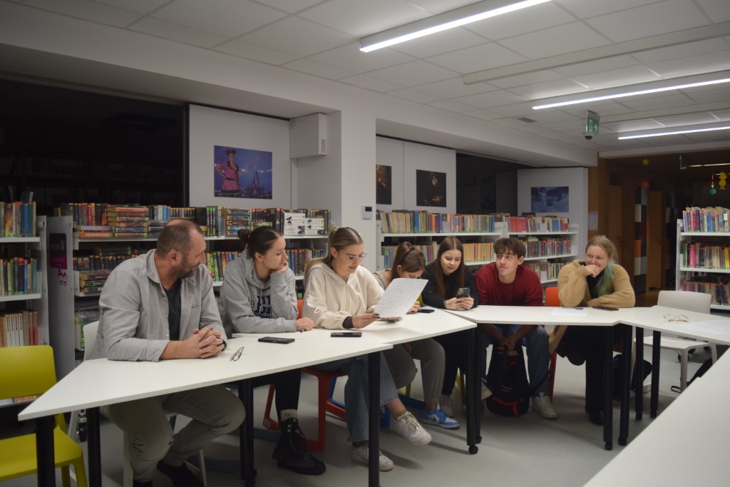 Praca nad historiami była pełna śmiechu, zaangażowania i wymiany pomysłów. Atmosfera w bibliotece była niezwykle twórcza – między regałami z książkami powstawały opowieści o tajemniczych odkryciach, magicznych księgach i niezwykłych wydarzeniach, które mogłyby przydarzyć się tylko w bibliotece. Każda grupa wykazała się pomysłowością. W swoich opowiadaniach uczestnicy doskonale wczuli się w role literackich postaci, w które wcielili się podczas sesji zdjęciowej. Zespoły wykazały się nie tylko kreatywnością, ale również umiejętnością współpracy i korzystania z przypadkowych wskazówek, które dostarczyły im kostki. Na zakończenie wszystkie opowiadania zostały odczytane przed publicznością. Jury miało trudne zadanie, by wyłonić zwycięzców – każda historia była wyjątkowa. Uczestnicy udowodnili, że biblioteka to nie tylko miejsce pełne książek, ale także przestrzeń, gdzie wyobraźnia nie ma granic. Decyzją jury, z trzech prac powstało jedno opowiadanie pt. "Literacki galimatias".
