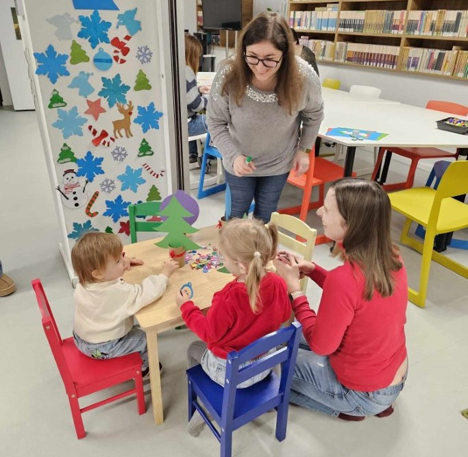 Następnie dzieci i rodzice wspólnie przystąpili do ozdabiania bombek i choinek. Kolorowe ozdoby, błyszczące elementy i różnorodne materiały plastyczne pozwoliły na stworzenie wyjątkowych dekoracji, które z pewnością upiększą domowe świąteczne drzewka. Na zakończenie zajęć każdy mógł udekorować choinkę kawałkami bibuły, co było nie tylko twórczym wyzwaniem, ale i świetną zabawą.