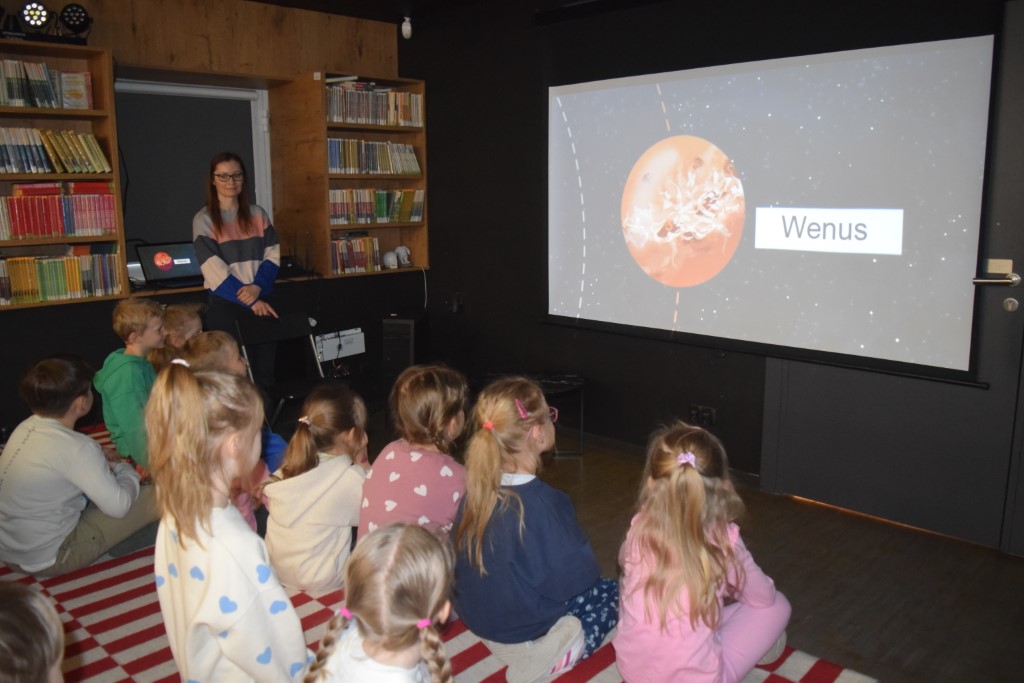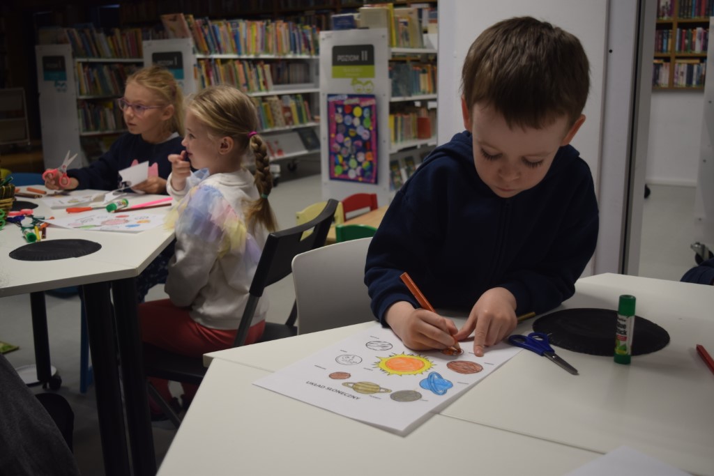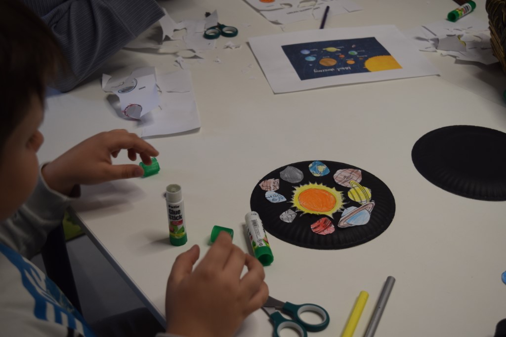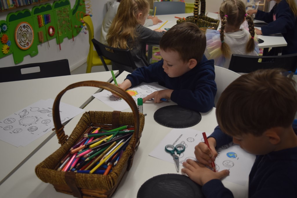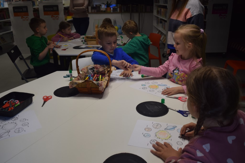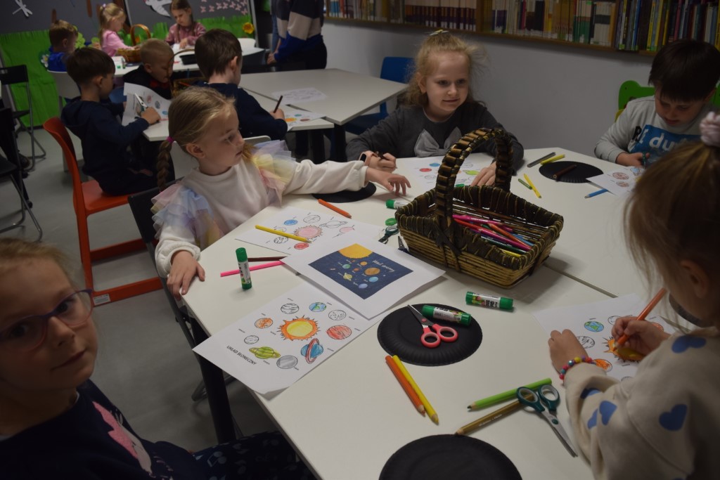 Tym razem dzieci poznawały Układ Słoneczny. Wprowadzeniem do zajęć była krótka rozmowa z dziećmi na temat ich wiedzy o kosmosie. Następnie uczestnicy obejrzeli przygotowaną prezentację o kosmosie. Dzieci poznały planety układu słonecznego tj. Merkury, Wenus, Ziemię, Mars, Jowisz, Saturn, Uran i Neptun. Na dzieci czekała wspaniała niespodzianka w postaci projektora gwiazd. Na zakończenie wykonały pracę plastyczną - makietę kosmosu z użyciem talerzyka papierowego