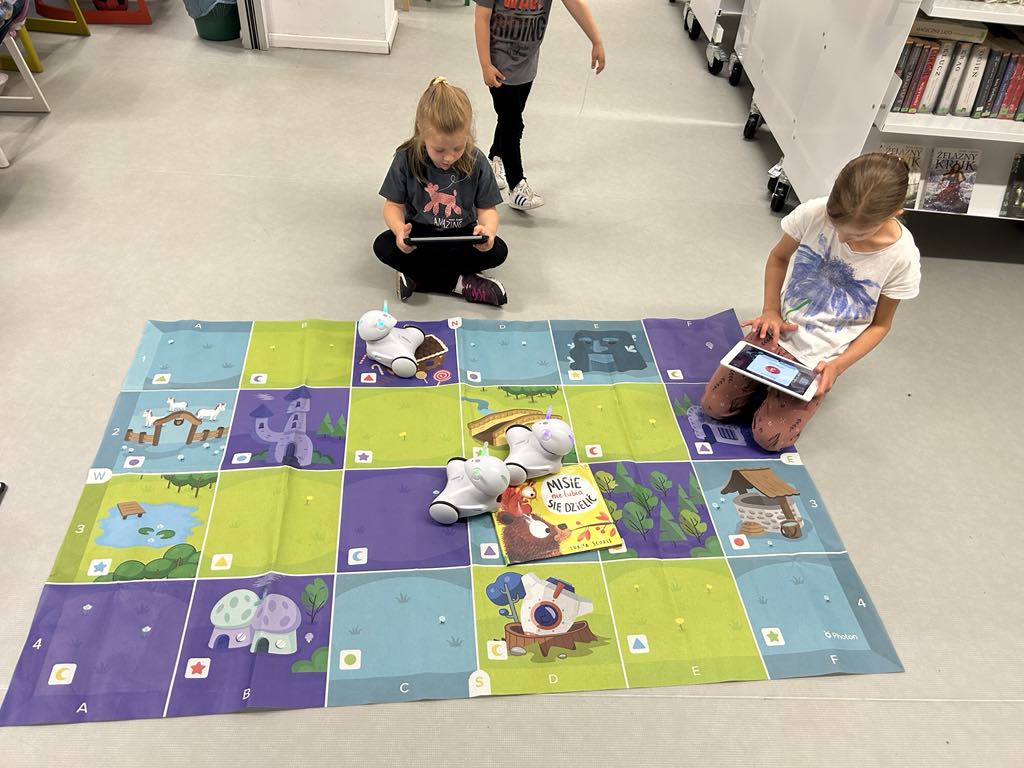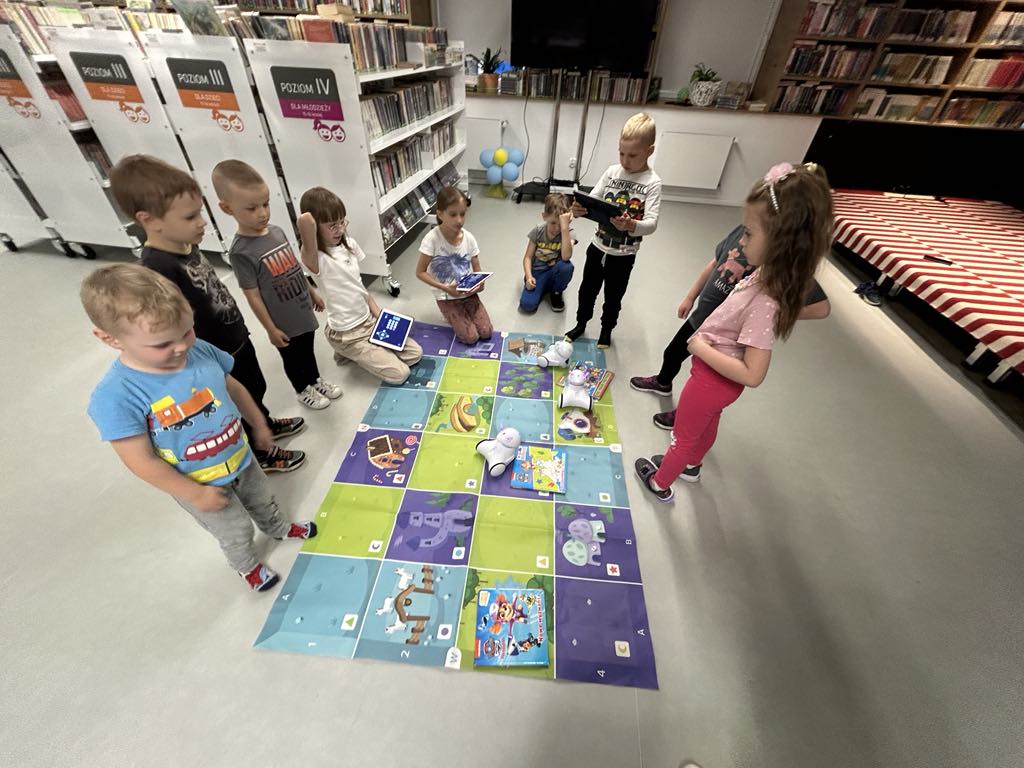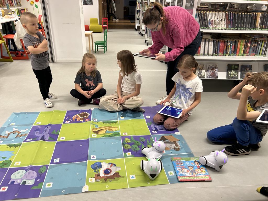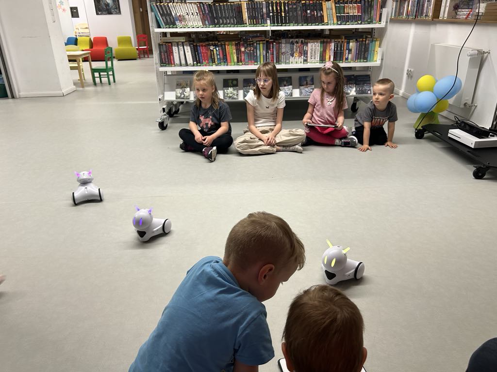 Spotkanie rozpoczęliśmy od zabaw ruchowych. Następnie podczas zajęć rozmawialiśmy o programowaniu, co to znaczy, co możemy programować. Uczestnicy poznali naszego bibliotecznego robota Photona. Mieli za zadanie zaprogramować robota w ten sposób, aby przejechał po wyznaczonej drodze, wydał konkretny dźwięk czy zmieniał kolory. Następnie programowali robota w ten sposób, aby po wyznaczonej trasie dojechał do wskazanego tytułu książki.