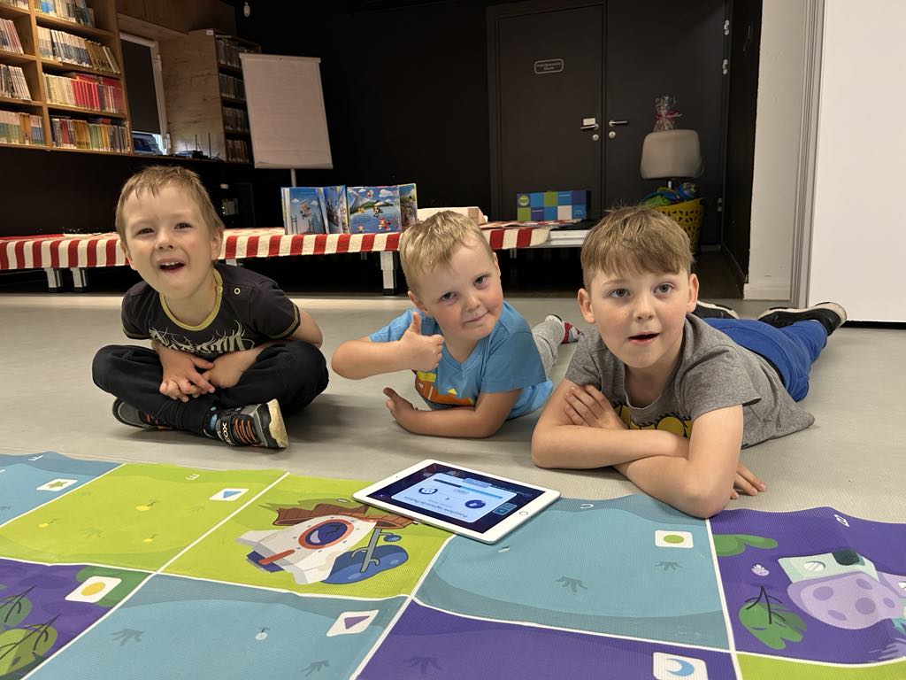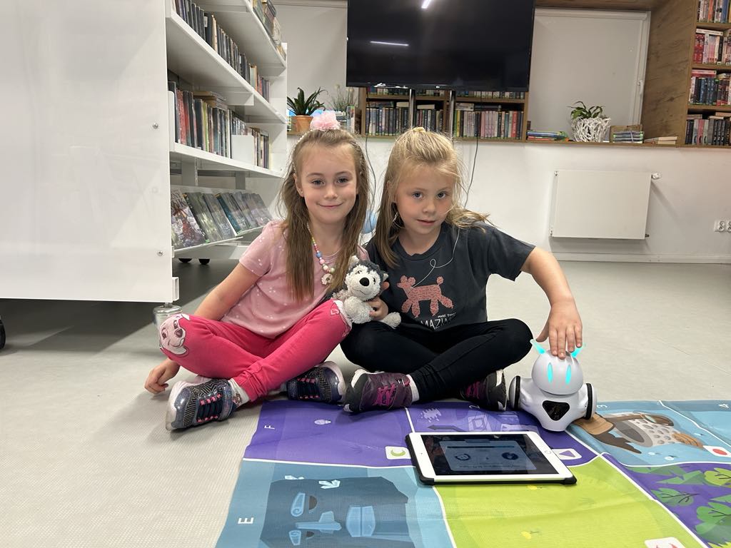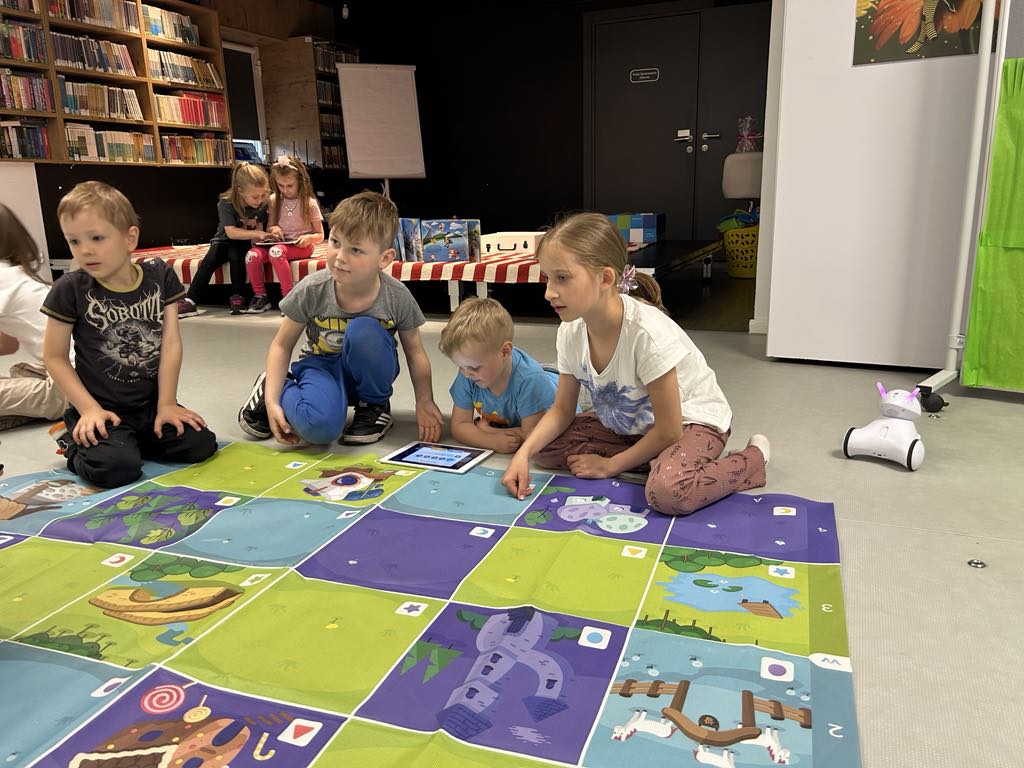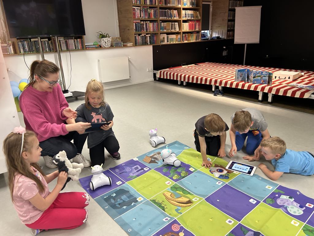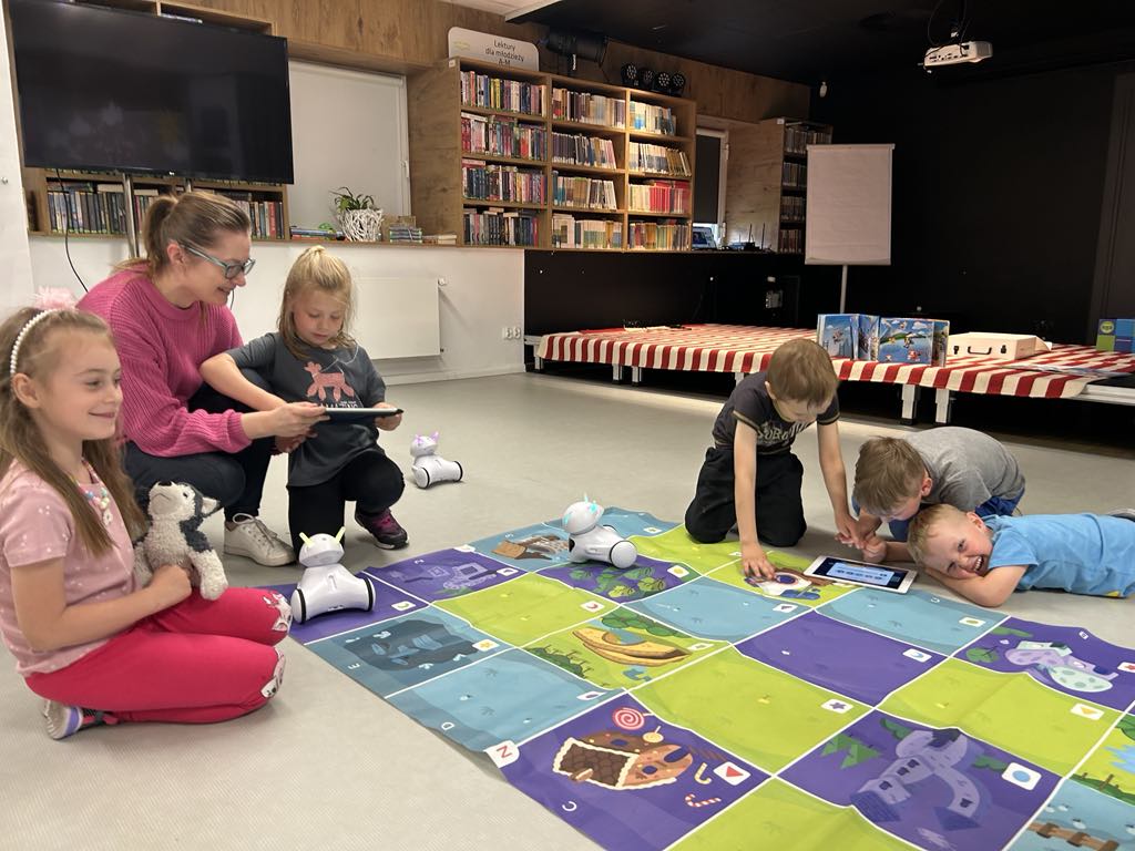 Spotkanie rozpoczęliśmy od zabaw ruchowych. Następnie podczas zajęć rozmawialiśmy o programowaniu, co to znaczy, co możemy programować. Uczestnicy poznali naszego bibliotecznego robota Photona. Mieli za zadanie zaprogramować robota w ten sposób, aby przejechał po wyznaczonej drodze, wydał konkretny dźwięk czy zmieniał kolory. Następnie programowali robota w ten sposób, aby po wyznaczonej trasie dojechał do wskazanego tytułu książki.