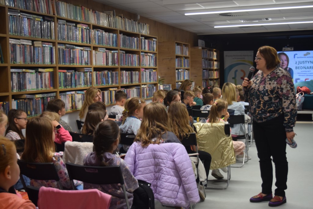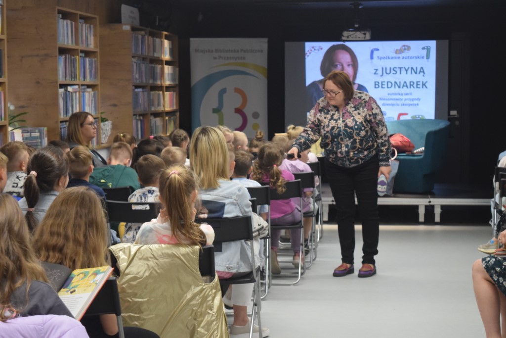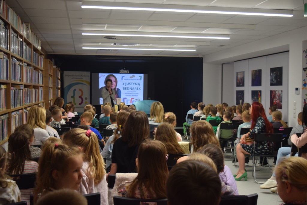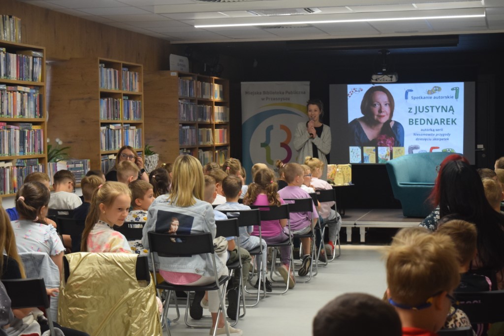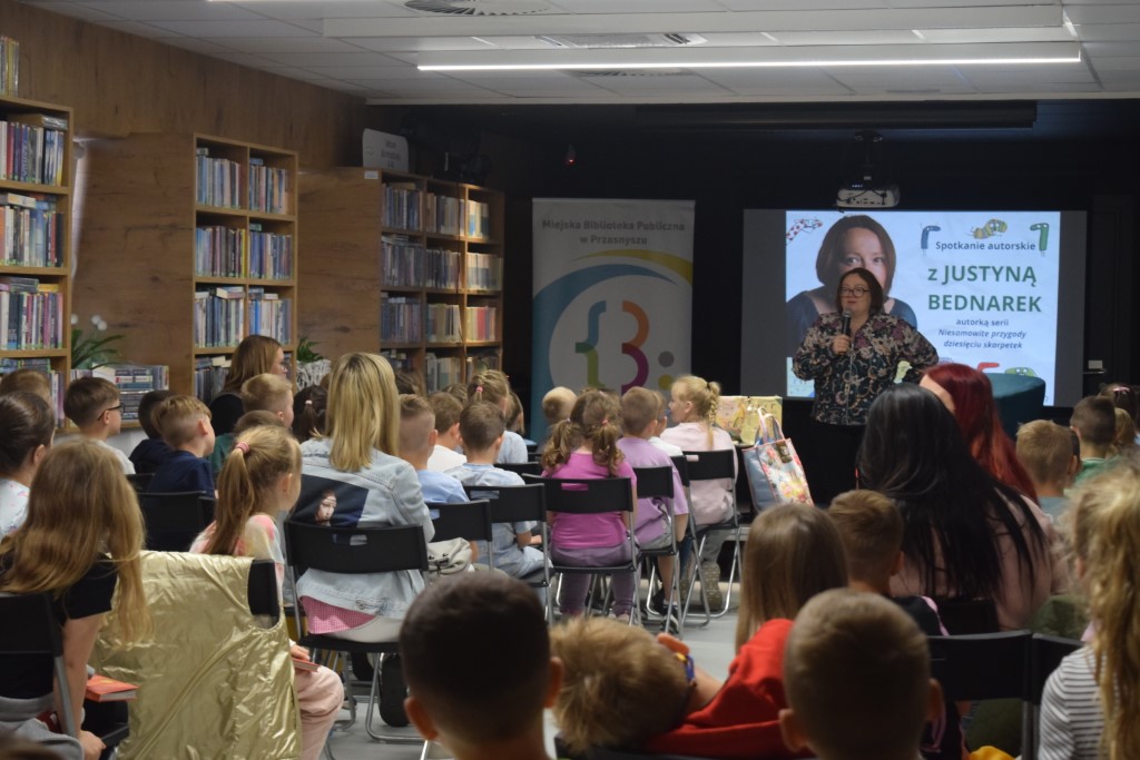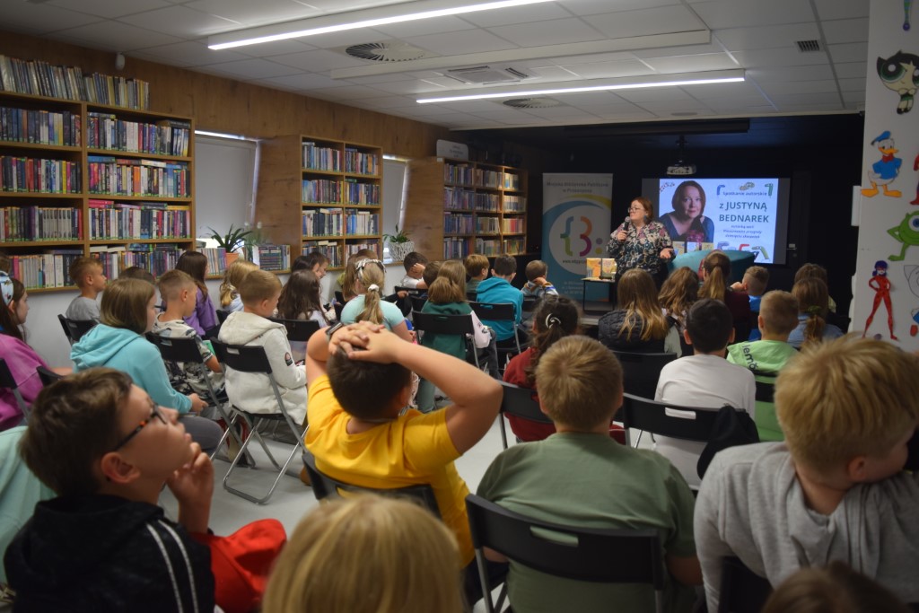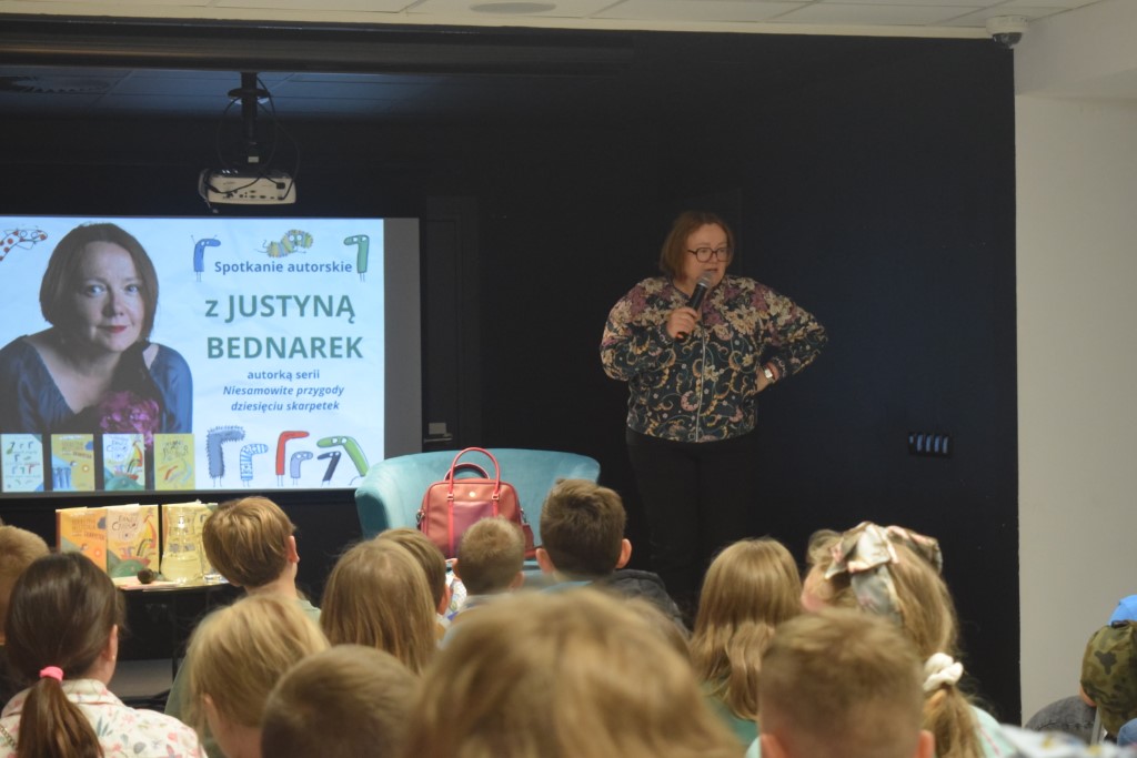 Uczniowie klas I–III ze Szkół Podstawowych Nr 1 i Nr 3 mieli niecodzienną okazję uczestniczyć w spotkaniu autorskim z Justyną Bednarek – znaną i cenioną pisarką książek dla dzieci, a przede wszystkim autorką uwielbianych przez młodych czytelników "Niesamowitych przygód dziesięciu skarpetek".