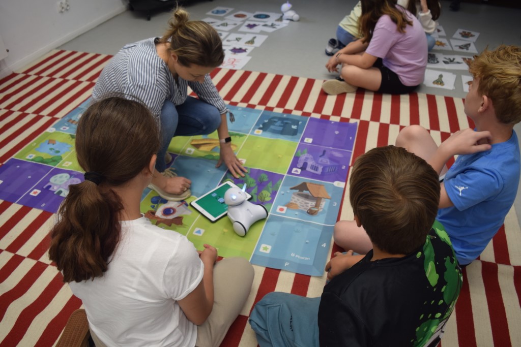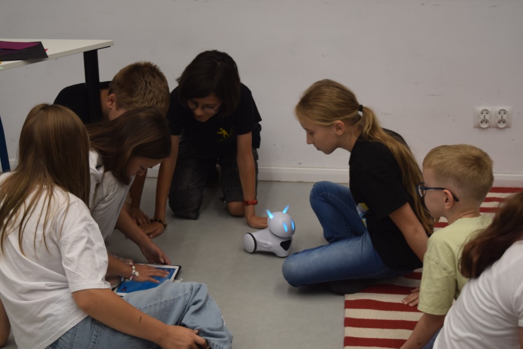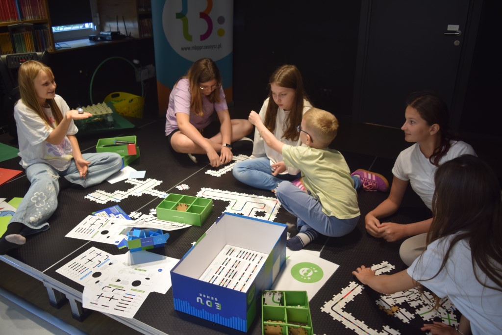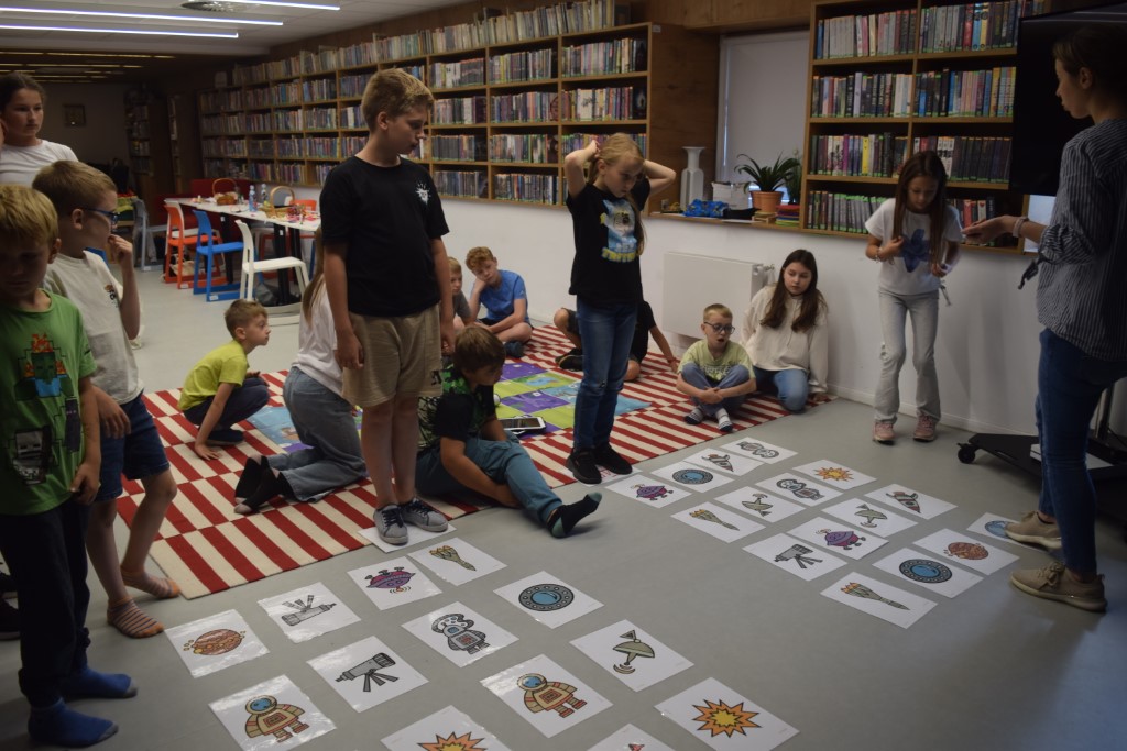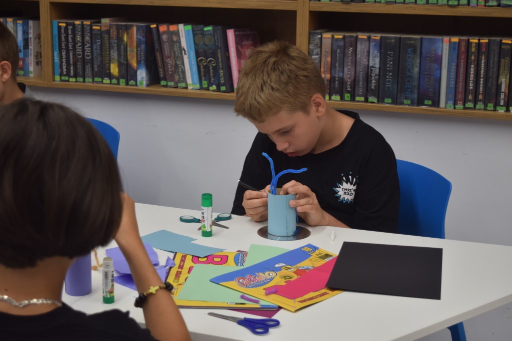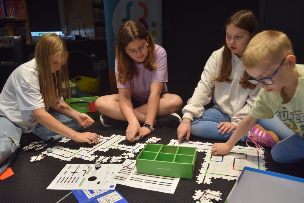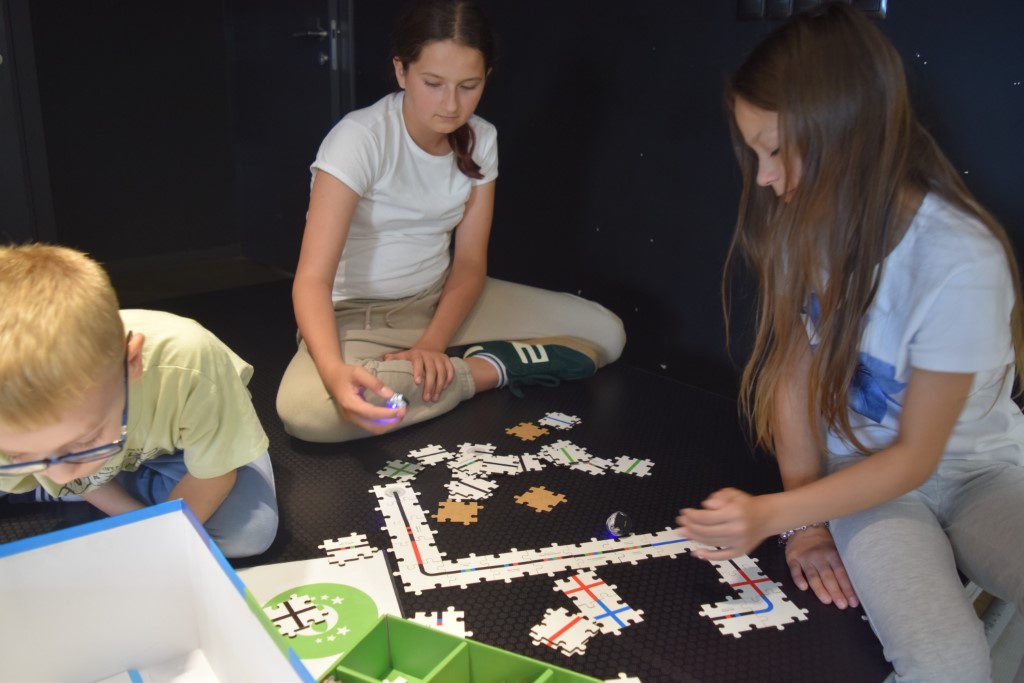 Zajęcia rozpoczęliśmy od zabaw ruchowych. Następnie dzieci rozwiązywały quiz o kosmosie, który był podsumowaniem poznanej wiedzy. Następnie wykonali pracę plastyczną, kosmitów z rolek po papierze toaletowym. W części głównej dzieci poznały nasze biblioteczne roboty: Photona i Ozobota. Photon jest to polski robot edukacyjny, którego zadaniem jest wprowadzenie użytkowników w świat nowych technologii. Dzieci miały za zadanie zaprogramować roboty w ten sposób, aby przejechały po wyznaczonej drodze. Natomiast Ozoboty odpowiednio zakodowane poruszały się po wytyczonej trasie z puzzli, którą dzieci wcześniej sami projektowali.