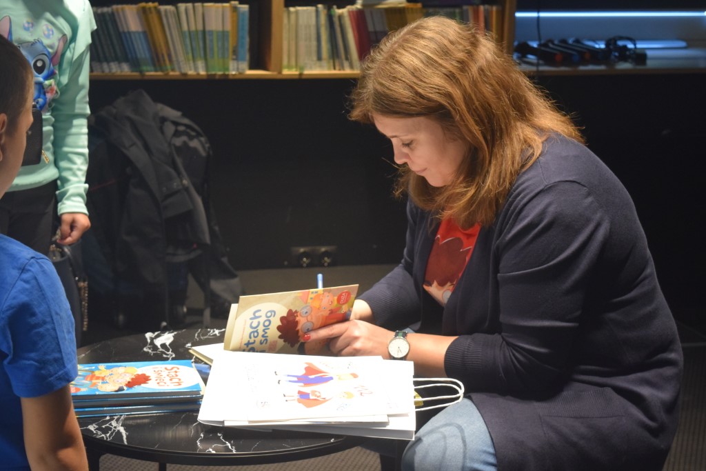 Pani Monika w ciekawy sposób zapoznała dzieci z bohaterami swojej książki i przeczytała fragment książki. W dalszej kolejności poruszyła z dziećmi temat ekologii i wpływu zanieczyszczenia powietrza na zdrowie człowieka. Uczniowie dowiedzieli się również, dlaczego warto segregować odpady i co grozi za wyrzucanie ich do lasu.