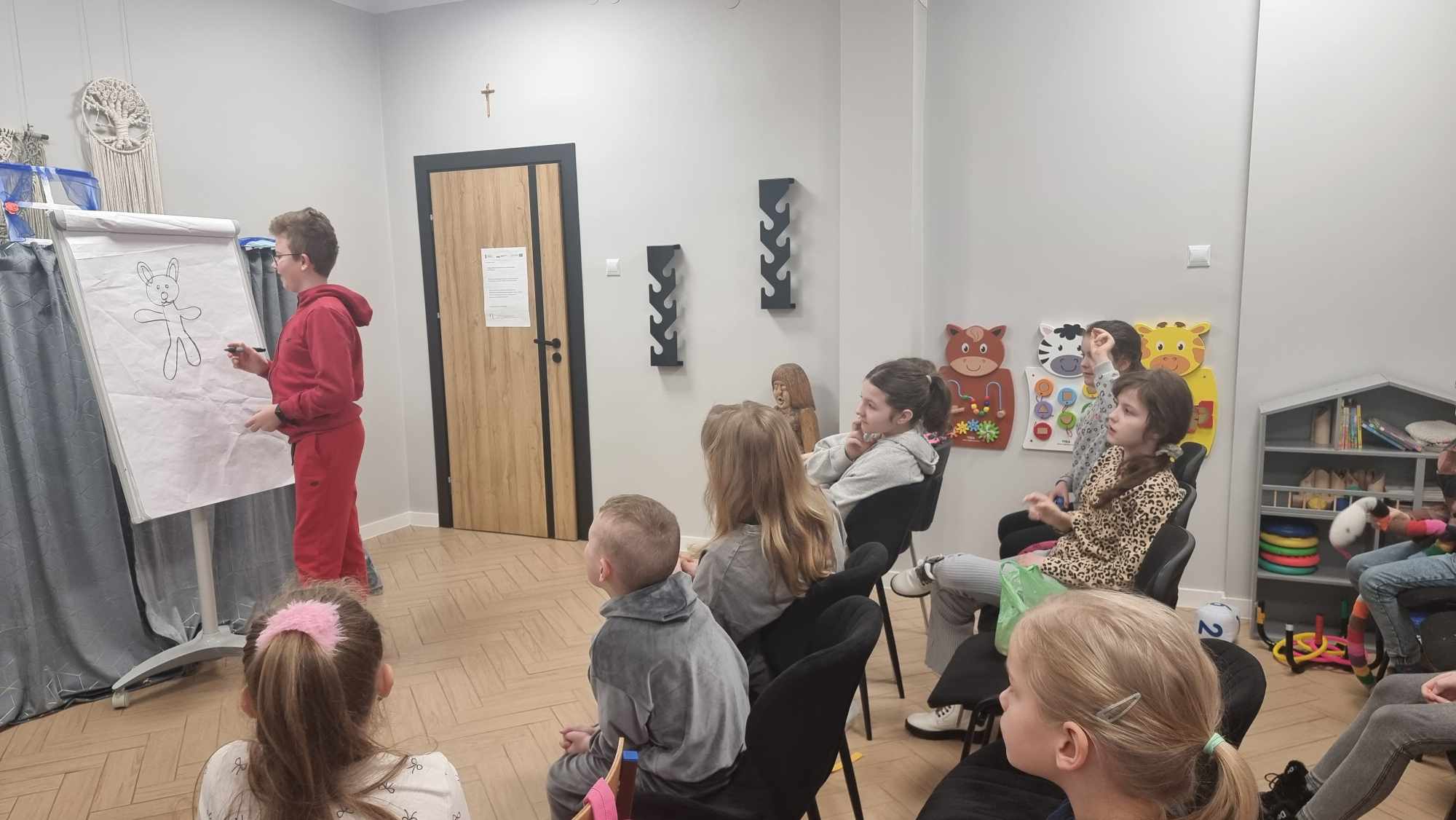 Nie zabrakło również ruchu i śmiechu! Dzieci wzięły udział w grze w kalambury, odgadując hasła związane z bajkami i bohaterami literackimi. Na zakończenie zajęć każdy mógł stworzyć własnego misia z miękkiej gąbki. To była świetna okazja do rozwijania zdolności manualnych i kreatywności. Na wszystkich uczestników czekała także miła niespodzianka! Jedna z Pań z Klubu Rękodzieła przygotowała pyszny słodki poczęstunek, który umilił wszystkim czas wspólnej zabawy. Zajęcia dostarczyły dzieciom mnóstwo radości, a biblioteka wypełniła się śmiechem i dobrą zabawą. Dziękujemy wszystkim uczestnikom oraz niezastąpionym członkiniom Klubu Rękodzieła Biblioteka pod Szpileczką za ich zaangażowanie i wsparcie! Zapraszamy na kolejne biblioteczne przygody!