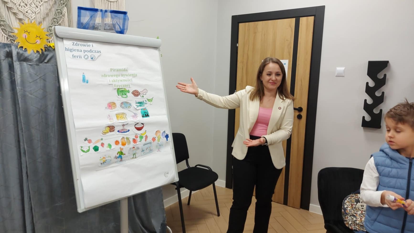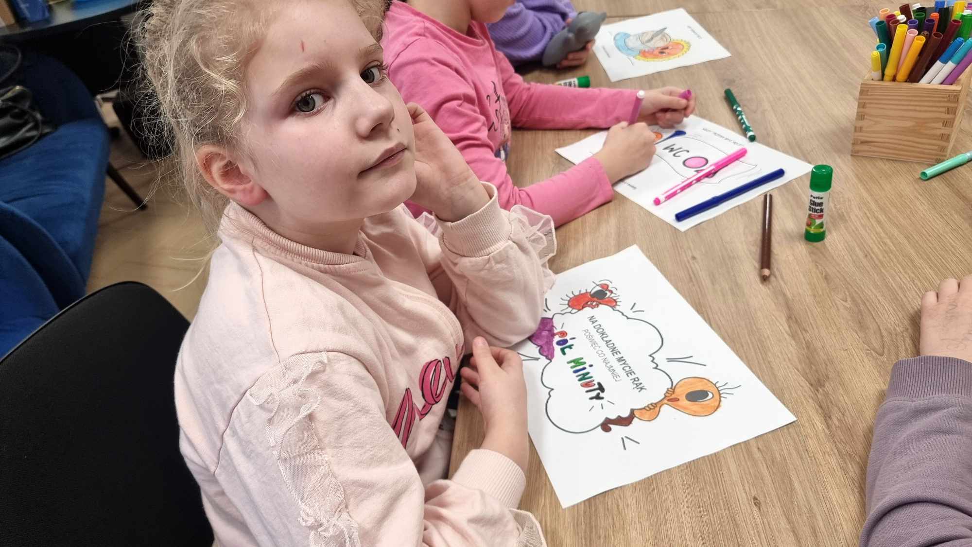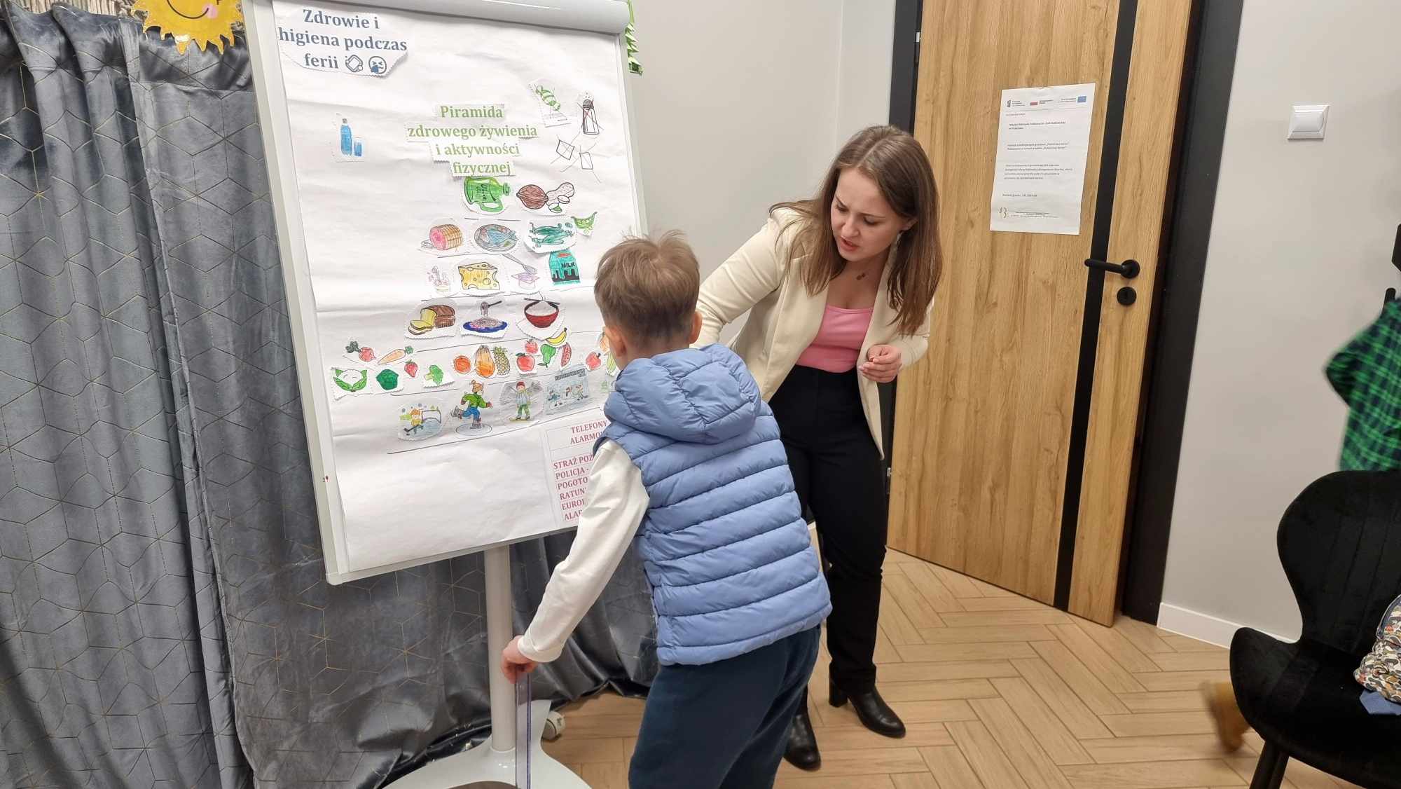 Kolejny dzień ferii w bibliotece był pełen ciekawych zajęć i wartościowej edukacji. Dzieci miały okazję spotkać się z Panią Martą Pęczkowską z Powiatowej Stacji Sanitarno-Epidemiologicznej, która w przystępny i angażujący sposób opowiedziała im o prawidłowym myciu rąk oraz higienie jamy ustnej. Dzięki praktycznym wskazówkom i pokazom najmłodsi dowiedzieli się, jak dbać o zdrowie i unikać chorób.Kolejną atrakcją było wspólne tworzenie piramidy żywienia. Dzieci aktywnie uczestniczyły w układaniu poszczególnych grup produktów spożywczych, ucząc się, które z nich powinny stanowić podstawę codziennej diety, a które warto spożywać z umiarem. Zabawa ta nie tylko uświadomiła im zasady zdrowego odżywiania, ale także pobudziła ich kreatywność i umiejętność pracy w grupie.