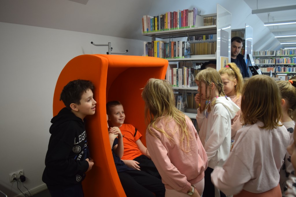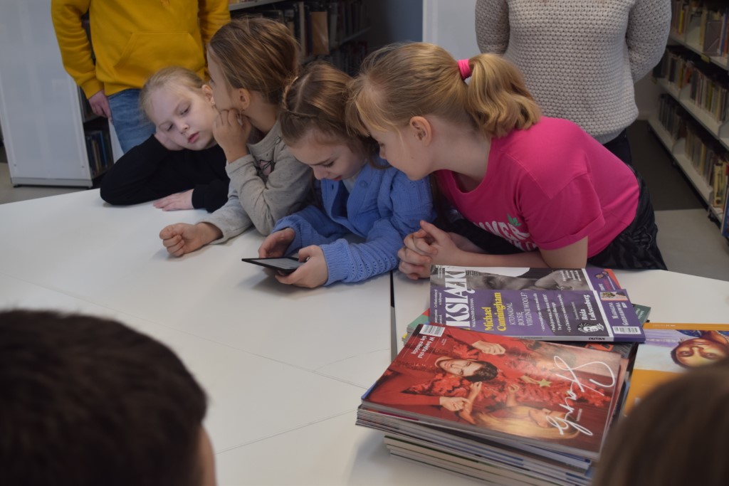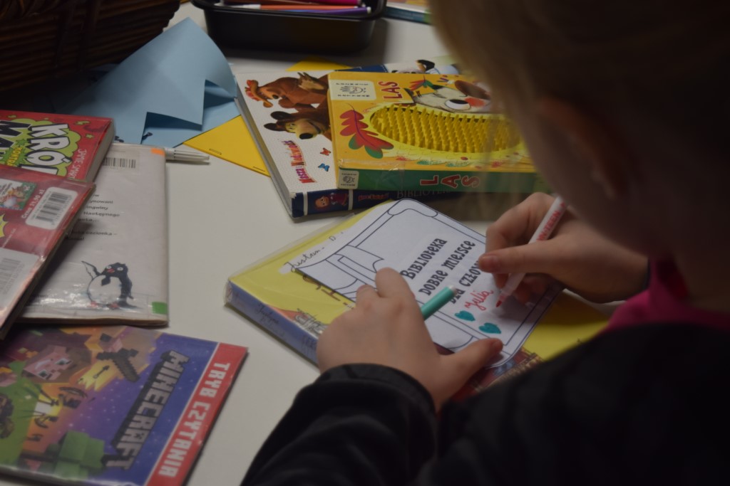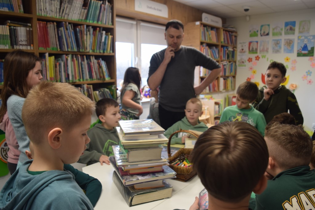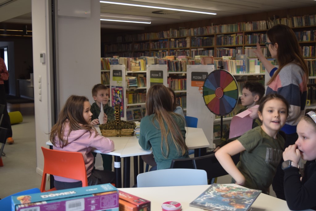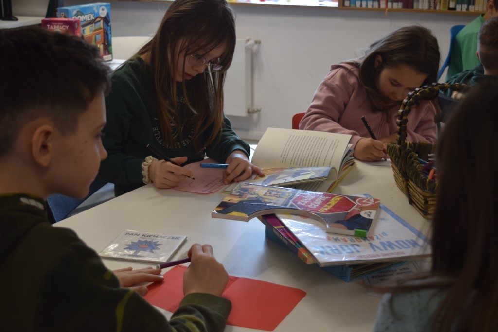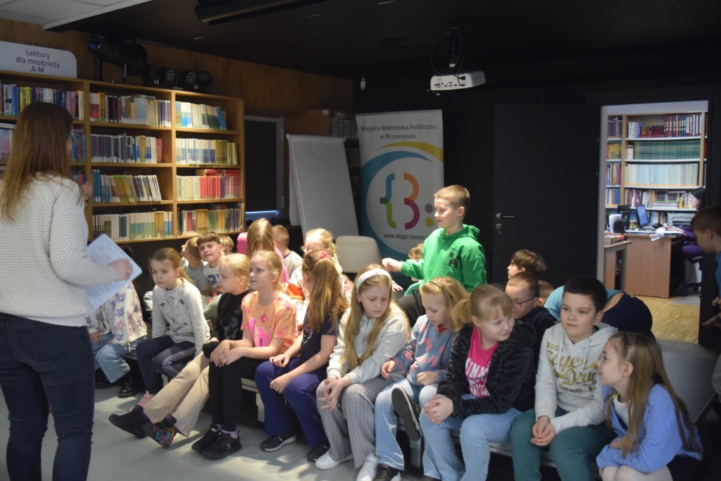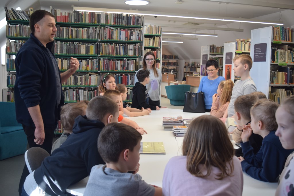 W ubiegłym tygodniu naszą bibliotekę odwiedziły trzy klasy drugie ze Szkoły Podstawowej nr 1 z Oddziałami Integracyjnymi w Przasnyszu. Tematem zajęć był zawód bibliotekarza. Spotkanie rozpoczęliśmy od zwiedzania biblioteki, ponieważ część uczniów była u nas pierwszy raz. Dzieci dowiedziały się, co zrobić, żeby zostać czytelnikiem, w jaki sposób wypożycza się książki oraz jak należy o nie dbać. Zapoznały się z etapami, przez jakie przechodzi książka, zanim trafi na wypożyczalnię. Ponad to chętnie opowiadały o swoich ulubionych książkach. Wzięły udział w quizie na temat wiosny. Zapoznały się z takimi terminami jak: czytnik, czytak, manga, literatura popularnonaukowa. Na koniec spotkania wykonały pracę plastyczną, zaprojektowały własne książeczki.