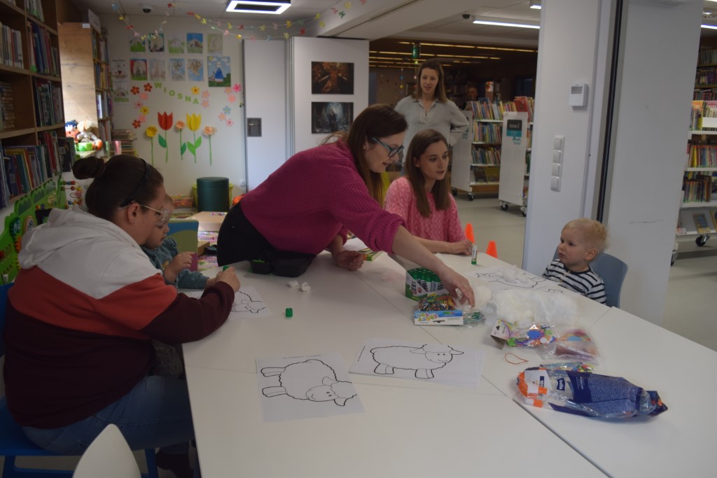 16 kwietnia odbyły się kolejne zajęcia z cyklu "Biblioteka dla Smyka". Tematem zajęć były zbliżające się Święta Wielkanocne. Dzieci w tym dniu uczestniczyły w wielu zabawach o wielkanocnej tematyce. Na początku szukały kolorowych piłek, które pochowane były w różnych miejscach naszej biblioteki. Następnie wspólnie ozdabiały ogromną wielkanocną pisankę. Wykonały z pomocą mam pracę plastyczną , wyklejały watą świątecznego baranka..
