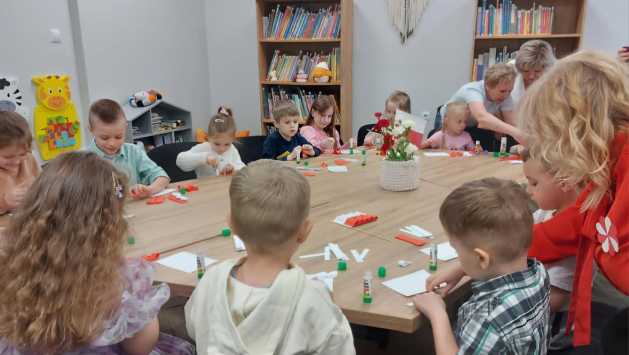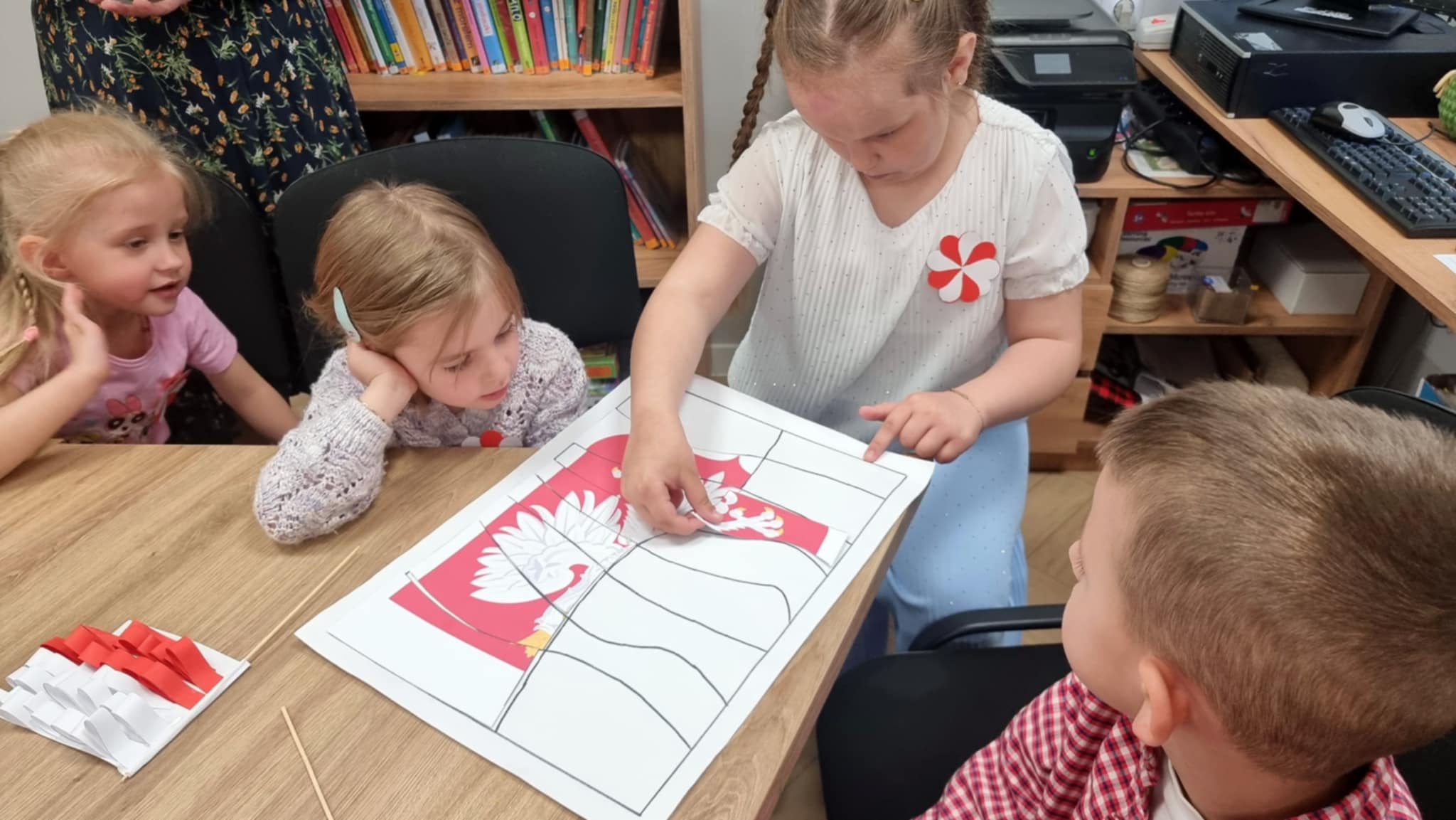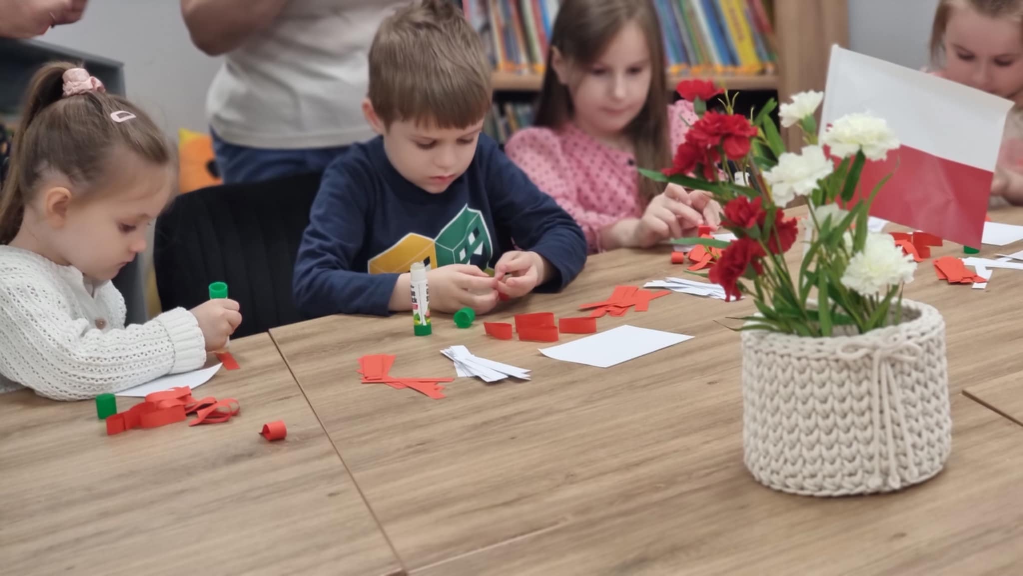 Z okazji Dnia Flagi dzieci z Niepublicznego Przedszkola "Zaczarowany Zakątek" uczestniczyły w wyjątkowych zajęciach patriotycznych, które odbyły się w Filii nr 1 Miejskiej Biblioteki Publicznej. Spotkanie miało na celu przybliżenie najmłodszym symboli narodowych oraz kształtowanie postaw patriotycznych. Przedszkolaki z entuzjazmem wykonywały biało-czerwone flagi, poznając przy tym znaczenie barw narodowych. Z dumą recytowały wiersz Władysława Bełzy "Kto ty jesteś? – Polak mały", który w prosty sposób ukazuje ważne wartości i tożsamość narodową. Dzieci chętnie brały udział w odgadywaniu zagadek o tematyce patriotycznej oraz wspólnie układały puzzle przedstawiające godło Polski, co było okazją do rozmowy o jego symbolice. Zajęcia przebiegły w radosnej, a zarazem uroczystej atmosferze. Dzięki takim inicjatywom najmłodsi uczą się szacunku do ojczyzny oraz budują swoją tożsamość narodową już od najmłodszych lat. Serdecznie dziękujemy wszystkim uczestnikom warsztatów za zaangażowanie, uśmiech i wspólnie spędzony, wartościowy czas.