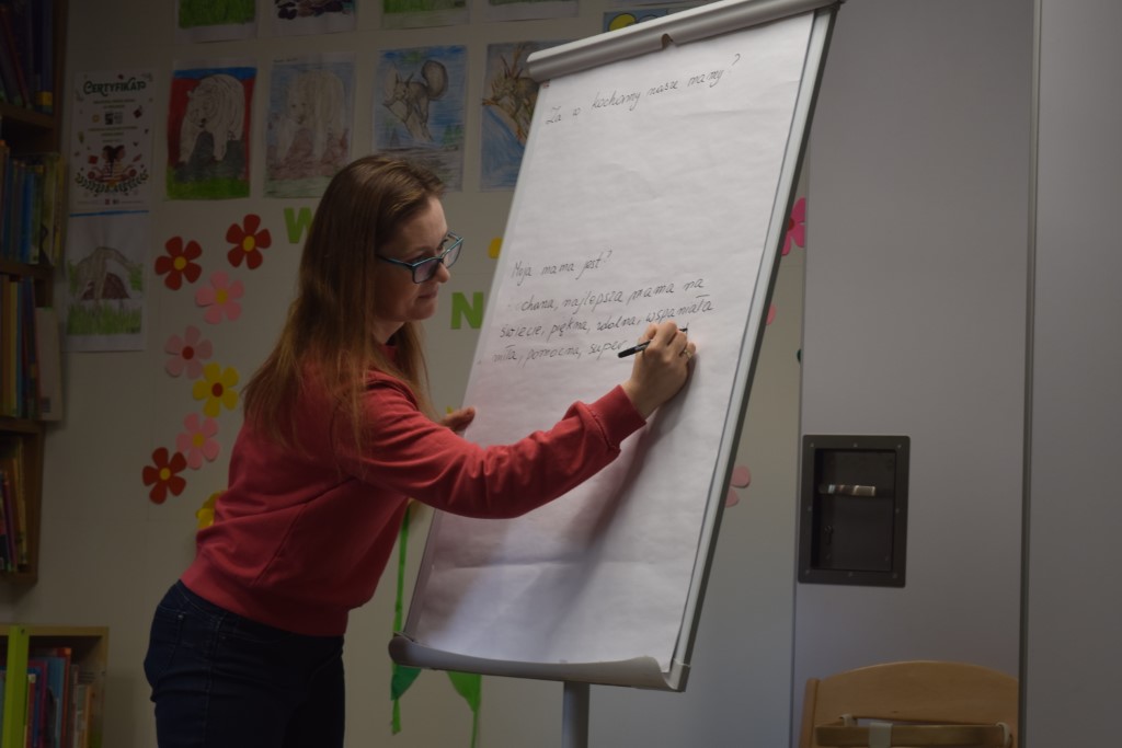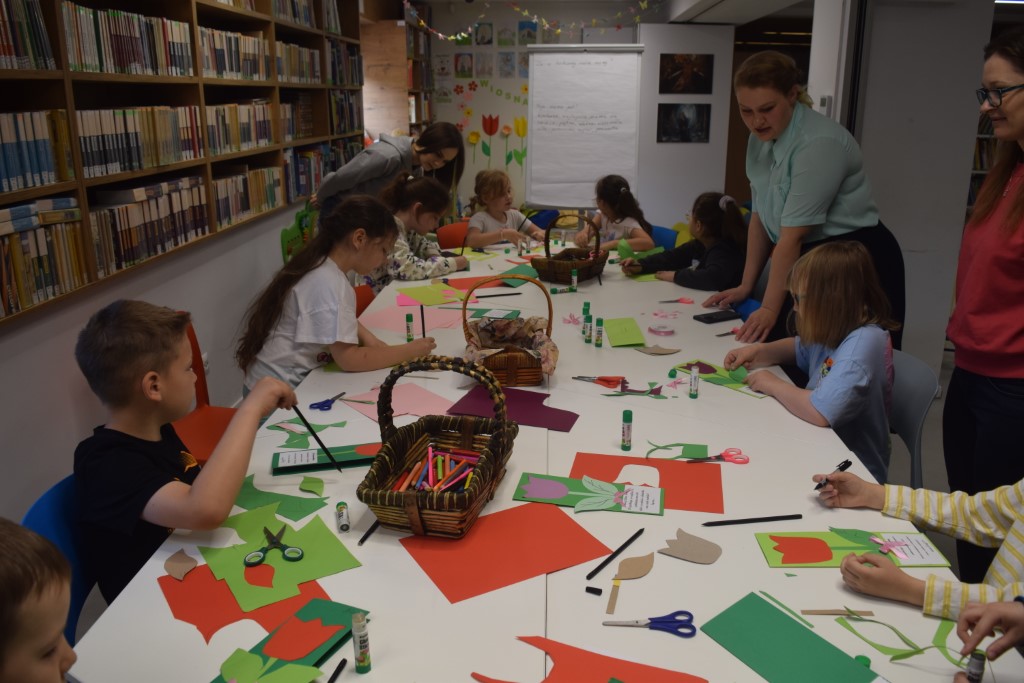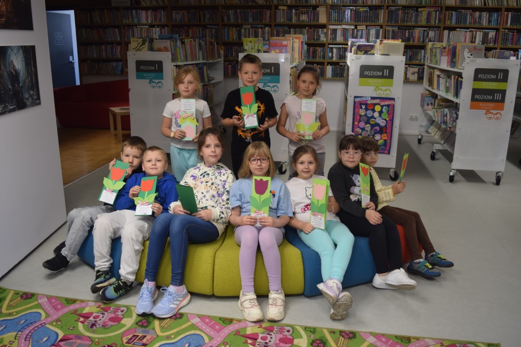 W naszej bibliotece odbyły się wyjątkowe zajęcia z okazji nadchodzącego Dnia Mamy. Spotkanie rozpoczęliśmy pogadanką, podczas której rozmawialiśmy o tym, za co kochamy nasze mamy. Dzieci z dużym zaangażowaniem opowiadały o swoich mamusiach, dzieląc się ciepłymi i wzruszającymi wypowiedziami. Każde dziecko kończyło zdanie: "Moja mama jest...", co zaowocowało pięknymi słowami, takimi jak: „miła”, „cudowna”, „super”, „najlepsza”.