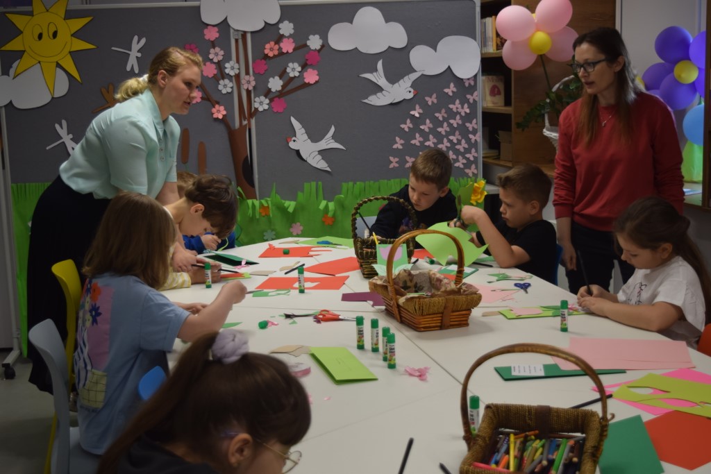 W części plastycznej dzieci wykonały laurki dla swoich mam, używając kredek, wstążek i kolorowych papierów. Każda praca była pełna serca i kreatywności – nie brakowało również czułych słów.