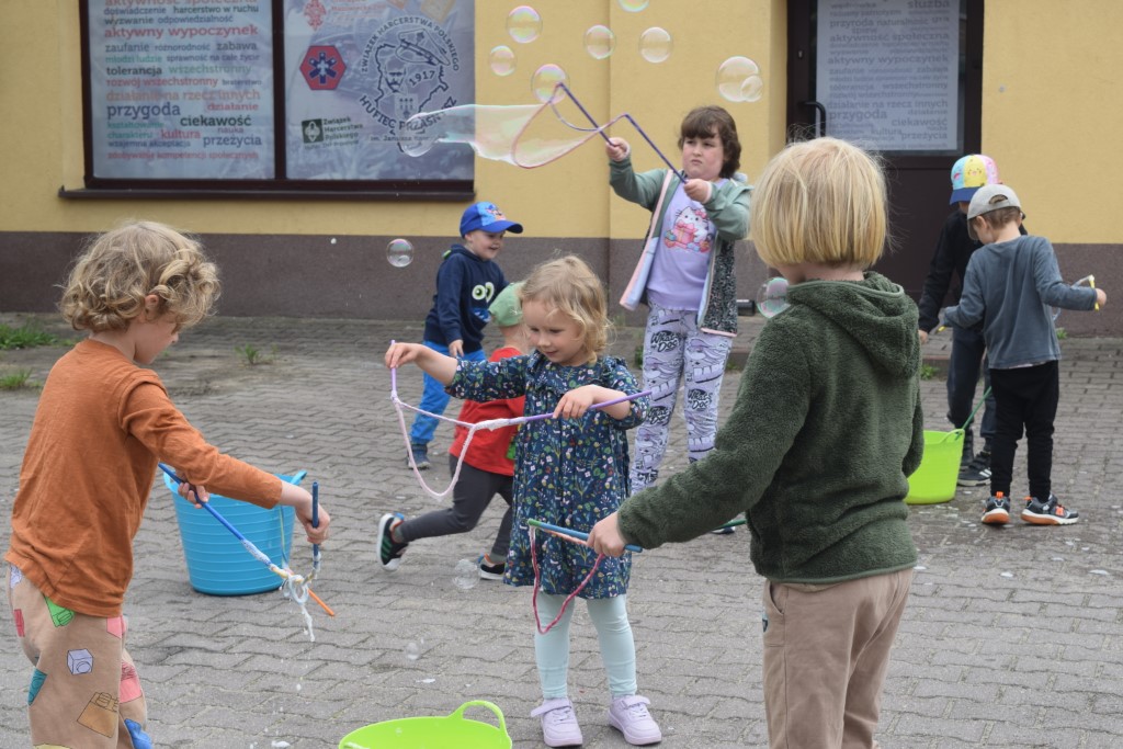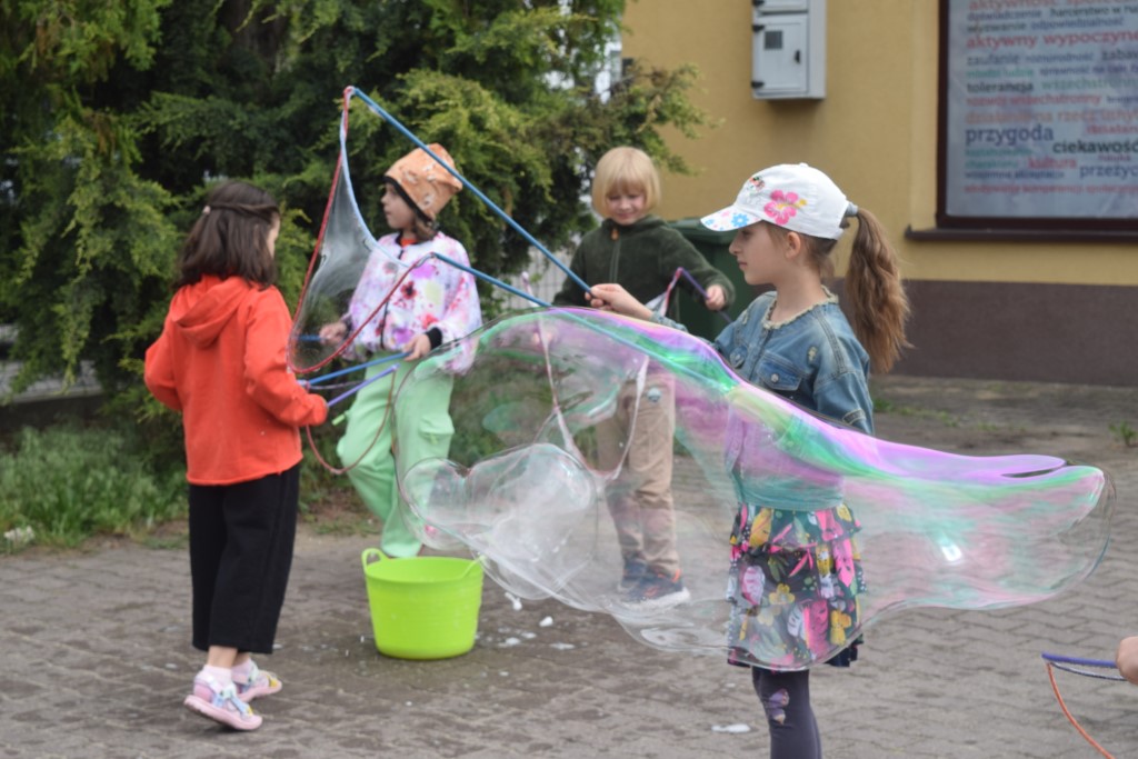 Po pokazie dzieci same mogły spróbować swoich sił w tworzeniu wielkich baniek – z pomocą specjalnych sznurków i płynu powstawały bańki większe niż ich twórcy! Zabawa nie miała końca, a twarze uczestników rozświetlały się z każdą kolejną udaną bańką.