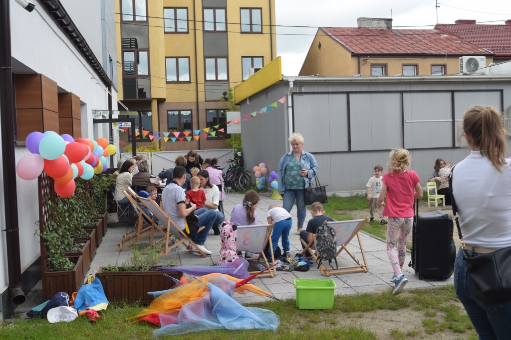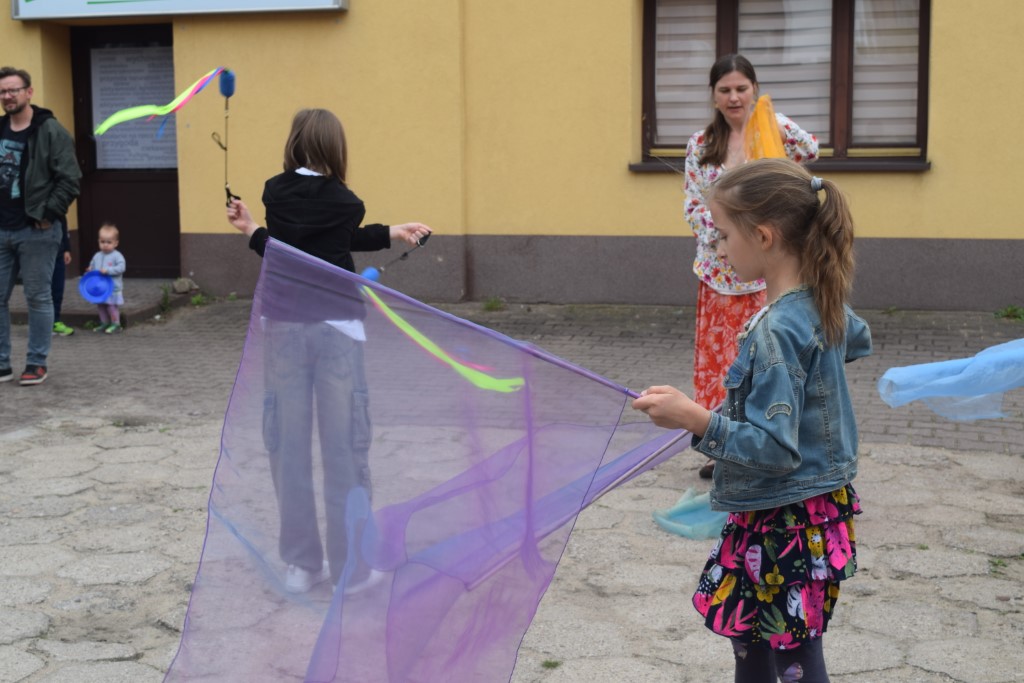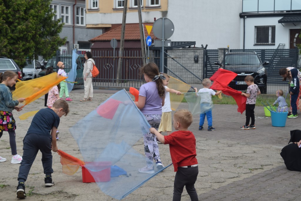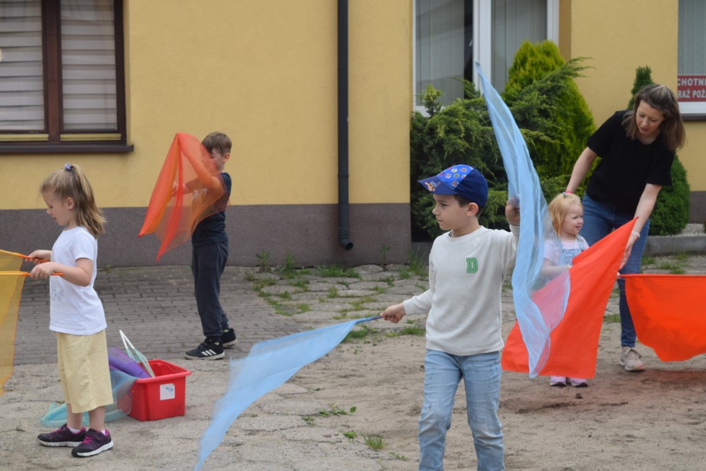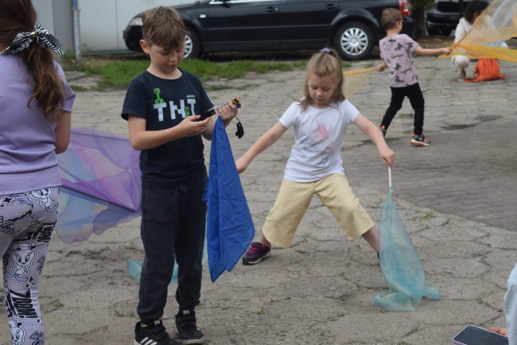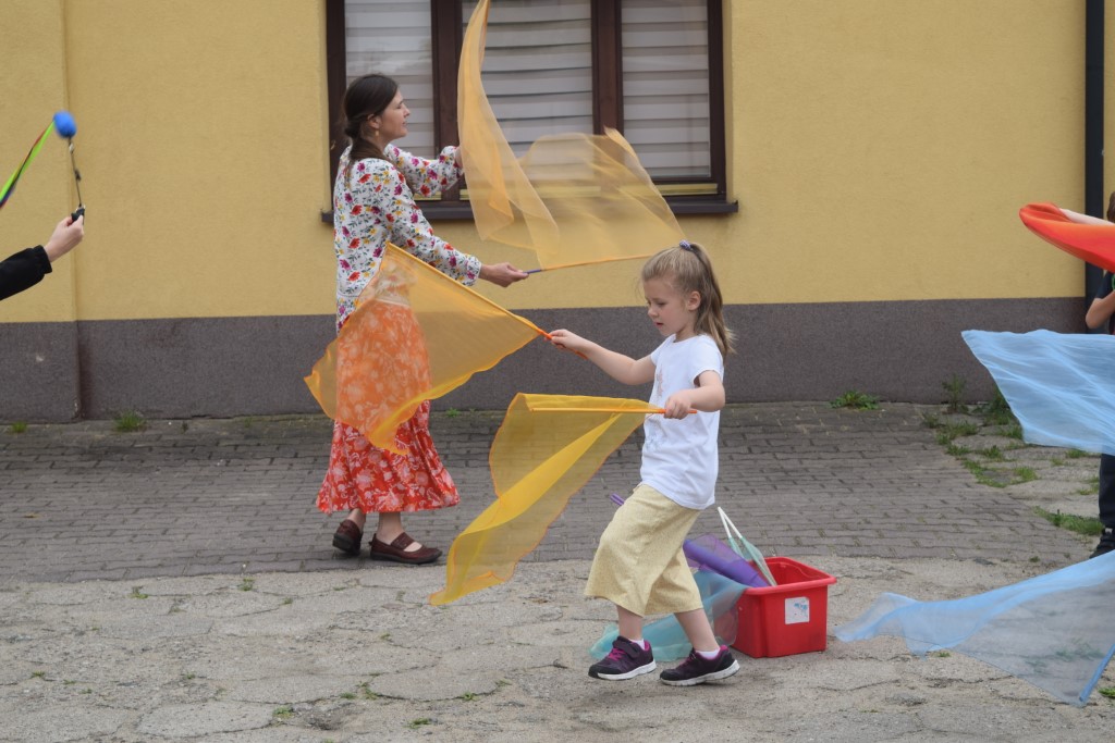Kiedy emocje nieco opadły, przyszedł czas na kolejną atrakcję – taniec z piłkami poi oraz kolorowymi chorągiewkami. Dzieci wirowały, machały i podskakiwały w rytm muzyki, tworząc barwne wiry i radosne kompozycje ruchu. To była nie tylko świetna zabawa, ale i doskonała okazja do wyrażenia siebie poprzez taniec i ruch. Po zabawach zaprosiliśmy dzieci na mały poczęstunek, podczas którego dzieci miały okazję odpocząć jak również pobawić się podczas zabaw dowolnych. Na koniec każde dziecko otrzymało upominek z okazji Dnia Dziecka.